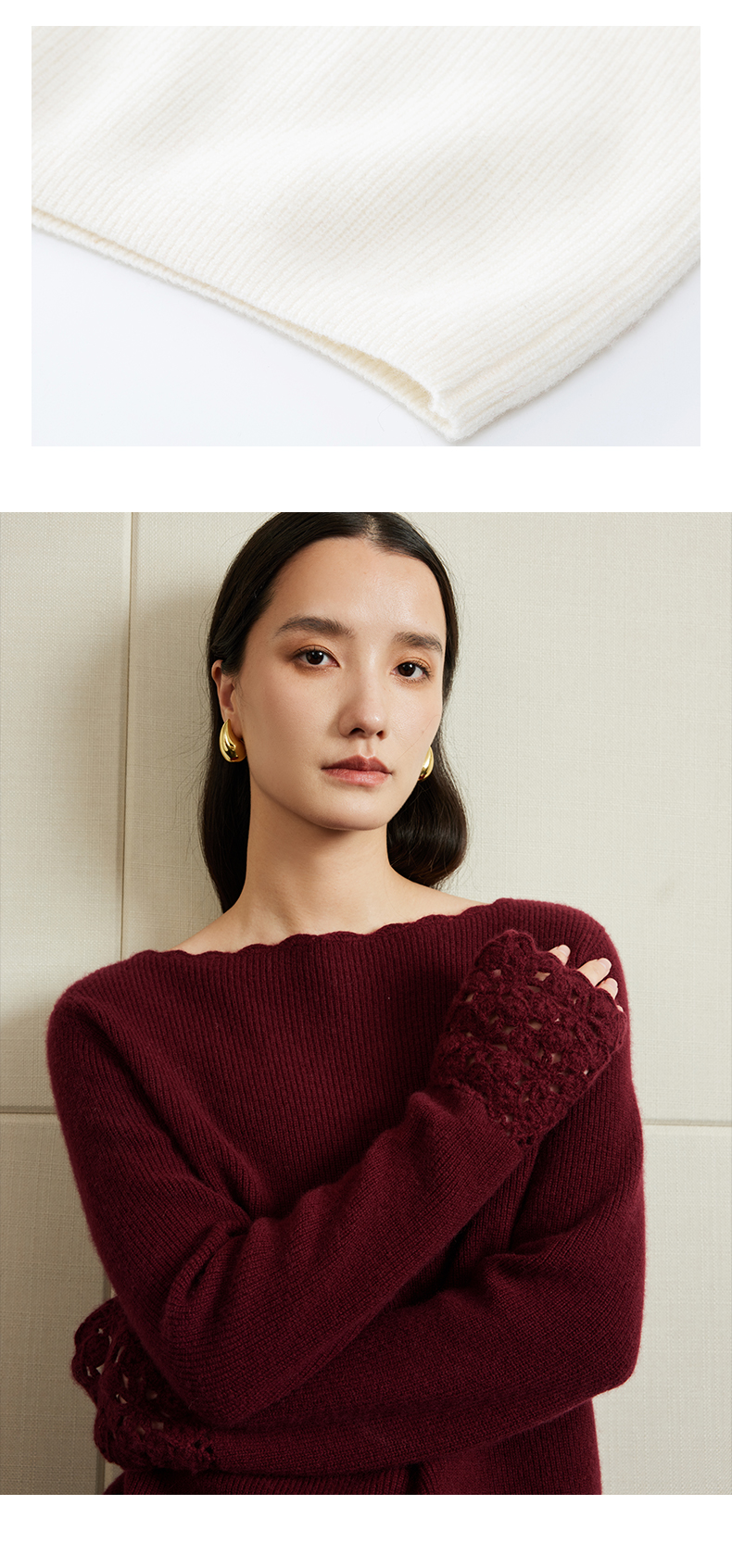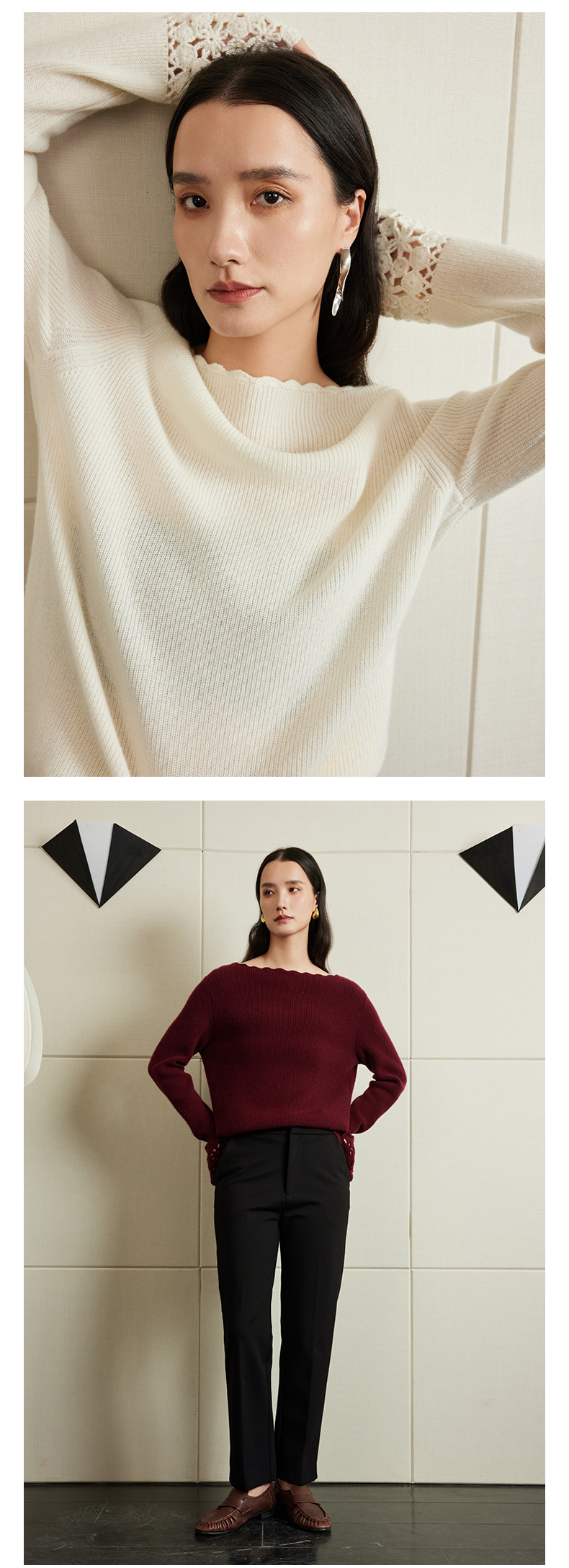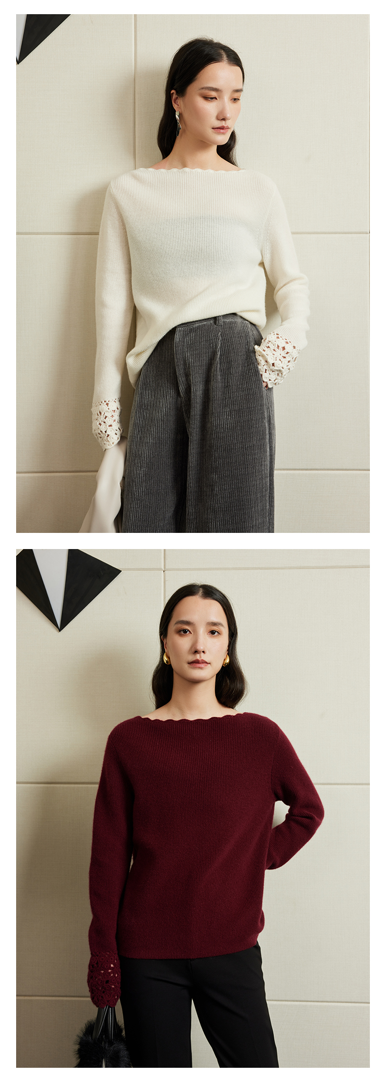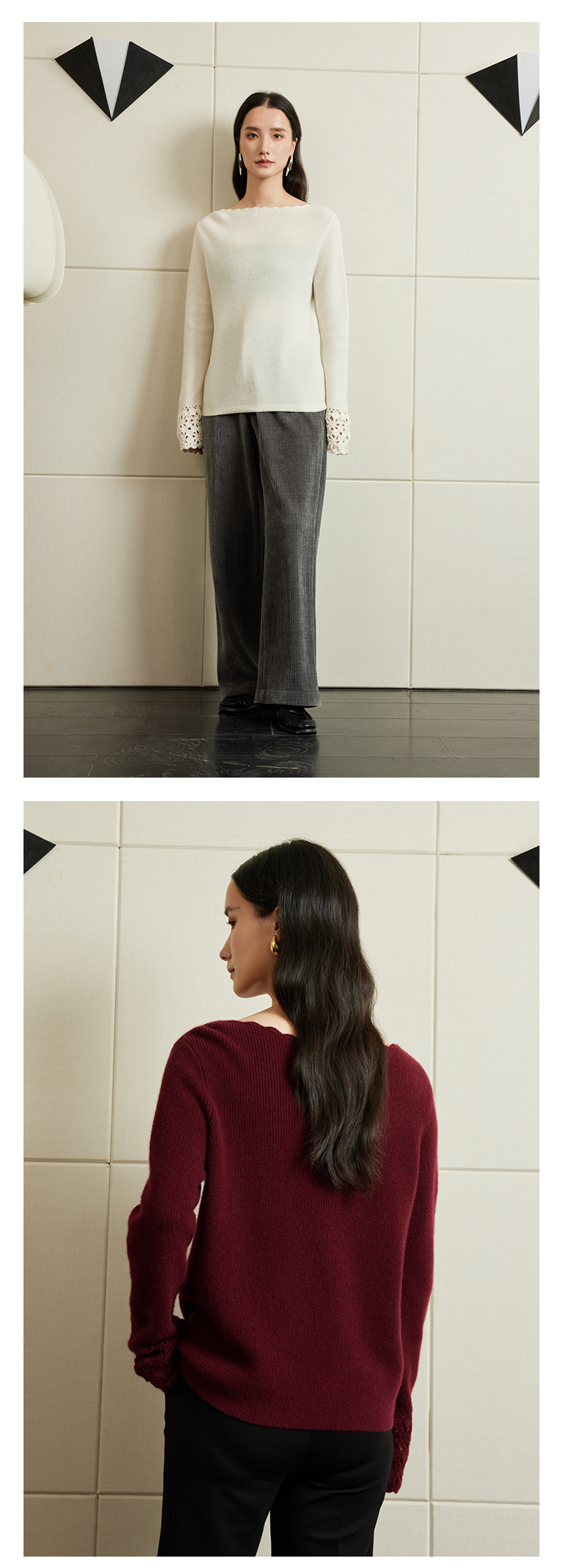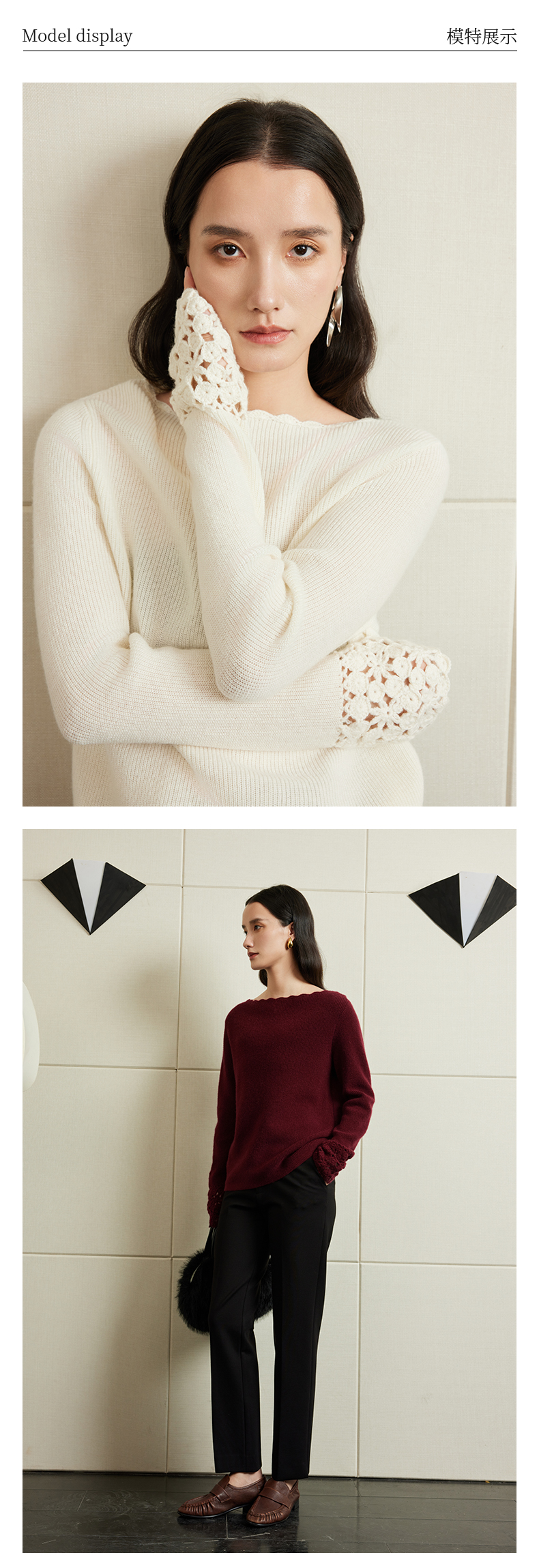 54681 璞宿PUSU 优雅永恒 羊绒绵羊毛浪漫钩花袖口针织上衣