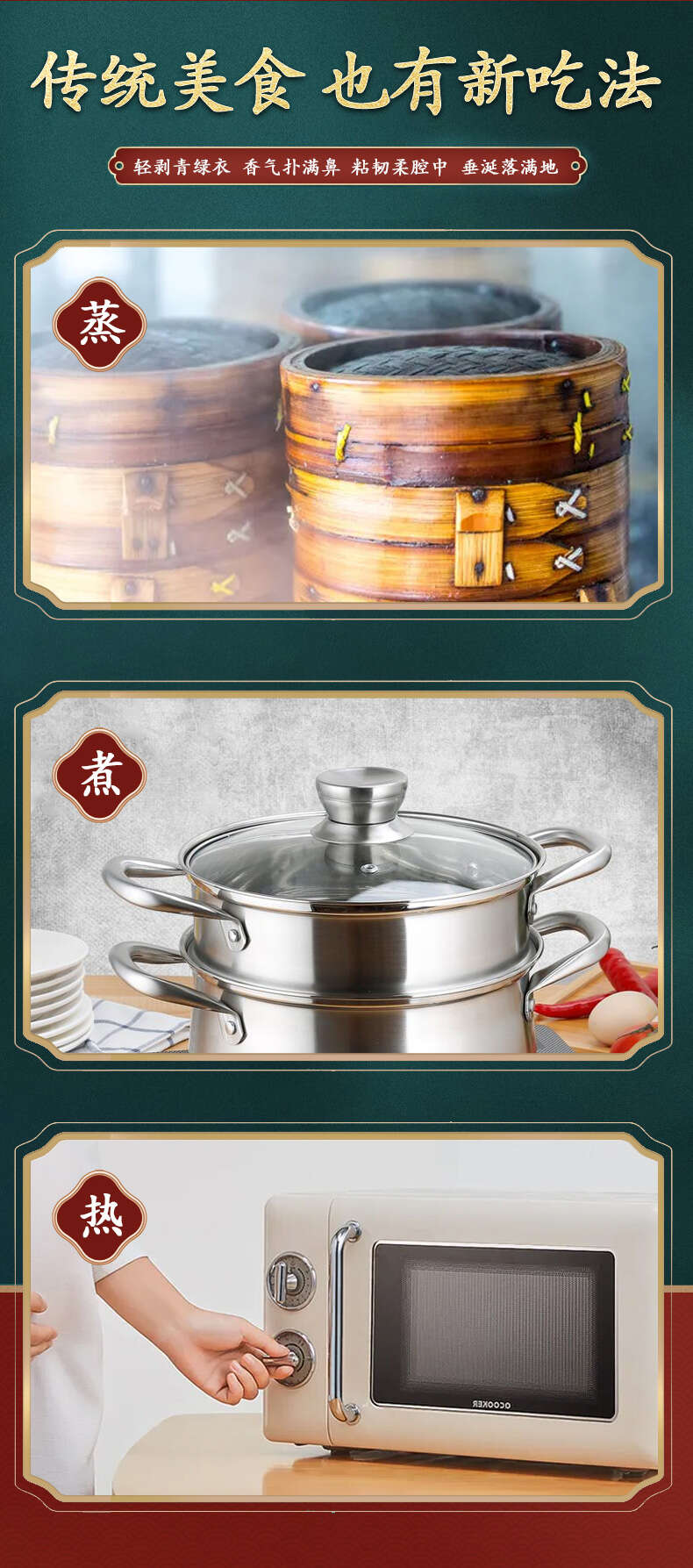 微波:开袋后将粽子置入微波炉专用容器中撒入少量水于粽叶上;中高火加热6-10分钟;取出除去扎线及粽叶后,即可食用。