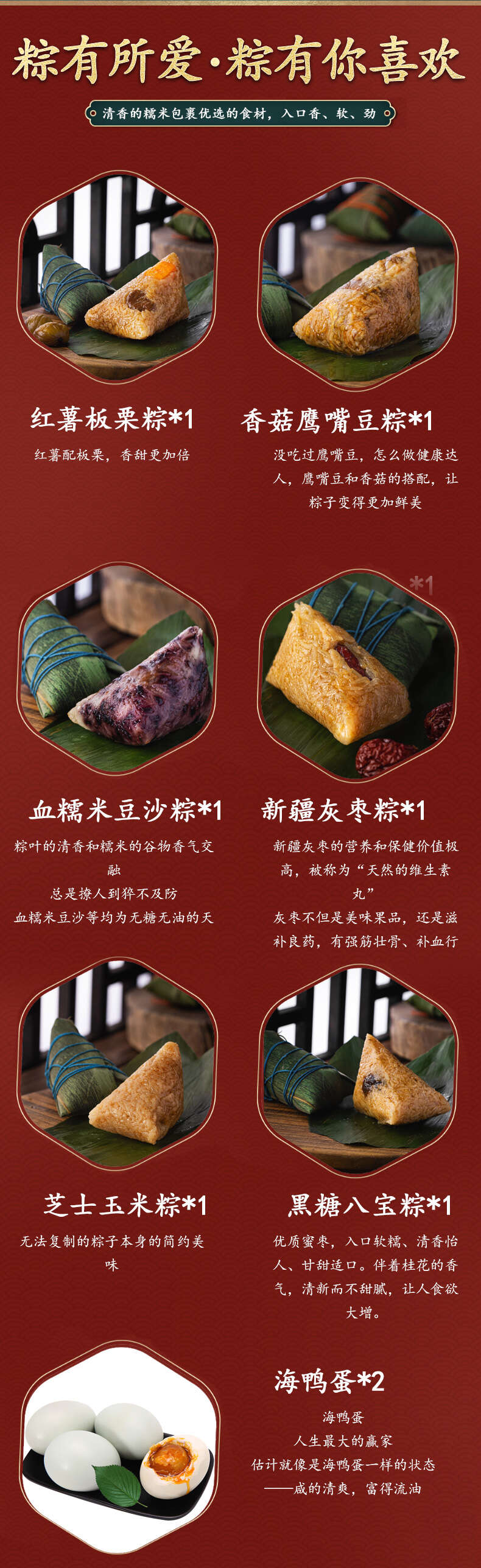 红薯板栗粽1粒/血糯米豆沙粽1粒/新疆灰枣粽1粒/芝士玉米粽1粒/香菇鹰嘴豆粽1粒/黑糖八宝粽/海鸭蛋2颗