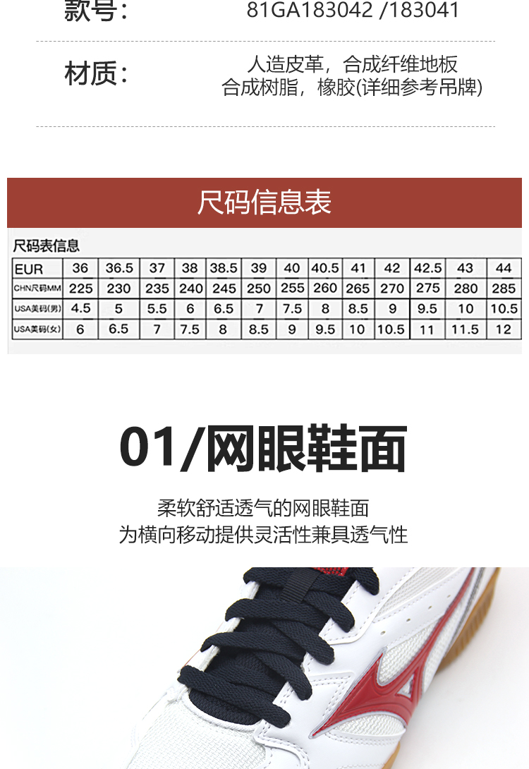 Mizuno美津浓乒乓球鞋81GA183041专业男款女款乒乓球运动鞋 白/红/银色