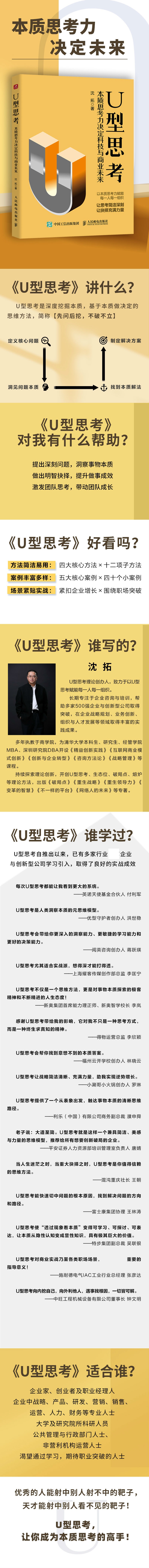 《U型思考:本质思考力决定科技与商业未来》分析为什么要学习U型思考;进而描述了U型思考是什么;接下来重点阐述了如何运用U型思考,为读者提供了具体可操作的步骤与方法,帮助读者切实掌握U型思考方法;之后分享了多个U型思考用于企业发展、个人成长的实战案例,鼓励读者用好U型思考,创作出自己的杰作。《U型思考:本质思考力决定科技与商业未来》适合企业家、创业者与职业经理人阅读,适合从事战略、市场、销售、产品、研发、运营、人力等工作的人员阅读,也适合渴望获得职业生涯突破的人士阅读。