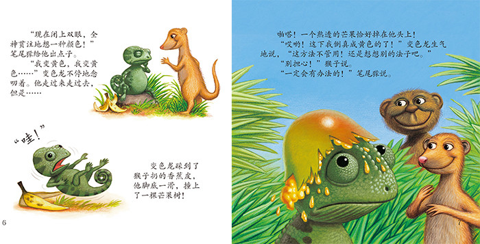 一只变色龙遇上了麻烦,因为他的颜色出了乱子。他趴在黄花上,本该变黄色,却变得红艳艳;跳到石头上,本该变灰色,可却变成了蓝色带粉点儿;走到草丛中,本该变绿色,可却变成了橘黄色……全错了,真是乱七八糟的!猴子和笔尾獴说,别担心,我们来帮忙。嗷呜,那边来了大狮子,变色龙该怎么办?他能成功脱险吗?