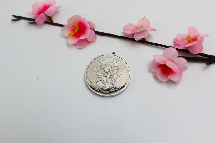| 正面图案 | 正面图案以书法家王安先生行书“和”字作为设计主体元素,刊“遂堂王安”的落款与钤印,结合中国书法纪念币中的金文“中国”、隶书“兴利”、楷书“家”的字样,通过章内的机关联动设置,形式上展示四种极具代表的书法艺术字体,再现书法纪念币中的经典;内涵上讲述以“和”为本,以“和”为贵,抒发“兴利中国”,“兴利家国”的爱国情怀 背景中辅以唐代荷花缠枝纹样,灵动饱满、端庄古朴、寓意深远。在中国吉祥文化中,“和”与荷谐音,自古以来,被誉为“花中君子”的荷花就具有多重美好寓意,如象征高洁清白的精神、象征为官清正的品格、象征连年有余的吉祥、象征和美缠绵的爱情,以及象征采莲怀人的友谊。左上角一只幻彩装饰的蜻蜓飞来,打破了画面中沉静,营造出“小荷才露尖尖角,早有蜻蜓立上头”的美好诗境 |