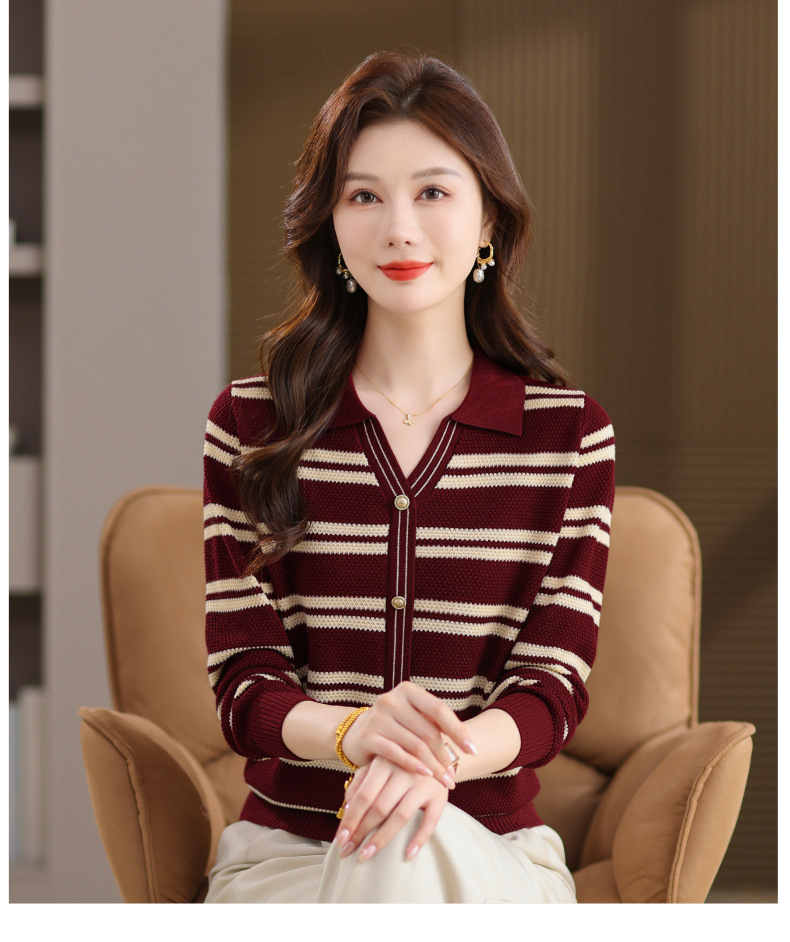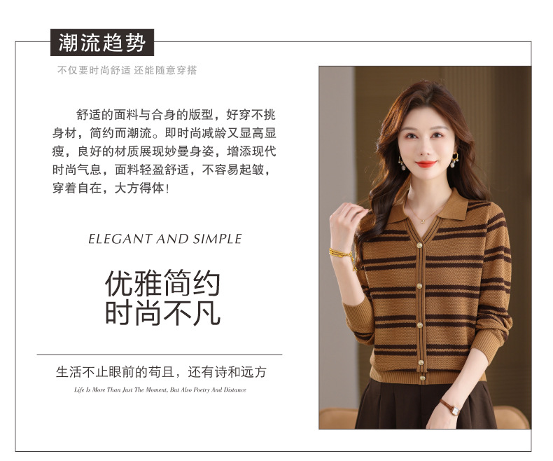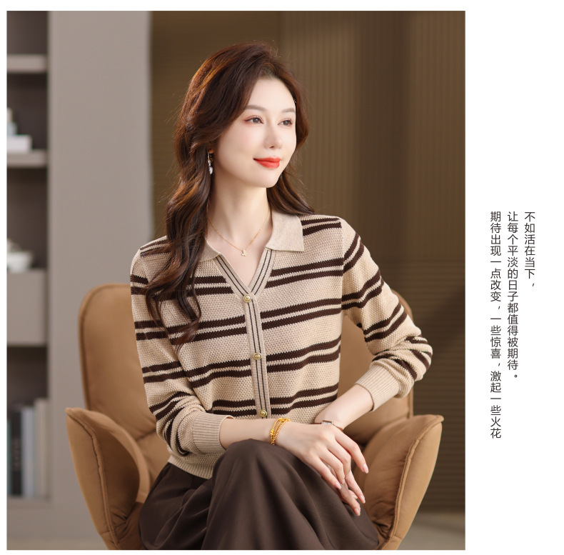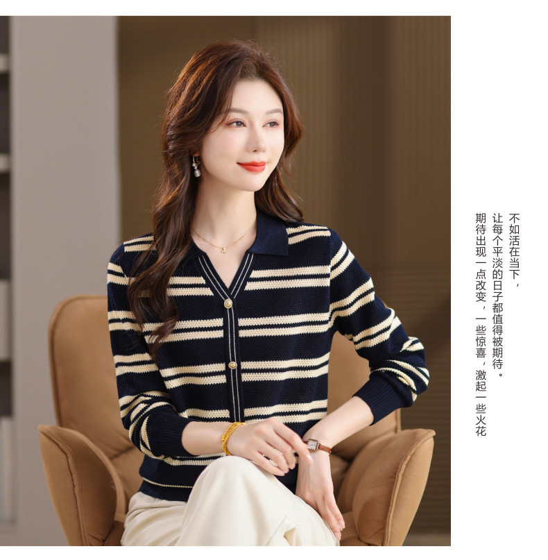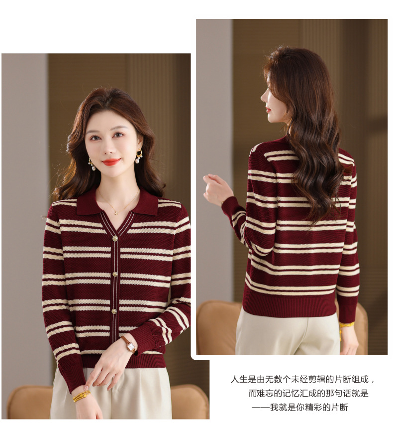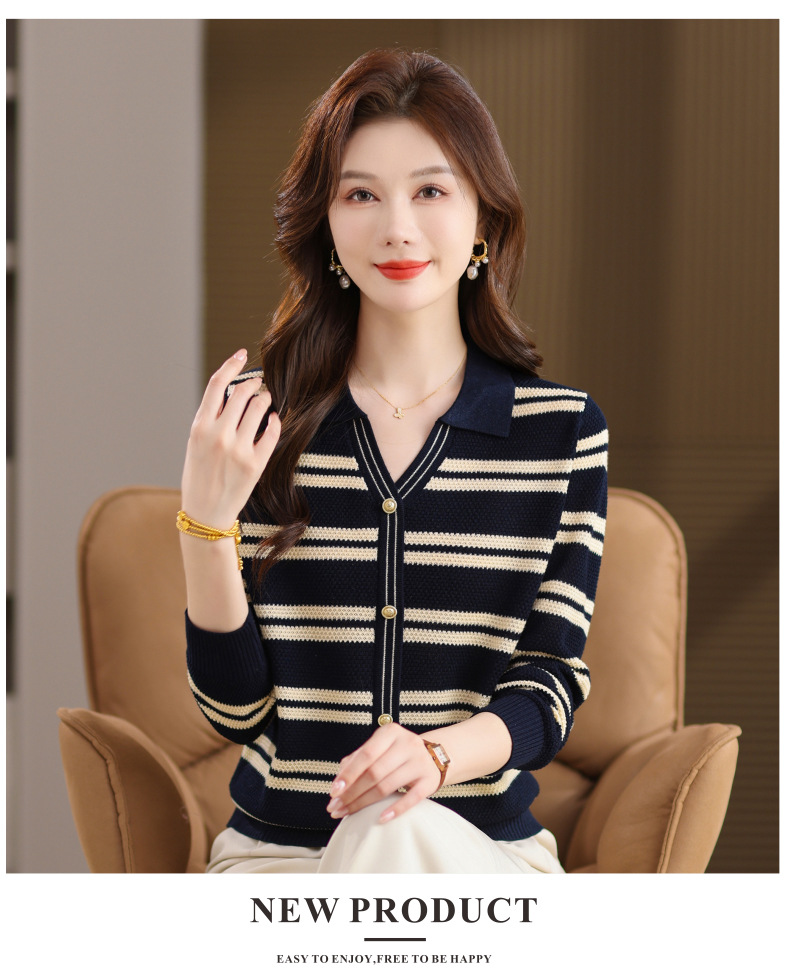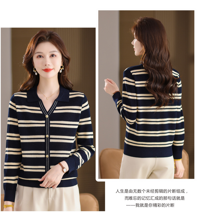 CC103-6398 早秋撞色条纹翻领针织衫女 优雅气质通勤风显瘦短款长袖套头上衣