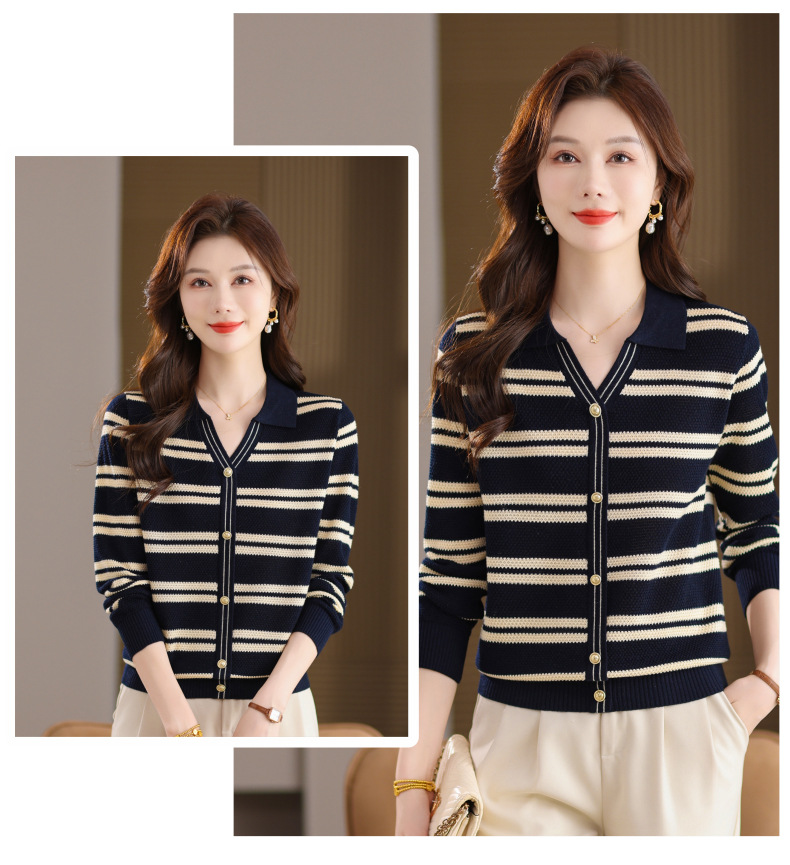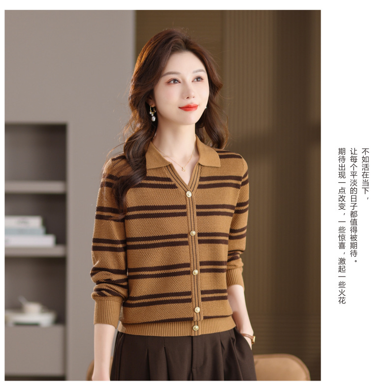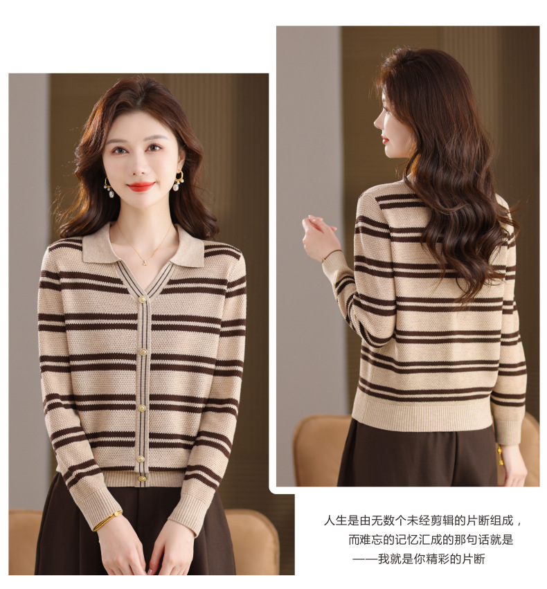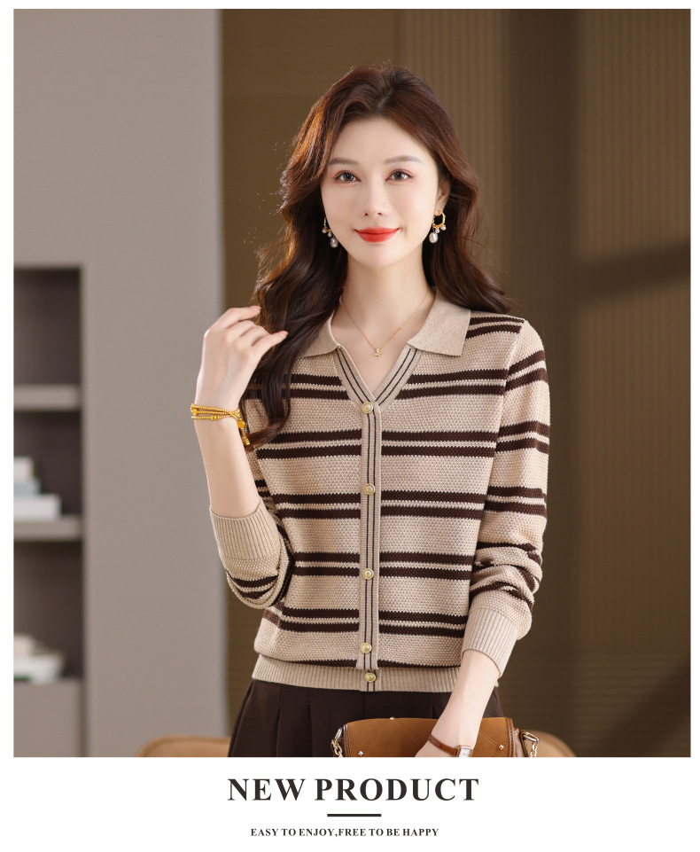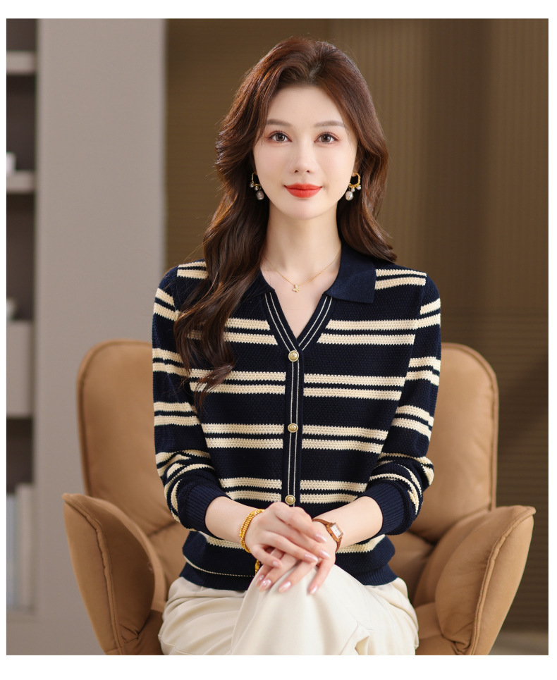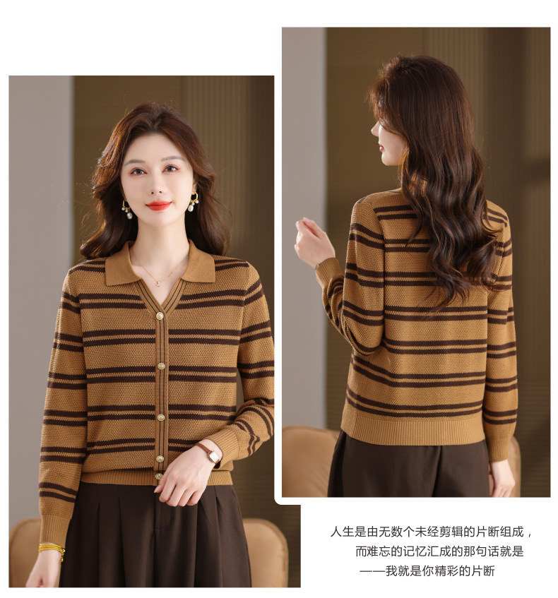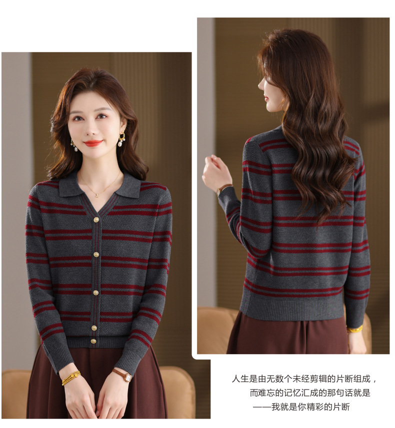 CC103-6398 早秋撞色条纹翻领针织衫女 优雅气质通勤风显瘦短款长袖套头上衣