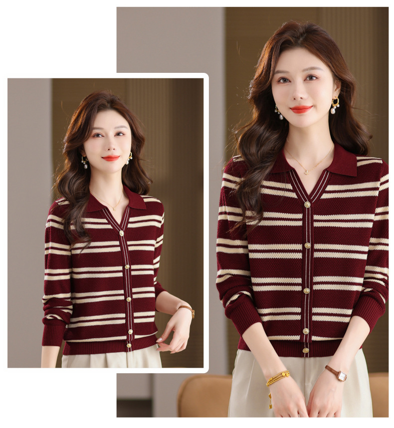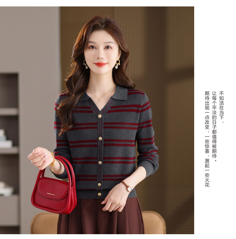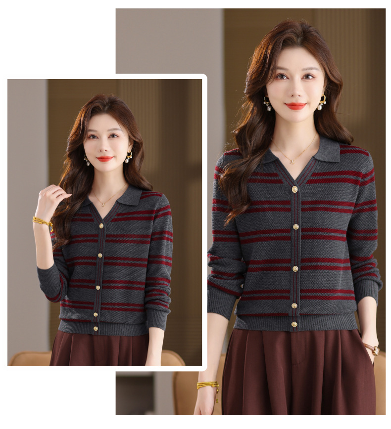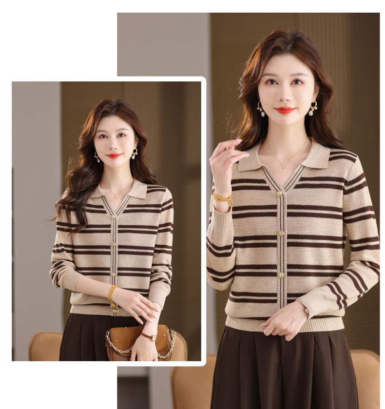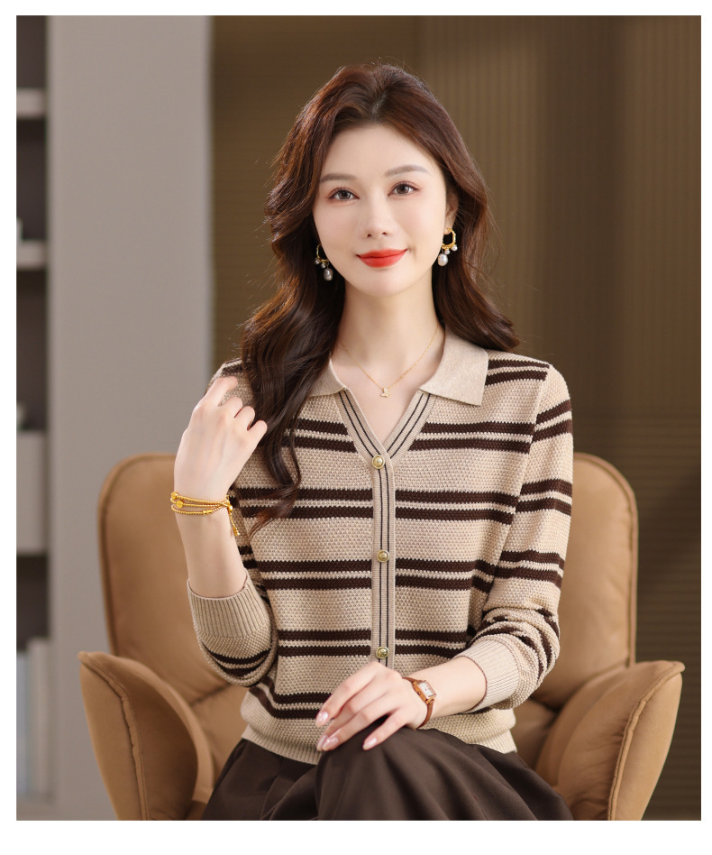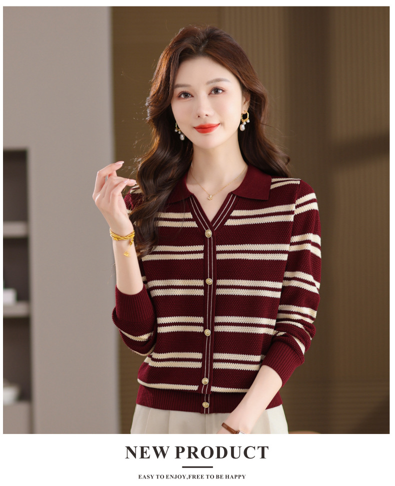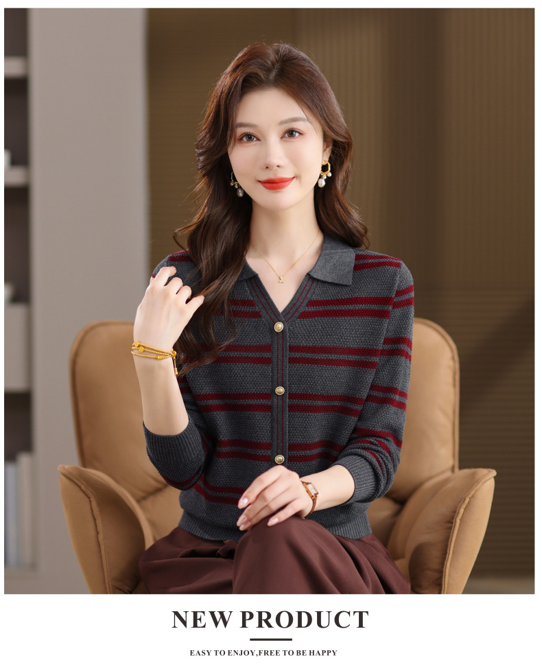 CC103-6398 早秋撞色条纹翻领针织衫女 优雅气质通勤风显瘦短款长袖套头上衣