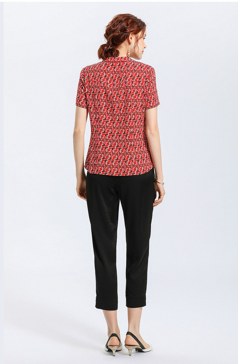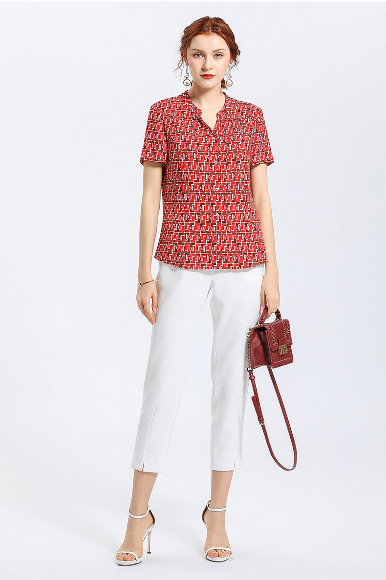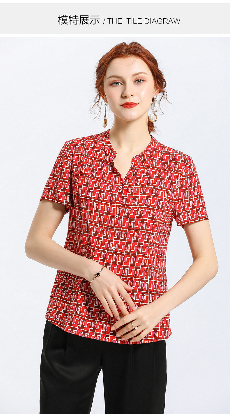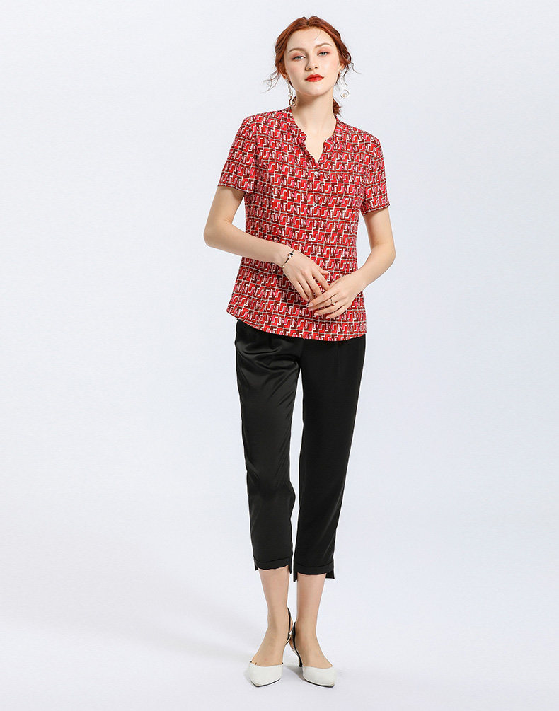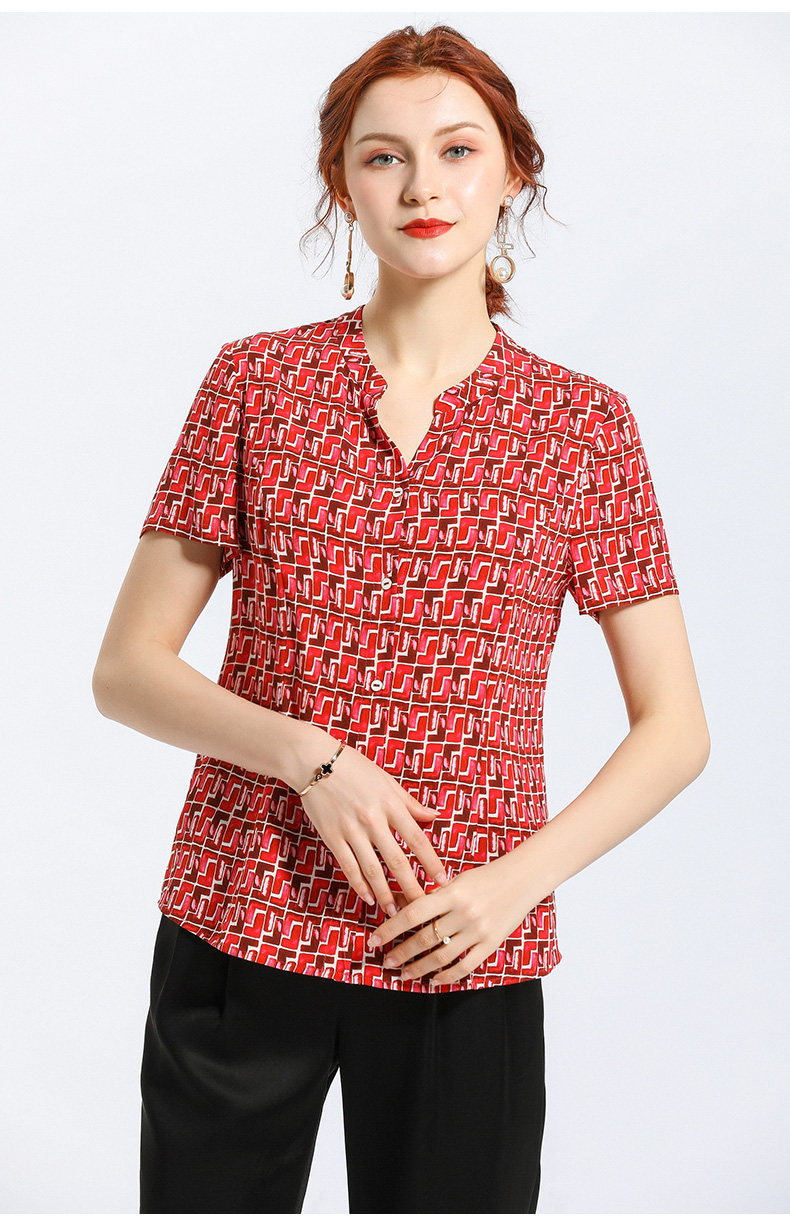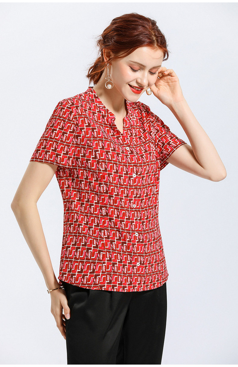 乔万尼夏季短袖宽松V领桑蚕丝衬衫印花真丝上衣女EN2C553