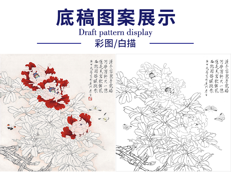 周彦生花鸟工笔画白描底稿《蝴蝶牡丹》临摹勾线高清打印稿A658