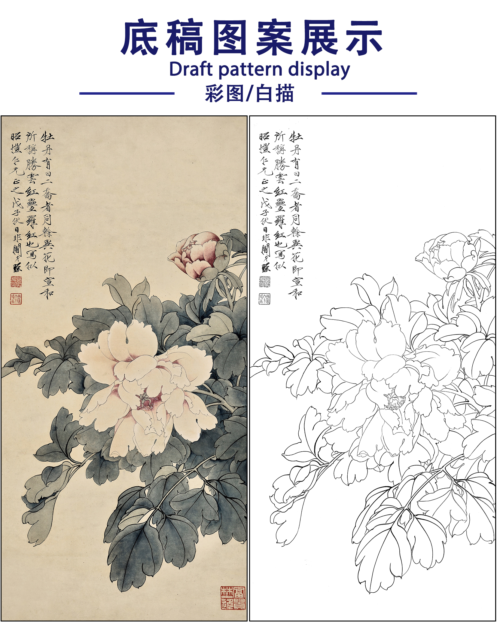 工笔画白描底稿于非闇花鸟《大富贵》临摹勾线高清打印稿FA36