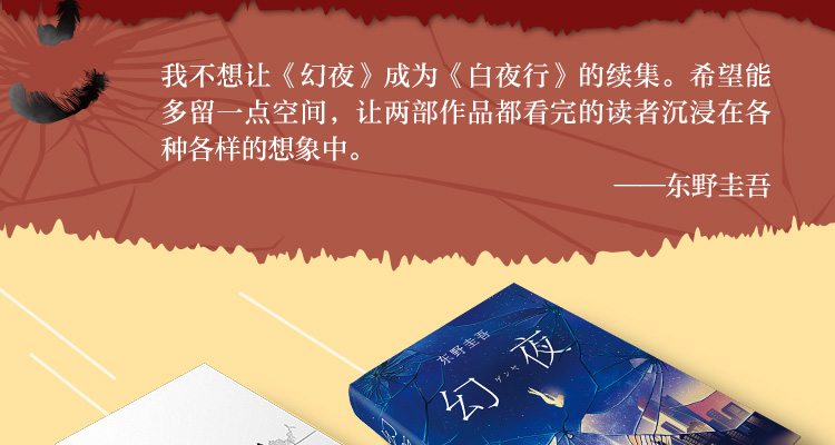 一个东野圭吾作品序列中经久不衰的大谜题:《幻夜》是一部很难评论的作品。每个人都会问这部作品与《白夜行》的关联,但此刻我无法回答。我不想让《幻夜》成为《白夜行》的续集。希望能多留一点空间,让两部作品都看完的读者沉浸在各种各样的想象中。——东野圭吾