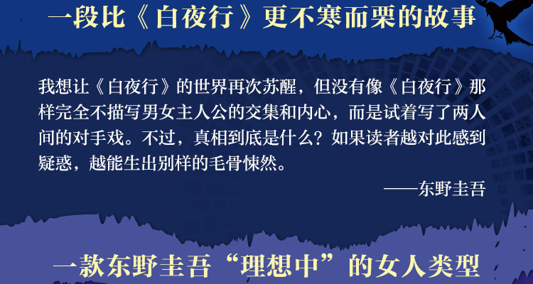 一段比《白夜行》更不寒而栗的故事:我想让《白夜行》的世界再次苏醒,但没有像《白夜行》那样一点都不描写男女主人公的交集和内心,而是试着写了两人间的对手戏。不过,真相到底是什么?如果读者越对此感到疑惑,越能生出别样的毛骨悚然。——东野圭吾