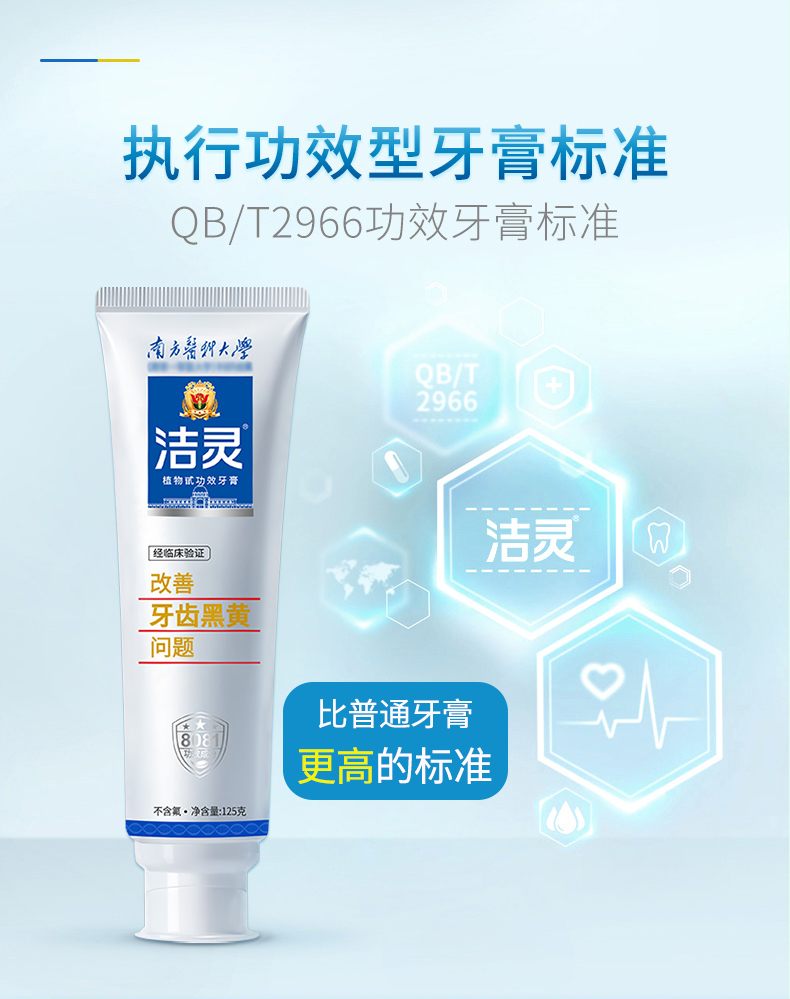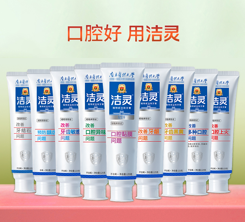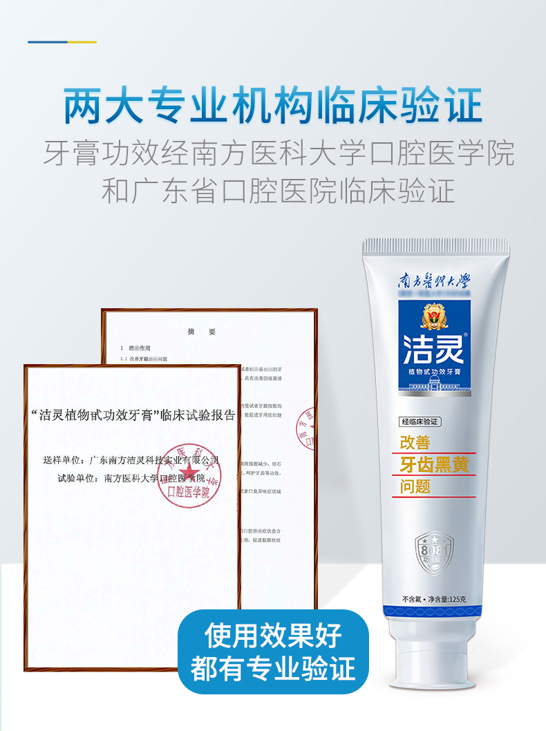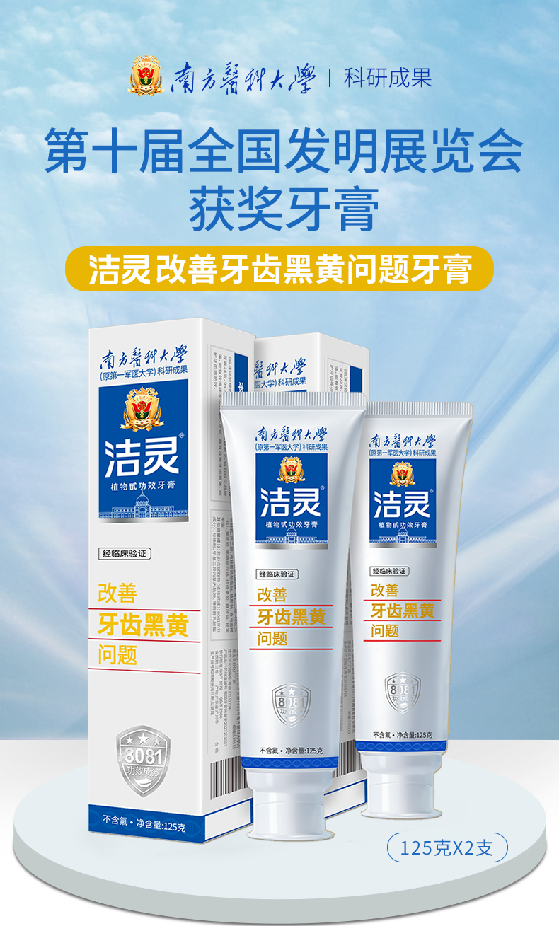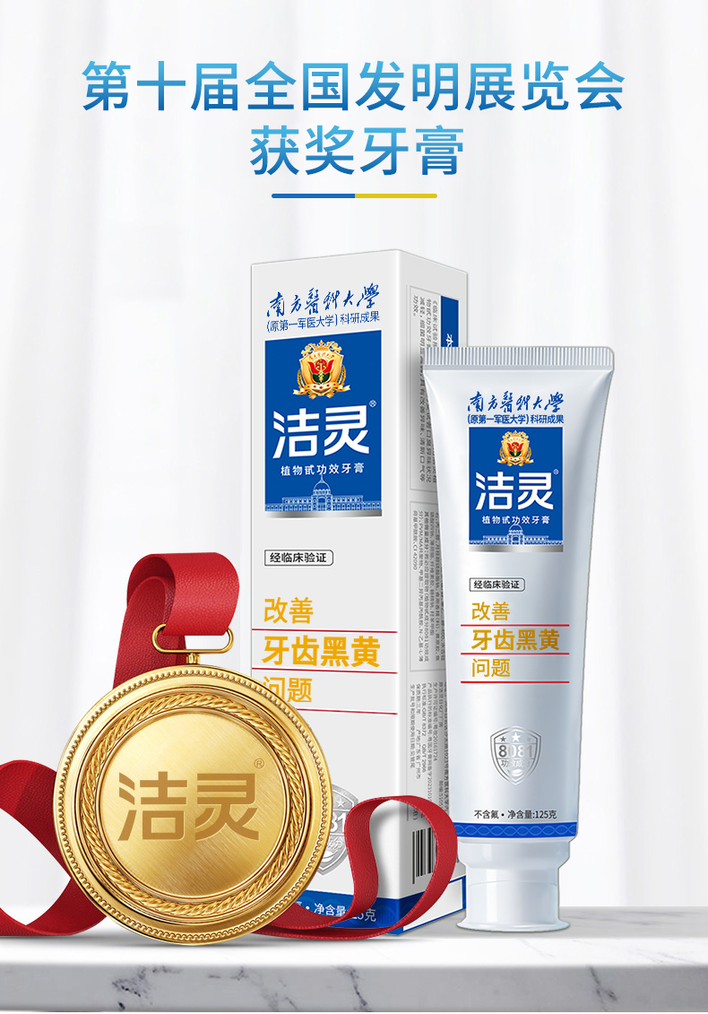 - 洁灵牙膏,由南方医科大学研制,牙膏的核心8081功效成分效果出众,在第十届全国发明展览会成为获奖牙膏。