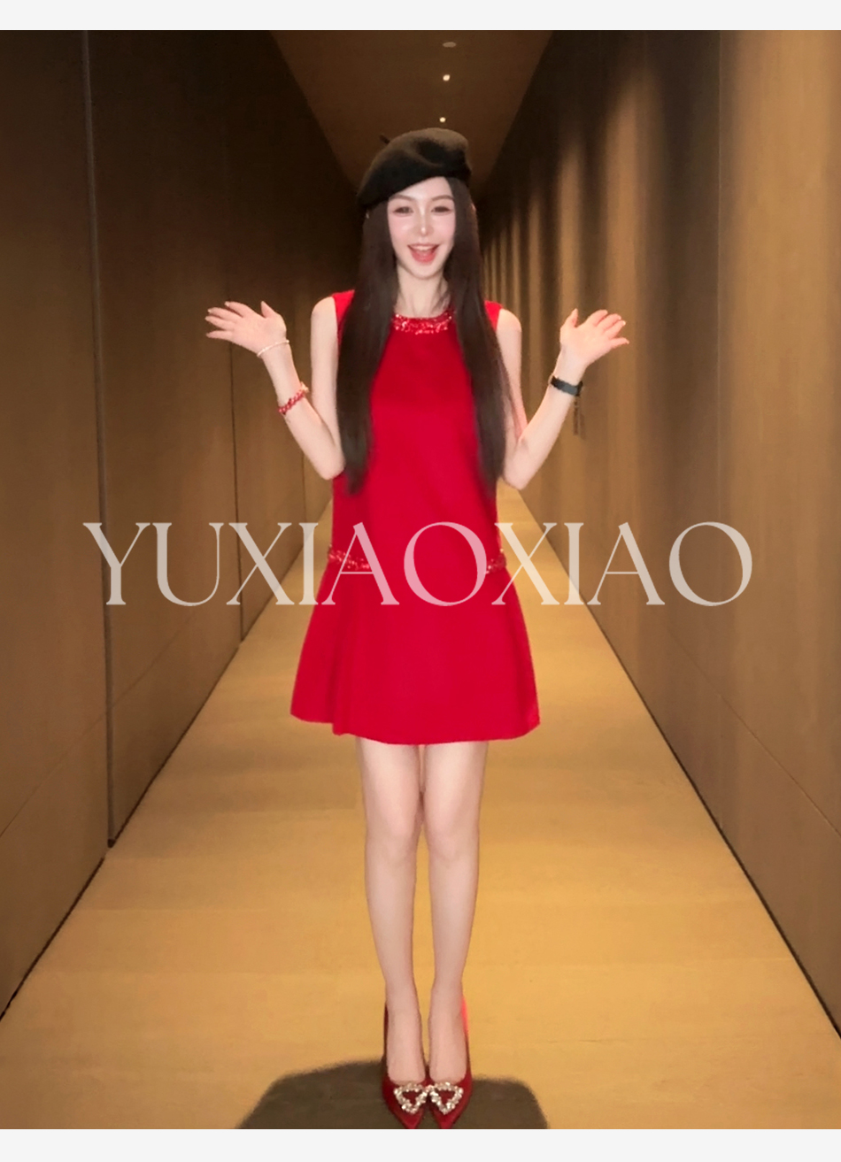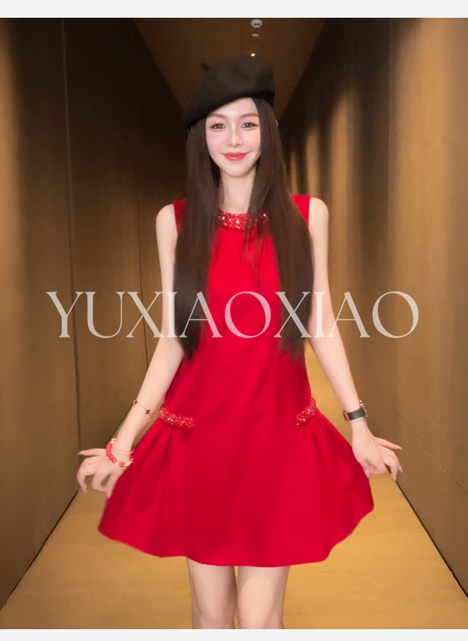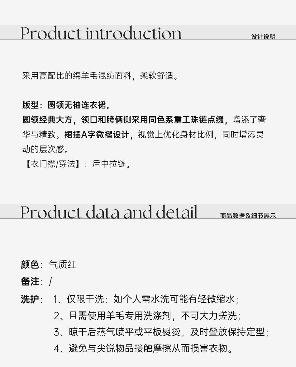 余潇潇【永夜玫瑰】高含量绵羊毛混纺同色系重工珠链圆领无袖连衣裙