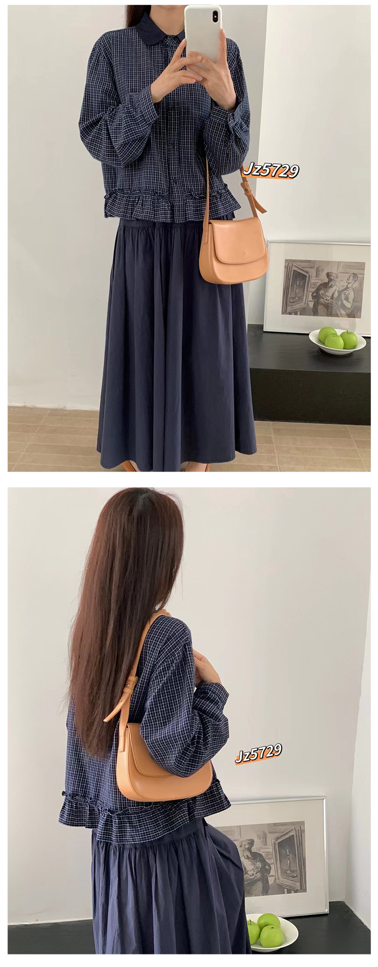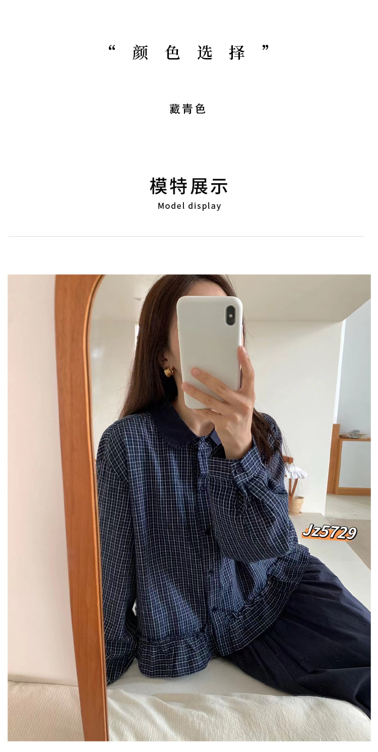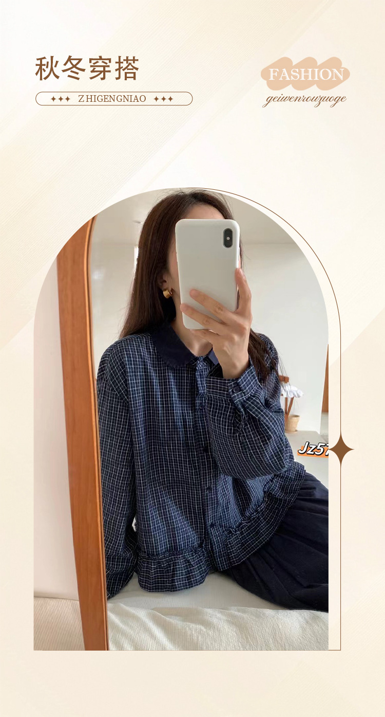 【复古时尚新款毛衣】减龄木耳边下摆格子衬衫 气质拼色翻领长袖开衫女