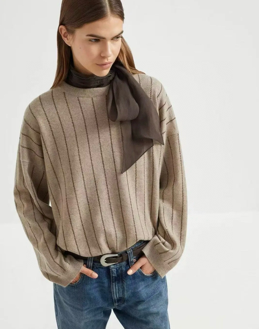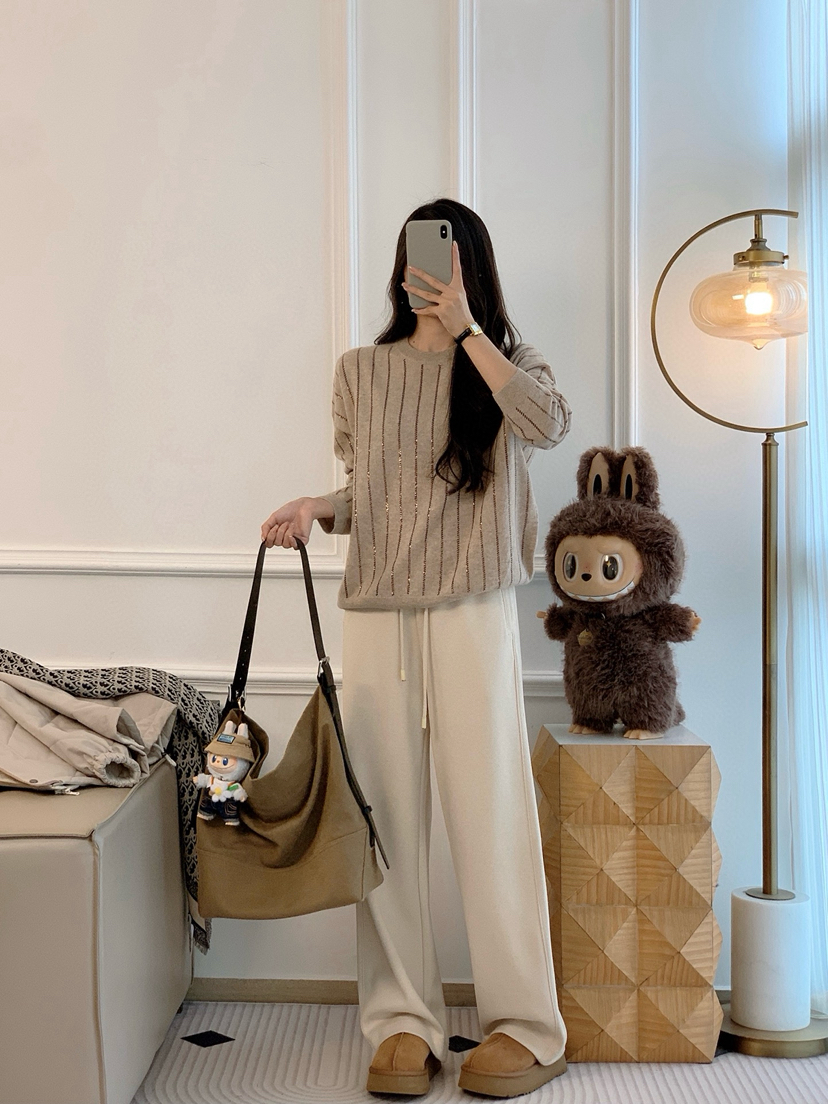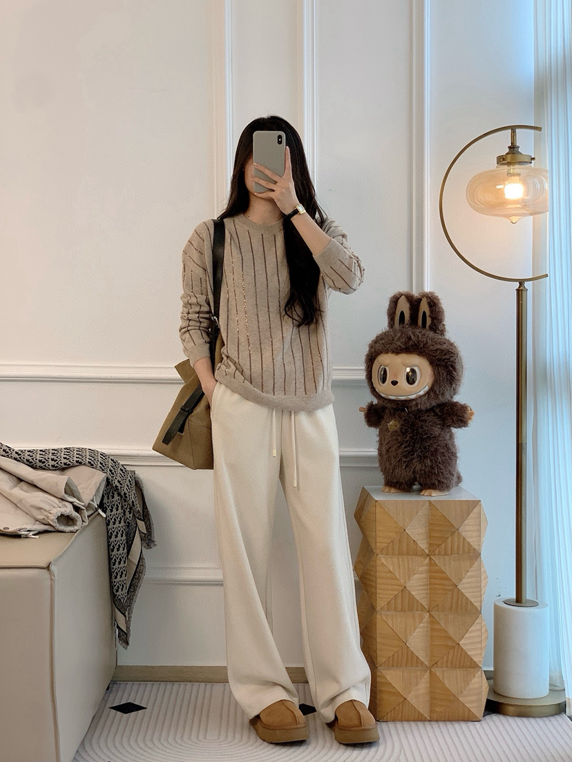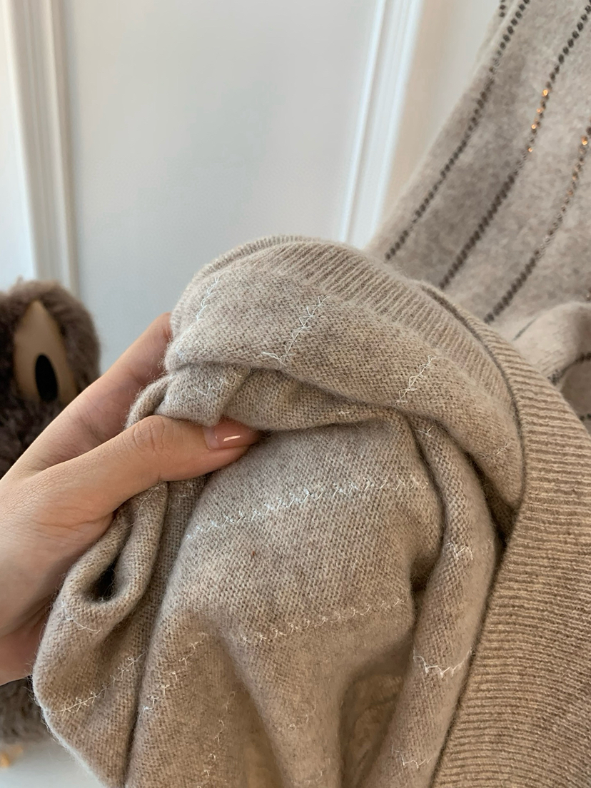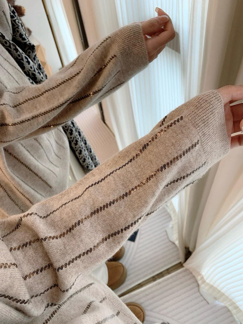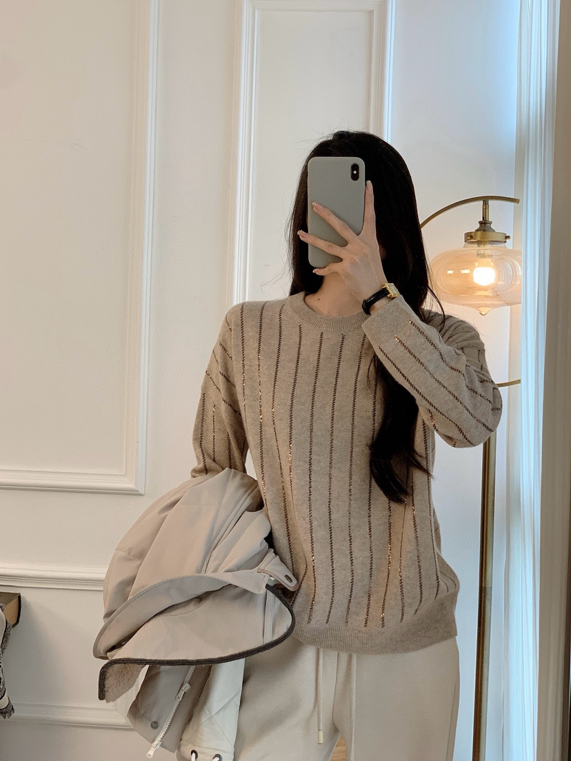 1027-3 百分百💯纯羊绒 BC松弛感落肩设计 珠片条纹 纯羊绒圆领针织衫