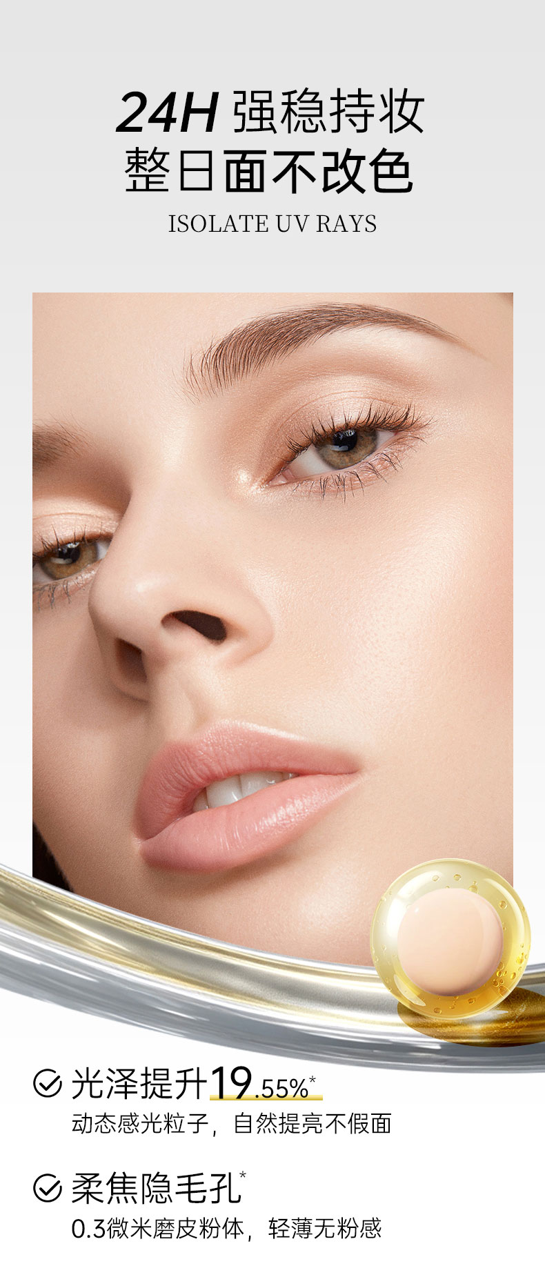 让粉质更细腻,做到妆面24小时不斑驳,不脱妆。