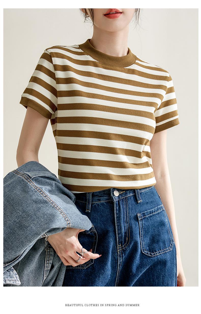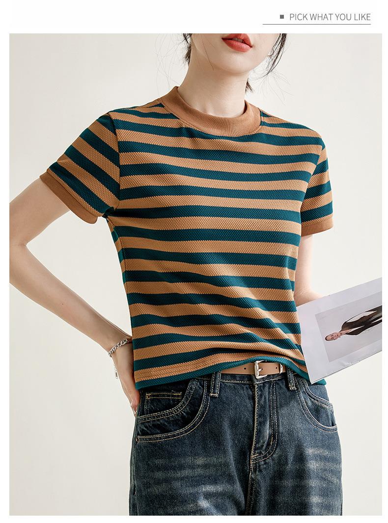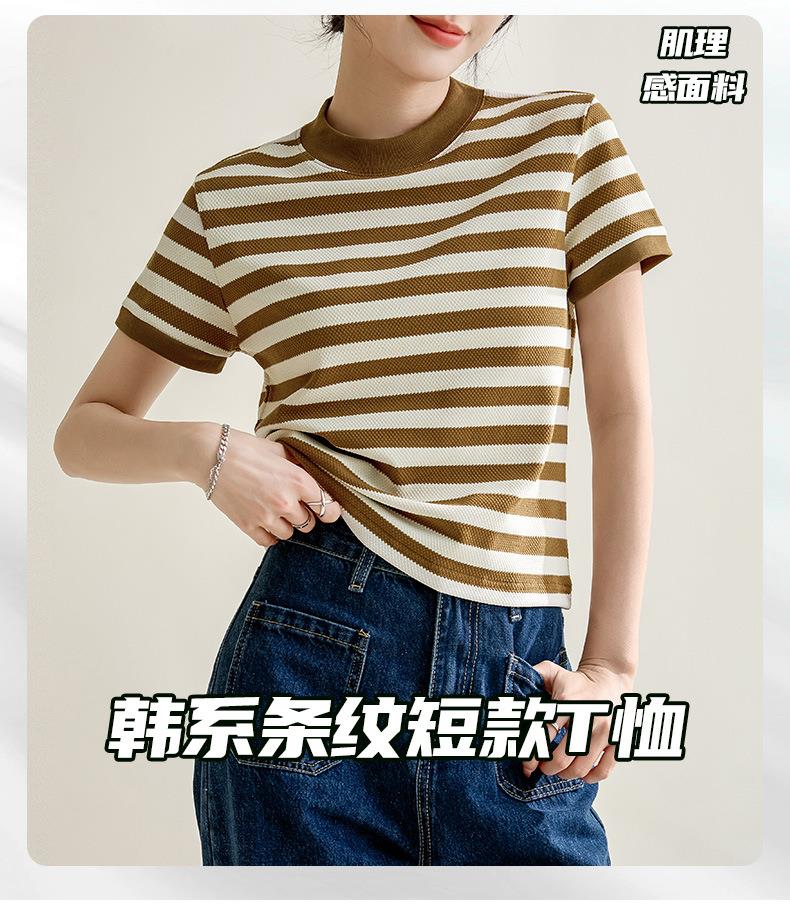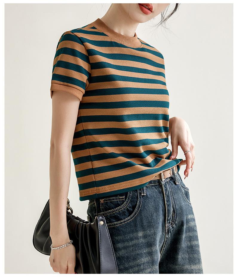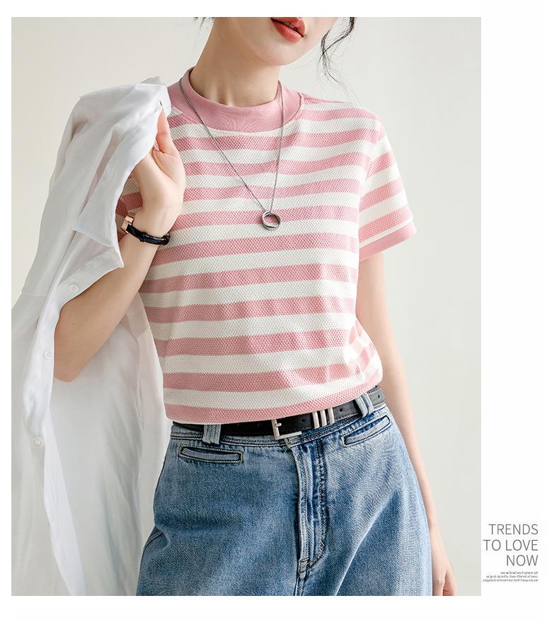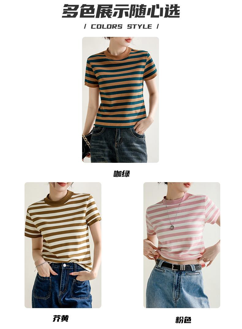 韩系小众圆领肌理感撞色条纹短袖T恤女2024春夏新款设计感上衣