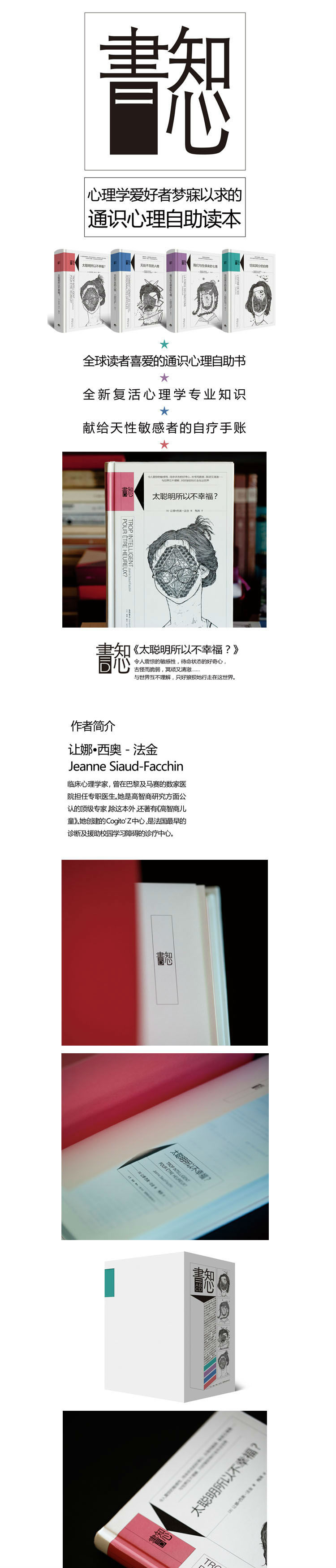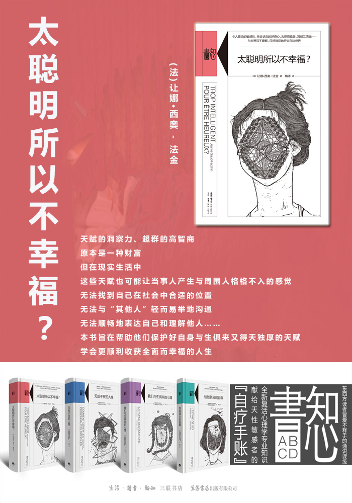 编辑推荐 “知心書”是三联生活书店耗时两年推出的一套集心理学新理论、心理咨询专业知识、自我治疗方法于一体的通识课级别的心理自助类书。《太聪明所以不幸福?》2008年在法国出版至今,读者遍布全球。 他们有着非一般的高感知力,在旁人还没弄明白事情原委时,他们已经能够非常强烈地感知到事情的走向,先知般的超验能力带给他们的不是源源不断的生产力,而是无尽的孤独感…… 他们有着强烈的情绪易感性,会忽然流泪,会有常人不可理解的害怕,还有过度的热情,即使非常小的细节也会让他们情绪崩溃,神经质的他们常受人批评,于是,他们逐渐变得沉默,脆弱不堪,形单影只…… 他们有着超强的洞察力,从不满足于过于简单的解释,总是不断想知道为什么,无情目光就算在自我分析时也绝不打折扣…… 别人夸他们太聪明时,他们挑衅地回道:希望得到的天性是愚蠢。是的,惊人的敏锐性让他们的大脑彻底成了24小时的跑马场,无法停止的思考如同一匹匹脱缰的野马,他们想找到断开电源的开关…… 他们被称为聪明人,他们被称为资优者,他们是《美丽心灵》里的约翰纳什,他们是《模仿游戏》里的艾伦图灵,他们是校园或职场里与周遭有点格格不入的少数人…… 与世界互不理解的他们,迷茫而狼狈地行走着,他们所有的古怪自动把他们与周围的人分开,只是,大脑运行方式特殊的他们,还有为创造力服务的敏感性,为他人服务的移情能力,为活着的感觉服务的情绪,他们中很多人敏感而脆弱,冥顽又清澈。 祝愿作者让娜创作的这本书能够帮助他们认识自己,调整自己,保存好他们天真的性格、迸发的创造性、令人震惊的敏感性、永远处于待命状态的好奇心以及沸腾的智力。 祝愿他们成为永远不会“长大”的成年人! 内容简介 天赋的洞察力,超群的高智商,原本是一种财富,但在现实生活中,这些天赋也可能让当事人产生与周围人格格不入的感觉——无法找到自己在社会中合适的位置,无法与“其他人”轻而易举地沟通,无法顺畅地表达自己和理解他人…… 《太聪明所以不幸福?》的作者让娜从日常接触到的案例入手,结合自己常年对“资优者”研究累积的丰富经验,细致而生动地为现实生活中的高智商者、优秀的女性及某些方面优于常人的聪明人,铺开一帧帧画面,让他们从书中看到自己的影子,再以移情的笔触帮助他们认识到与他人、与世界的相处方式。旨在帮助他们保护好自身与生俱来又得天独厚的天赋,学会更顺利收获全面而幸福的人生。 作者简介 让娜·西奥-法金 Jeanne Siaud-Facchin,临床心理学家,曾在巴黎及马赛的数家医院担任专职医生。她是高智商研究方面公认的顶端专家,除这本外,还著有《高智商儿童》(L'Enfant surdoué )。她创建的Cogito’Z中心,是法国很早的诊断及援助校园学习障碍的诊疗中心。