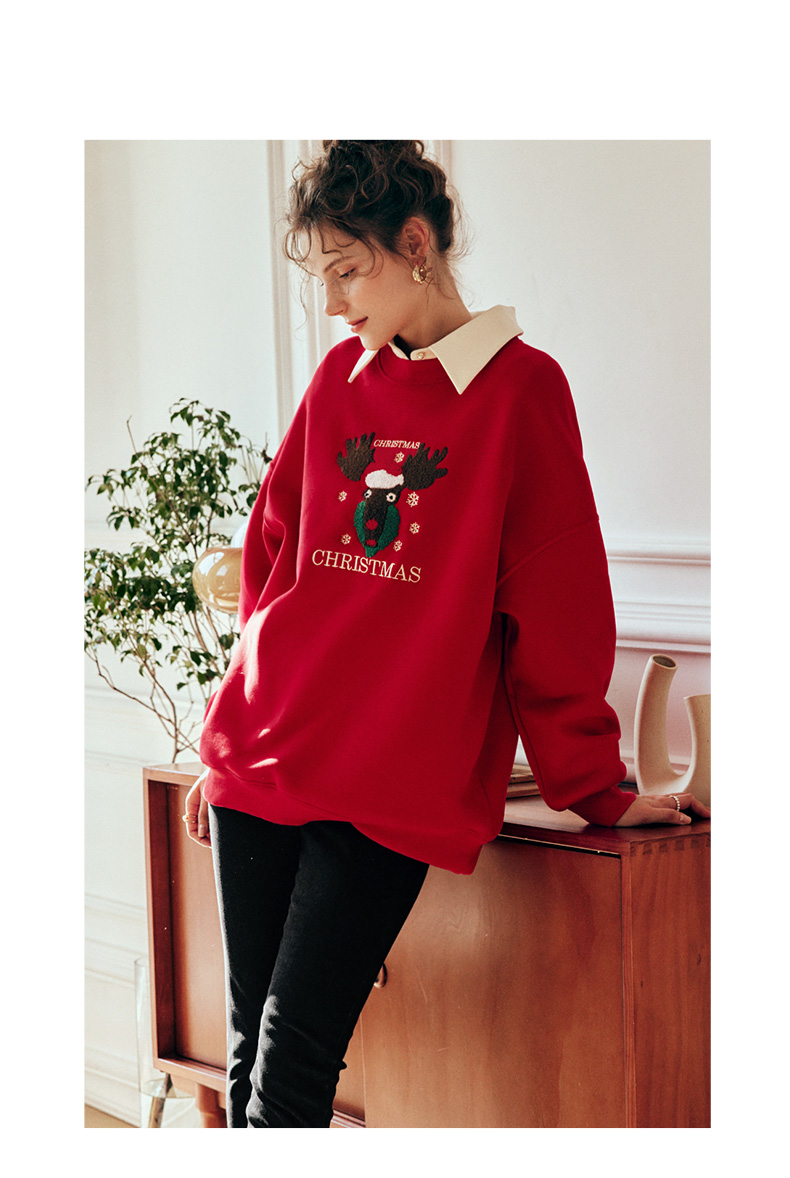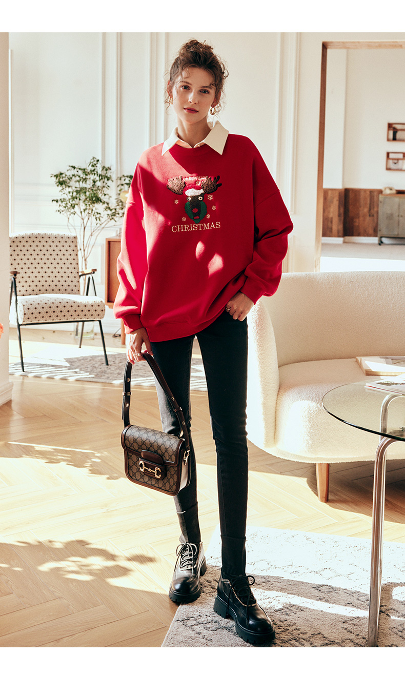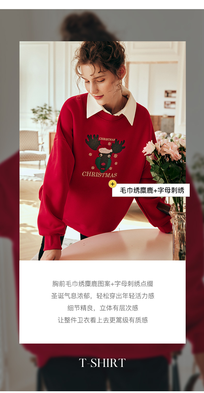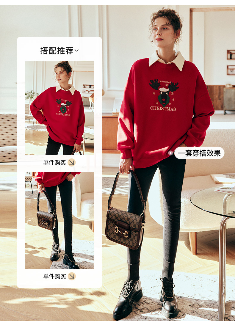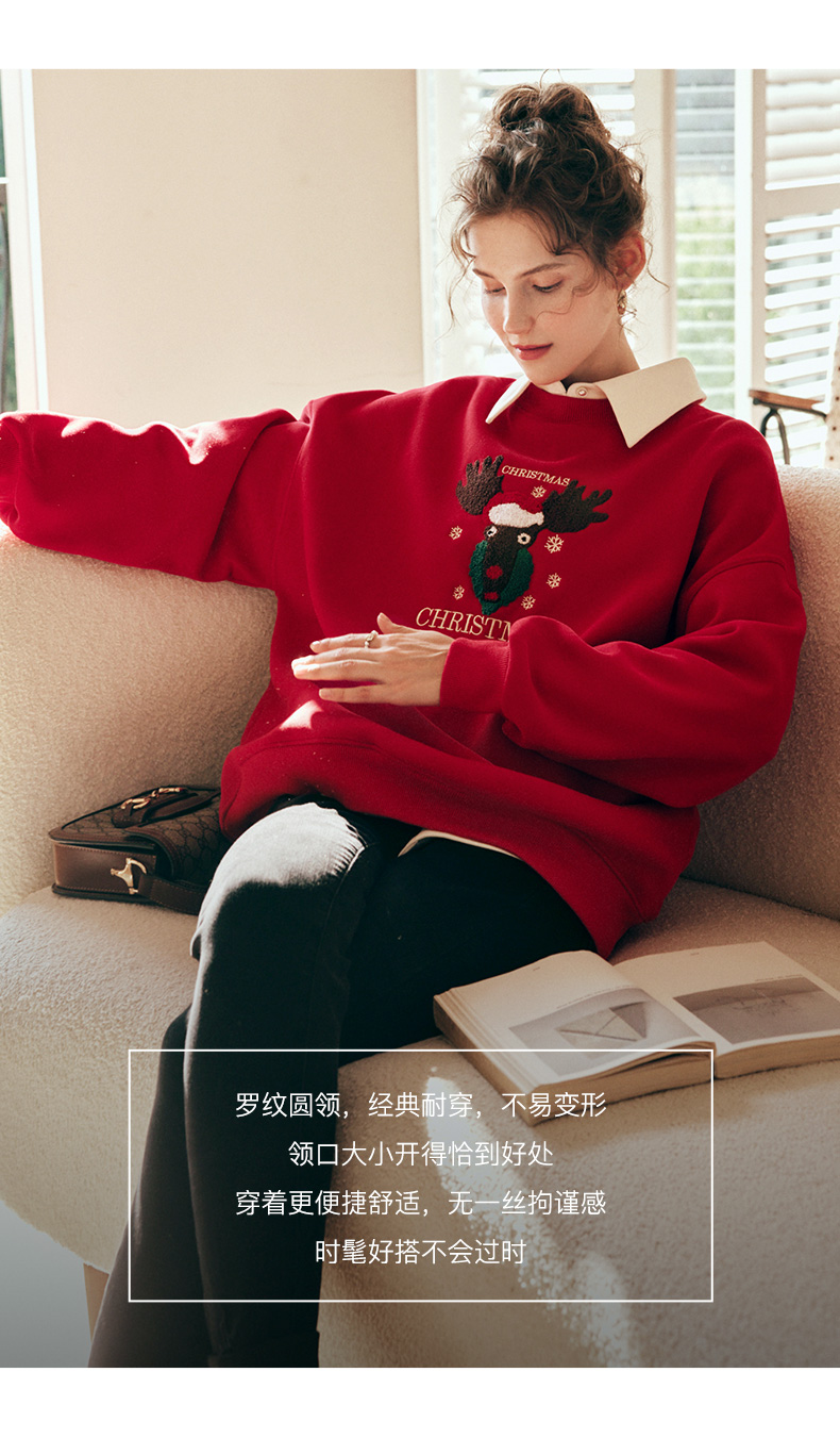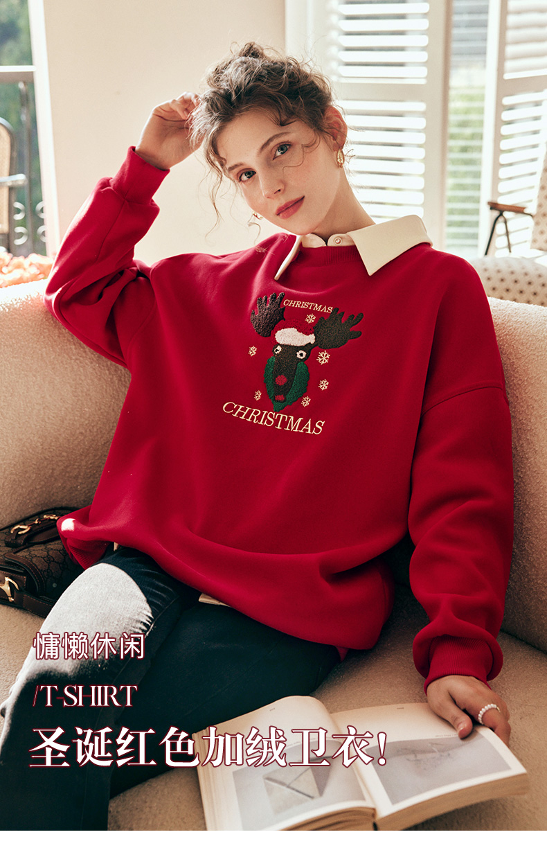 OLrain欧芮儿法式红色加绒卫衣女冬季2025新款宽松慵懒风套头上衣