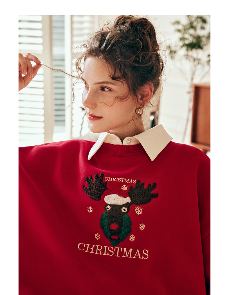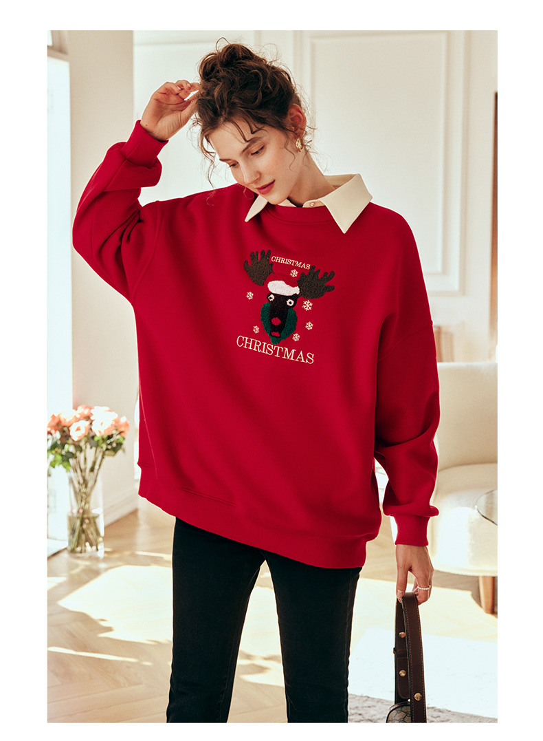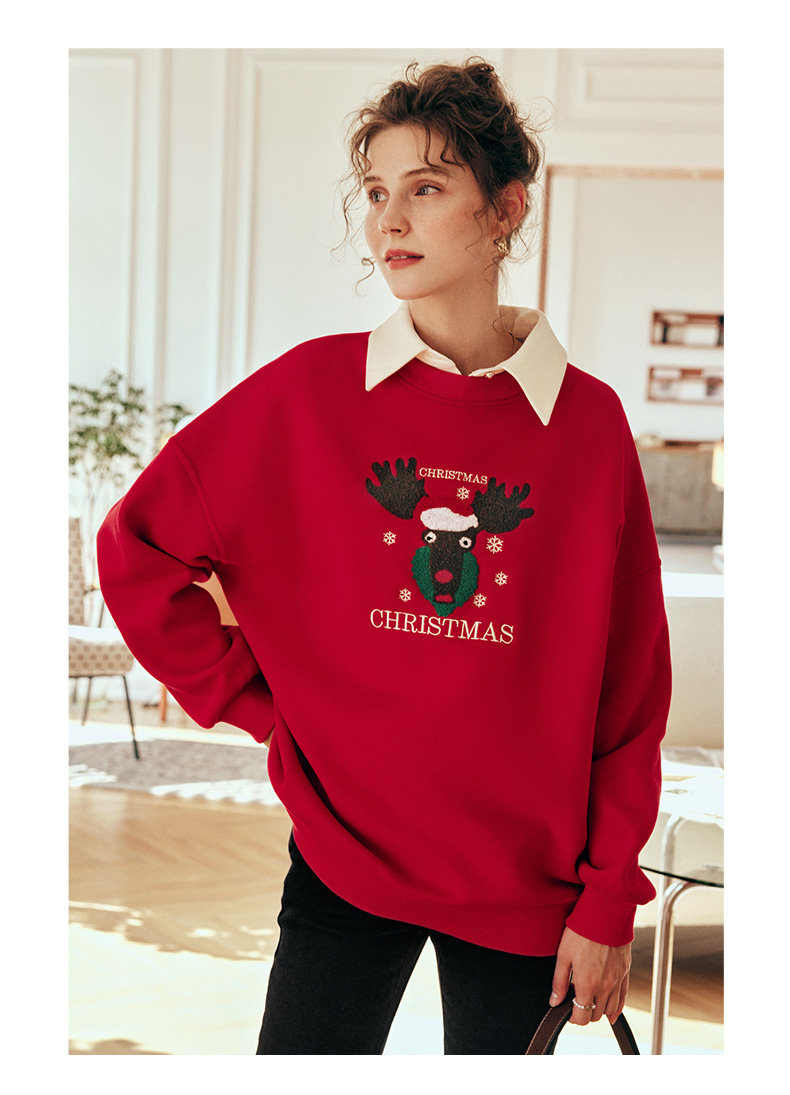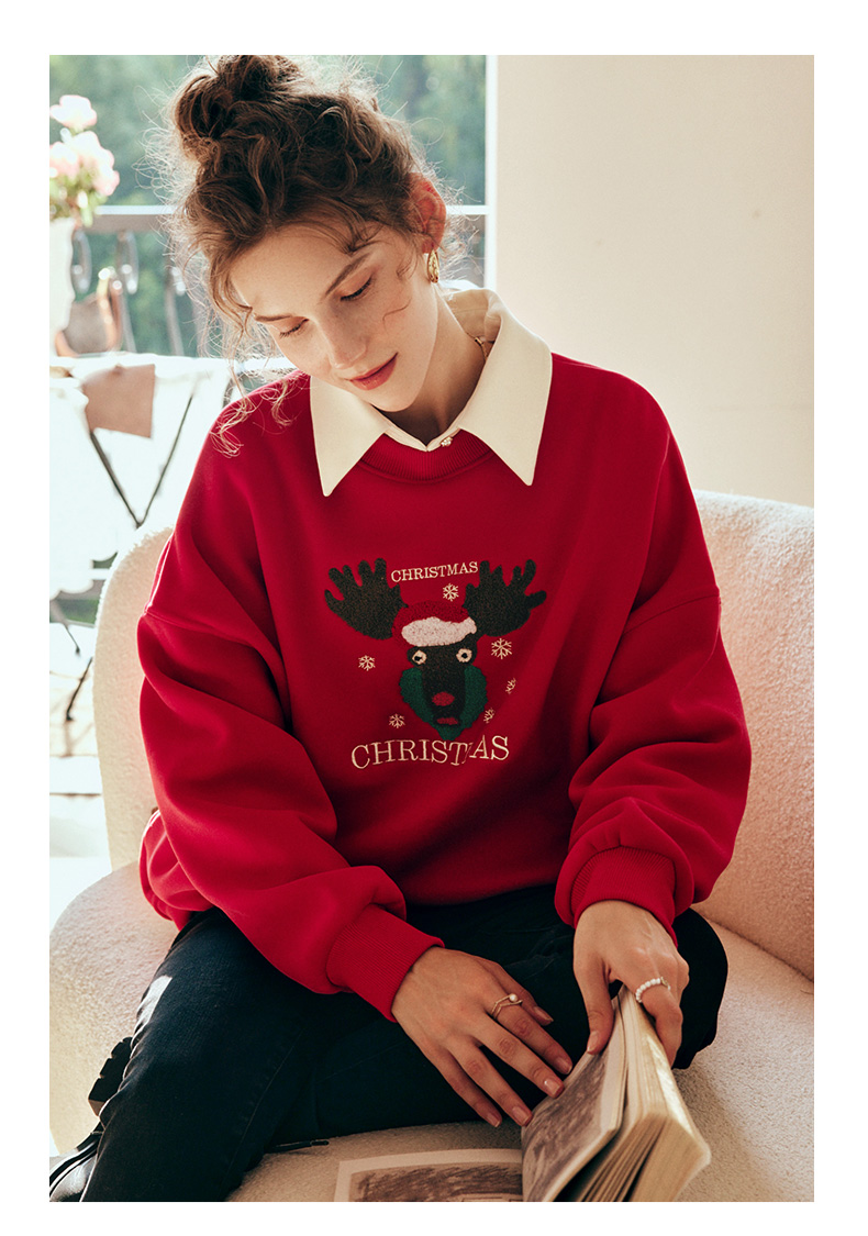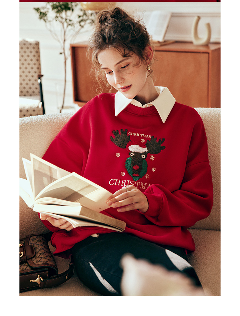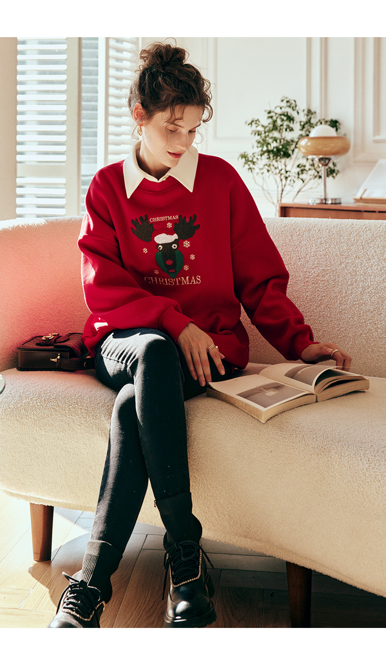 OLrain欧芮儿法式红色加绒卫衣女冬季2025新款宽松慵懒风套头上衣