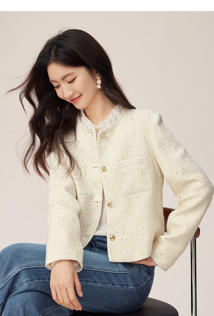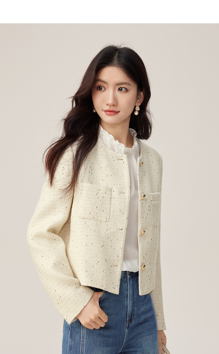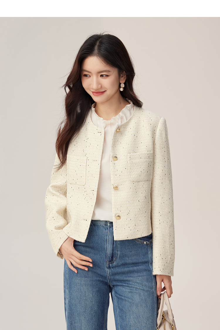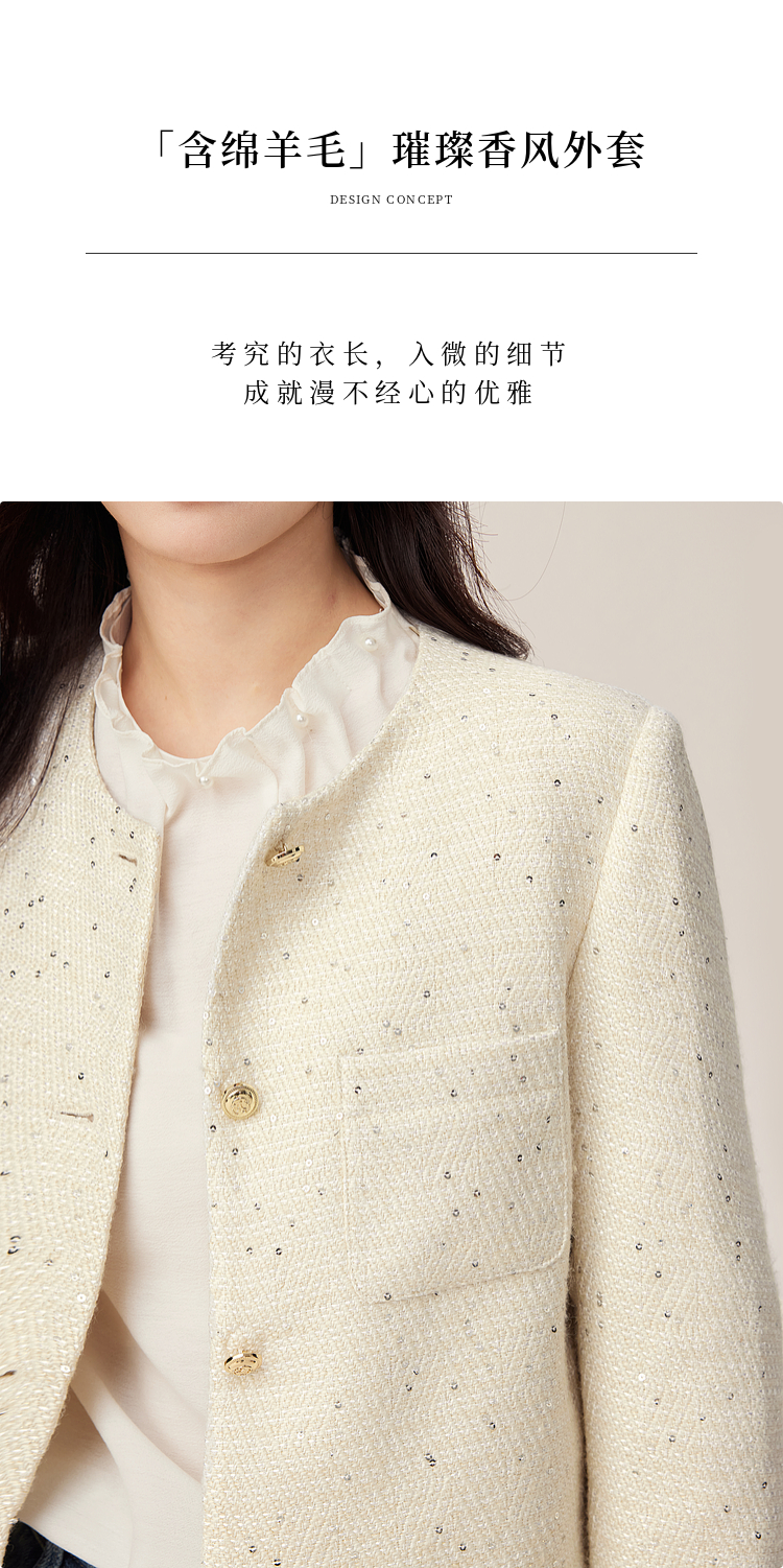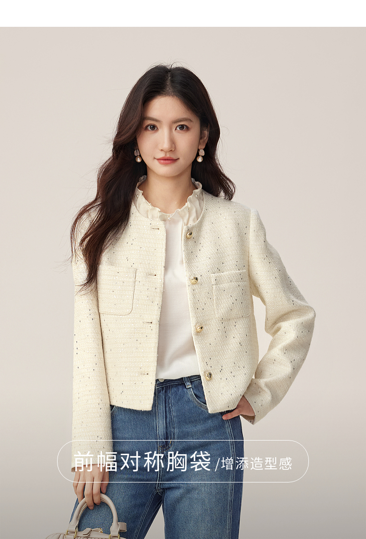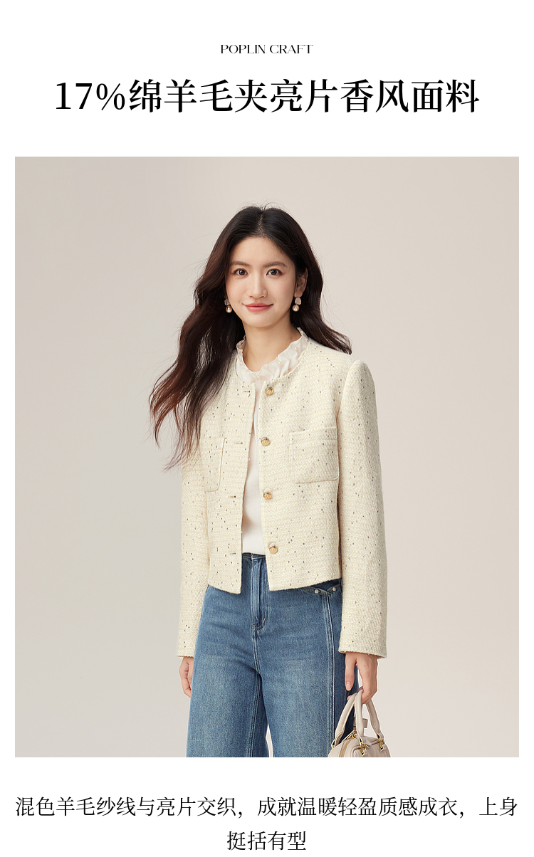 【年货节】熙世界白色小香风短外套2025秋新款女装珠片圆领绵羊毛开衫上衣