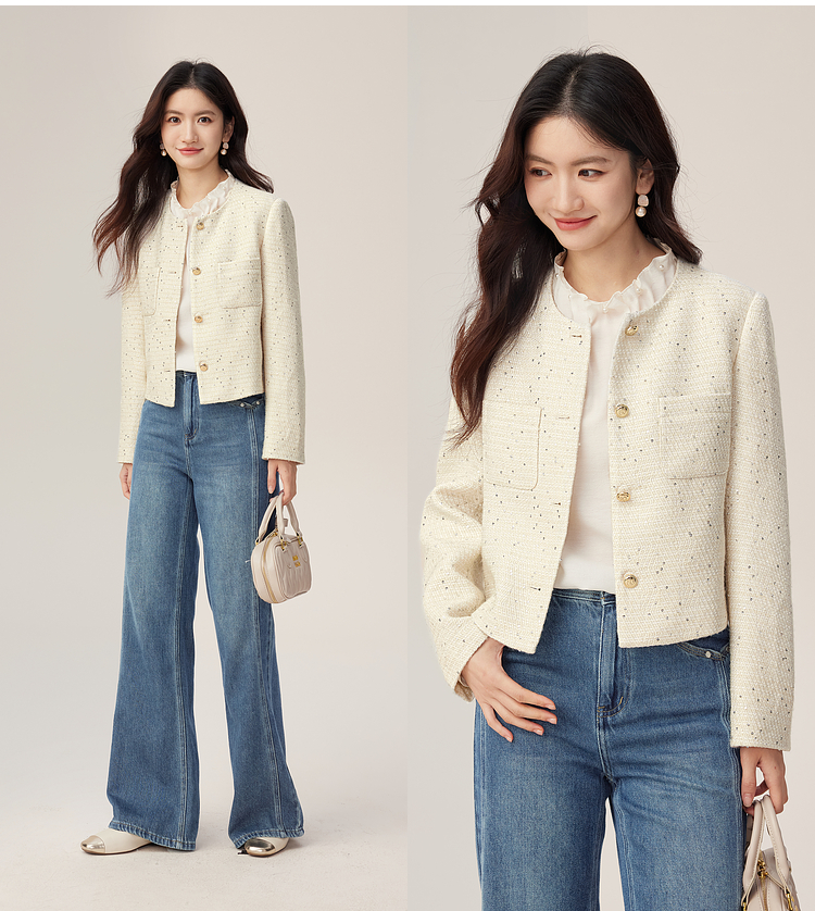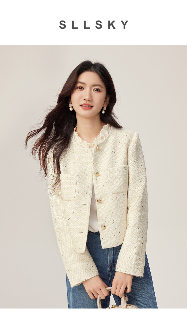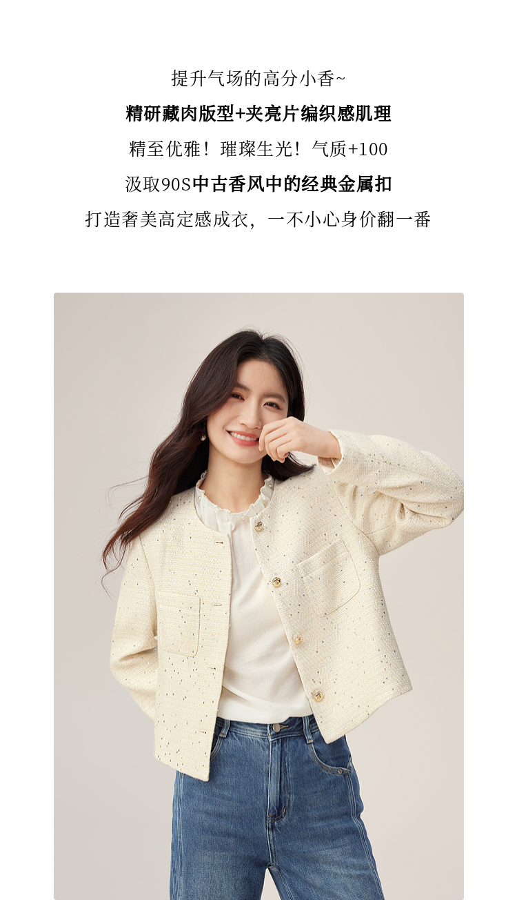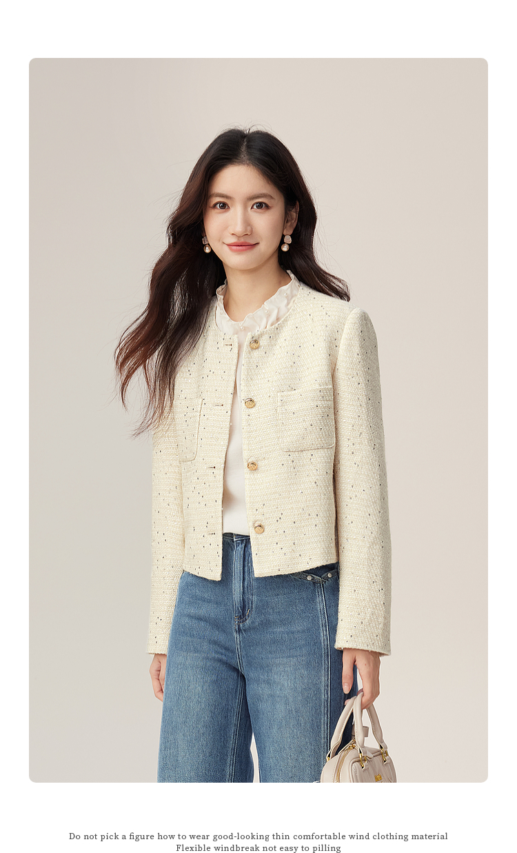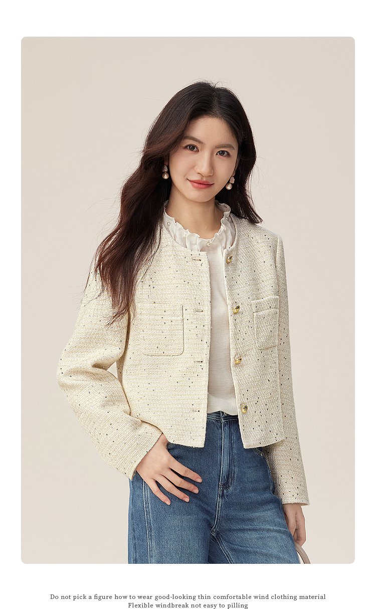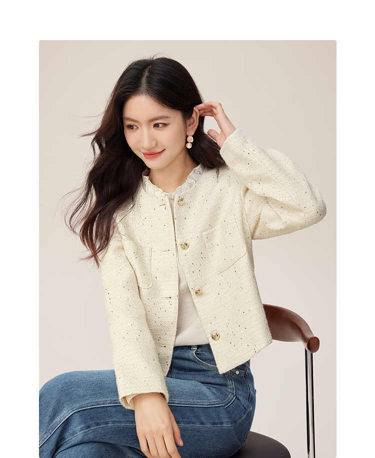 【年货节】熙世界白色小香风短外套2025秋新款女装珠片圆领绵羊毛开衫上衣