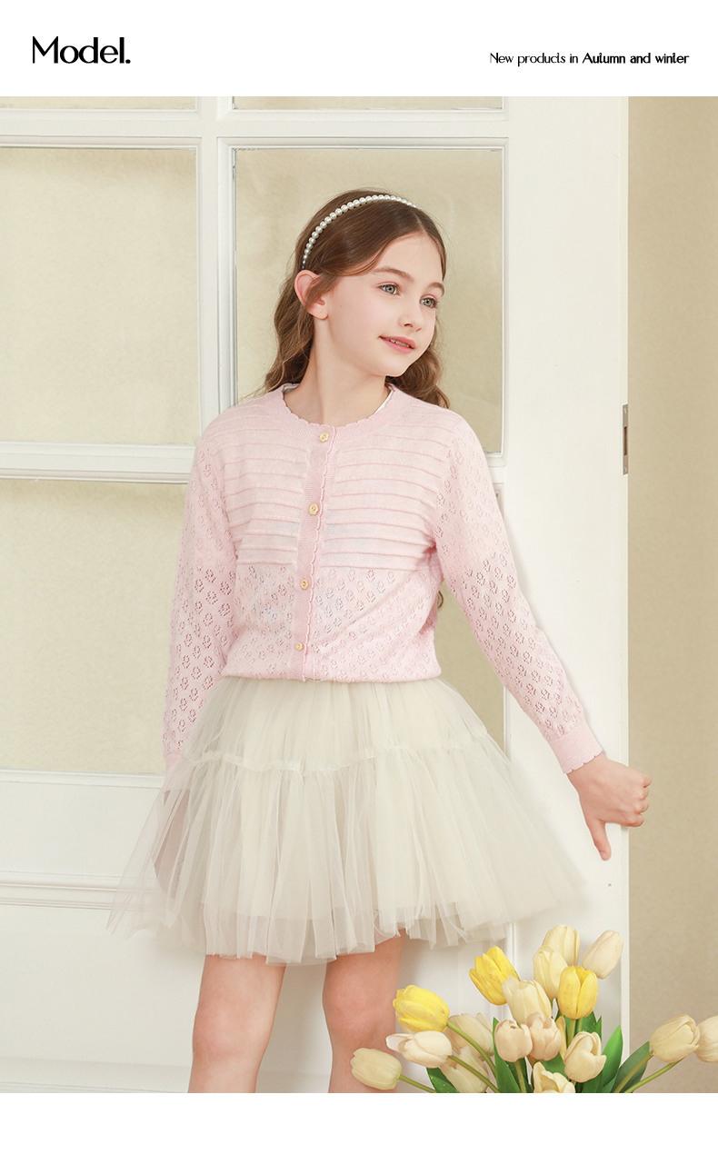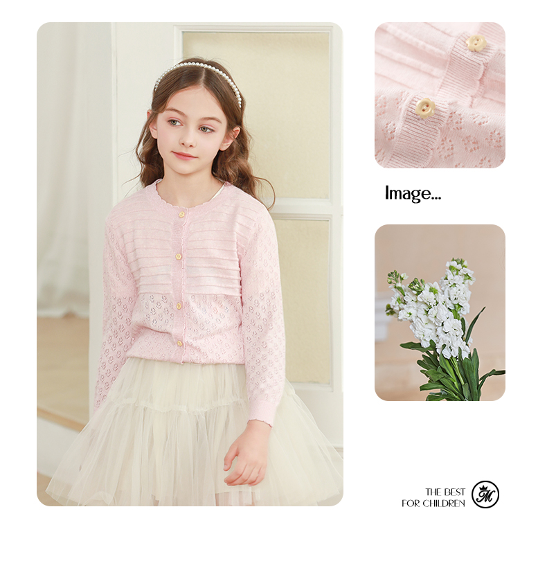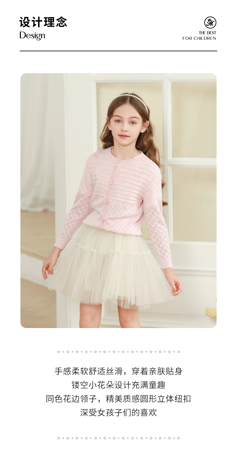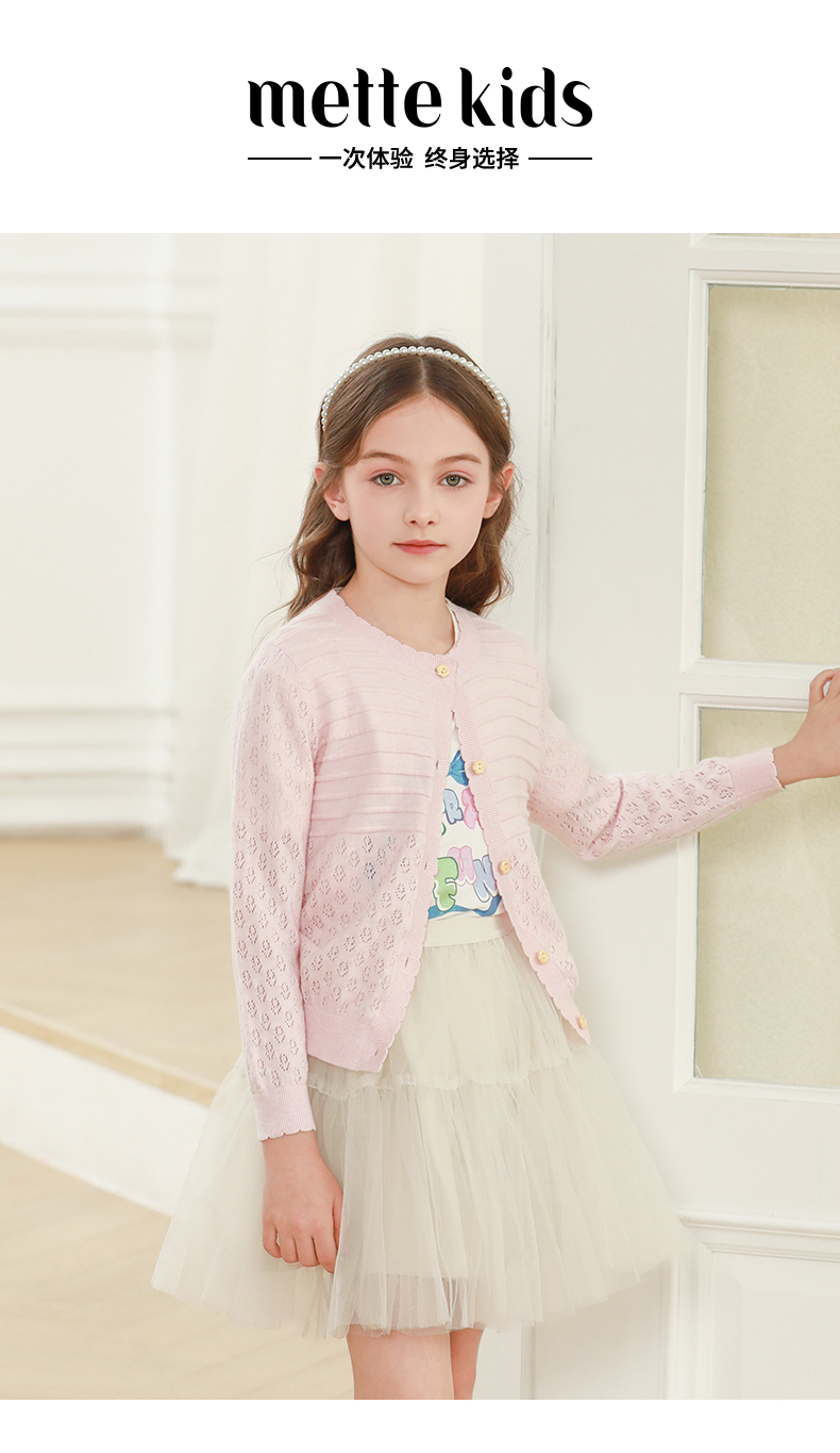 mettekids女童针织开衫2024春秋新款粉色镂空儿童棉羊绒洋气童装
