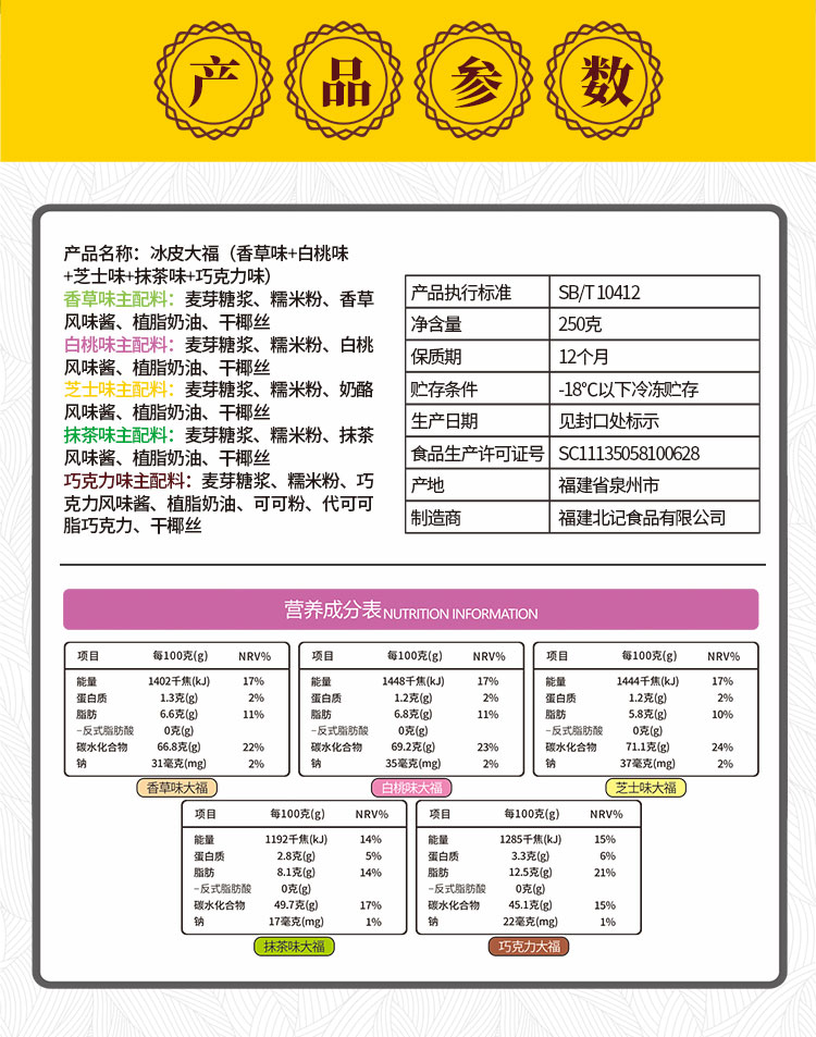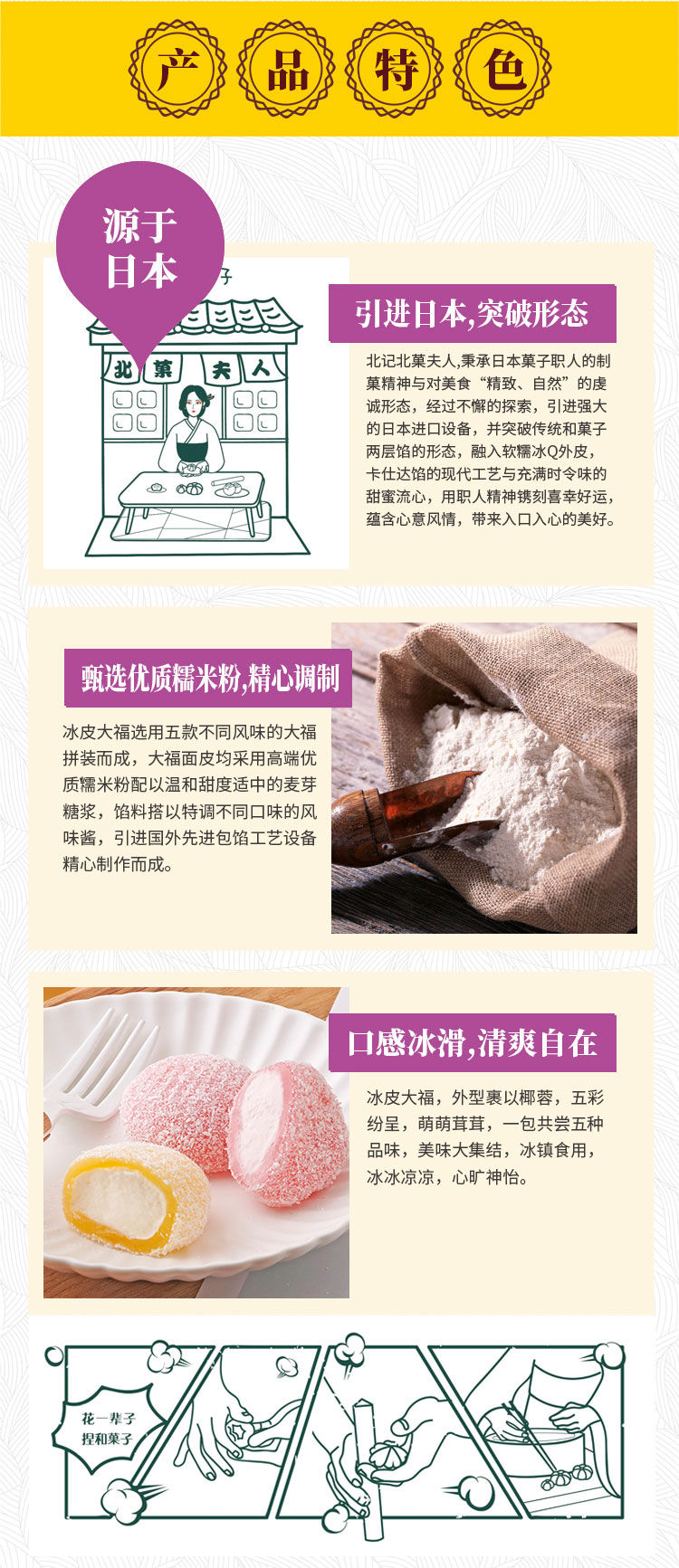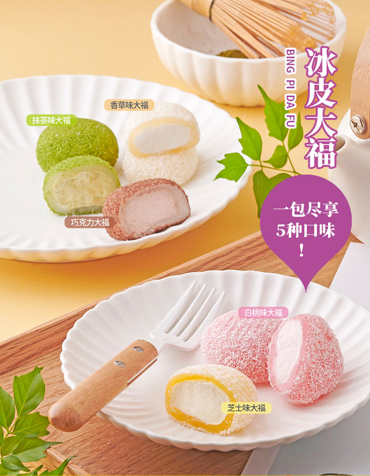 北记5口味冰皮大福*2包(250g/包 10个香草+白桃+芝士+抹茶+巧克力)生产日期: 2月