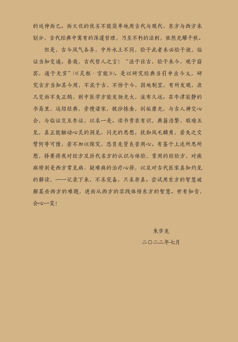 朱步先,1945年生,从医60余载。知识广博,熟谙本草药性、方证配伍,处方用药张弛有度,匠心独具。其海外行医多年,以传播中医文化为己任,将一腔热爱中医的拳拳之心诉诸笔端,集50余年临证思辨所得撰著本书,以冀对中医后学有所帮助。本书为临床医话类著作,为朱步先先生行医多年所思所想、所见所闻之心得体会,文辞流畅,读来颇能启迪心智,开人悟境,弥足珍贵。内容涵盖本草药性、制方配伍、名家评述、经典解读、临证经验等,反映了朱步先先生宽广的学术视野和独特的学术思想,深富教益,启人实多。