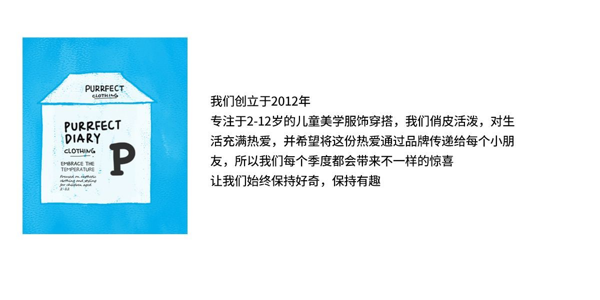 - Purrfect-Diary专注于贴近自然随性的穿着概念,轻奢平价的童装文化传播,在产品设计上更加注重婴童穿着的舒适性、安全性、更出众的国际化品牌,将欧美的育婴文化在中国进行深入的传播与推广。