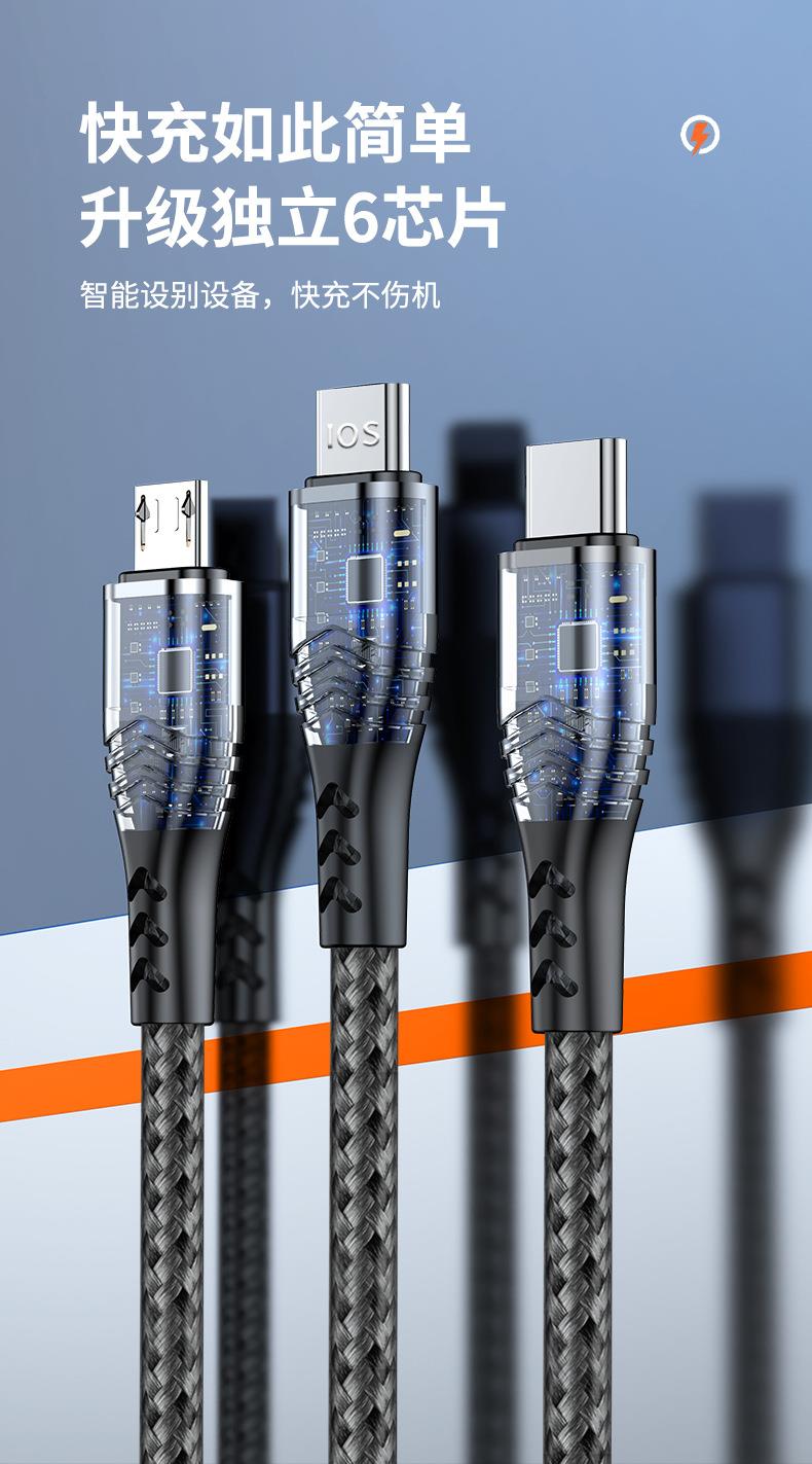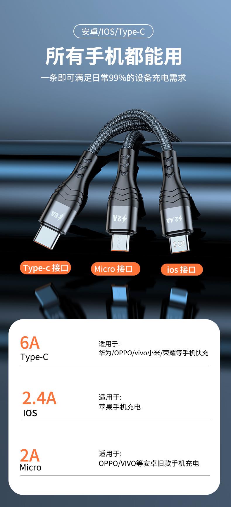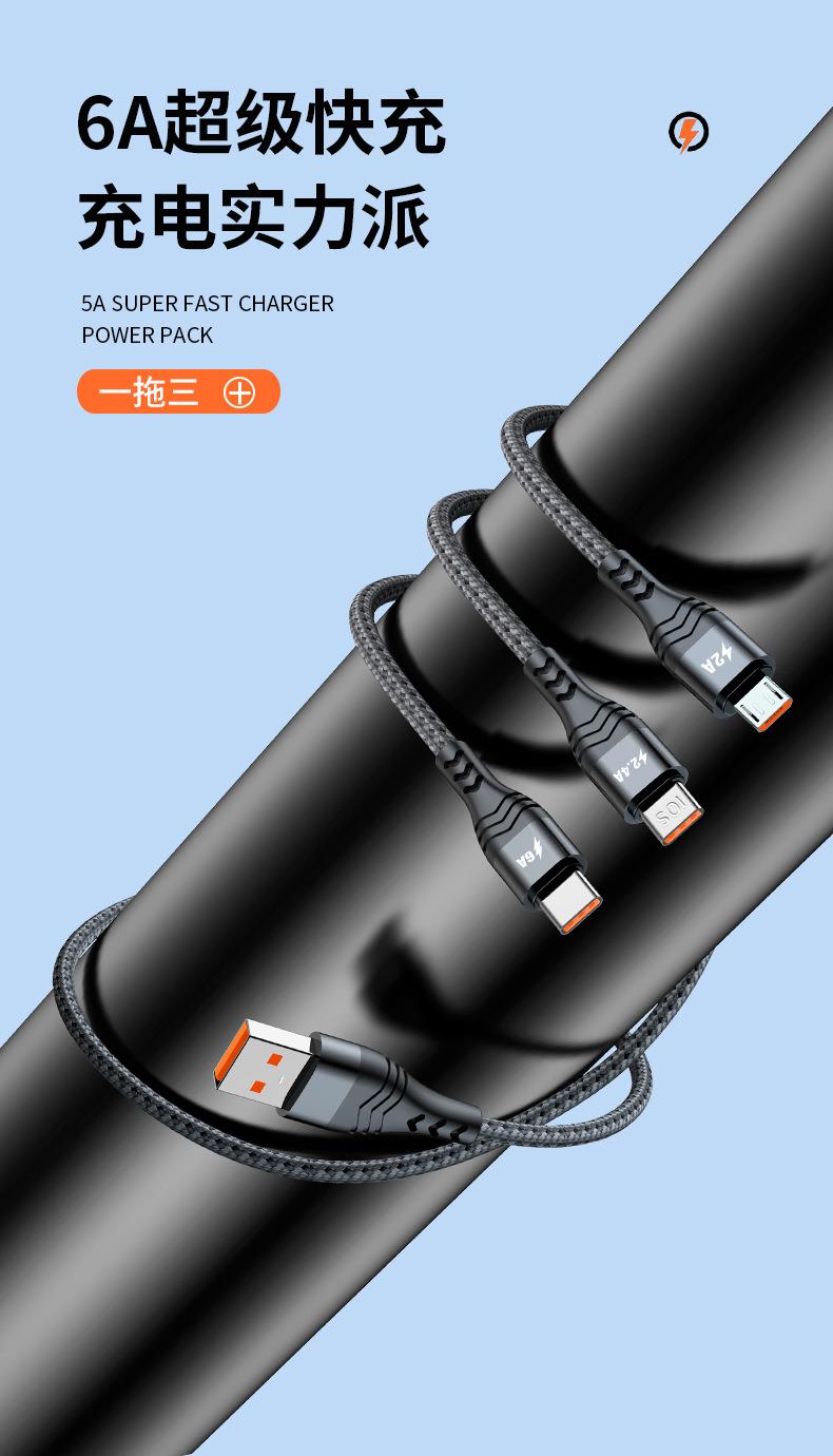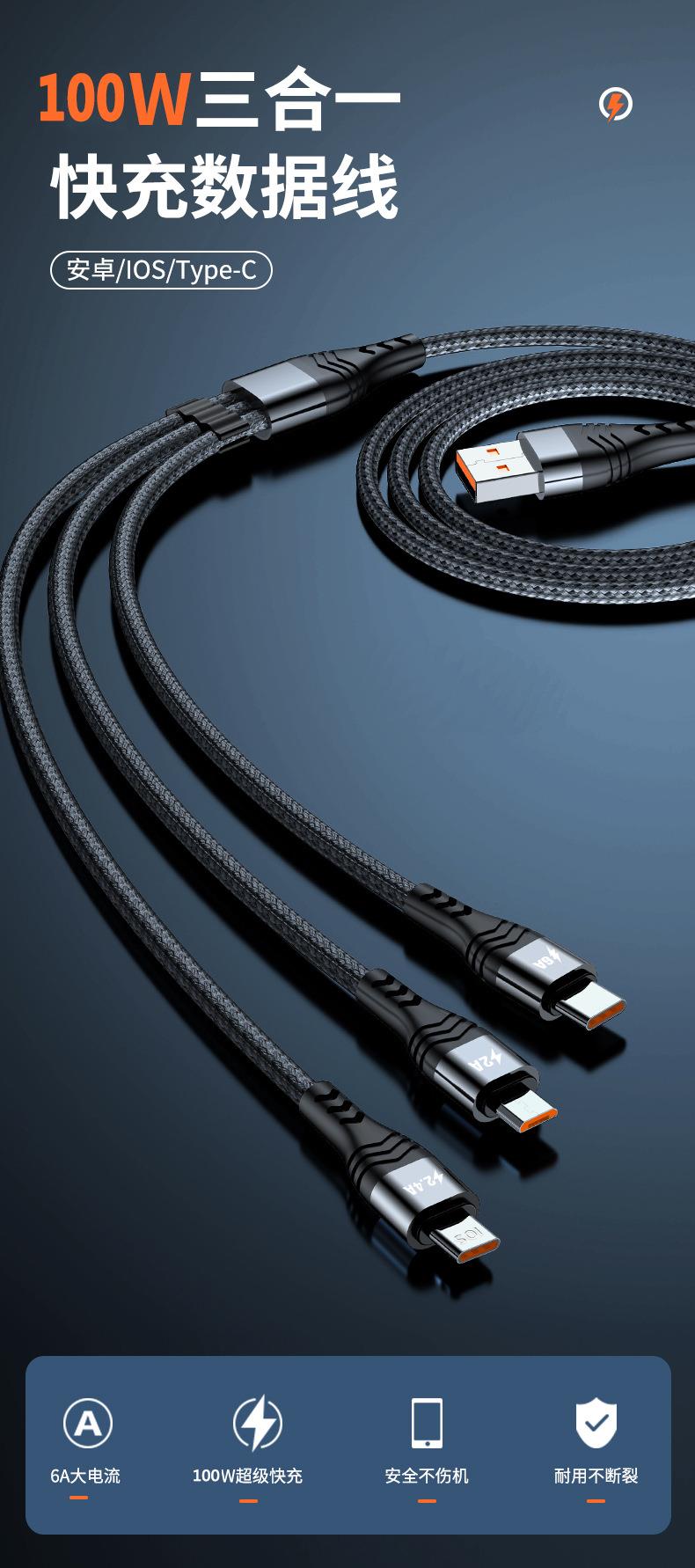 跨境PD100W一拖三6A超级快充数据线适用苹果type-c安卓全协议快充