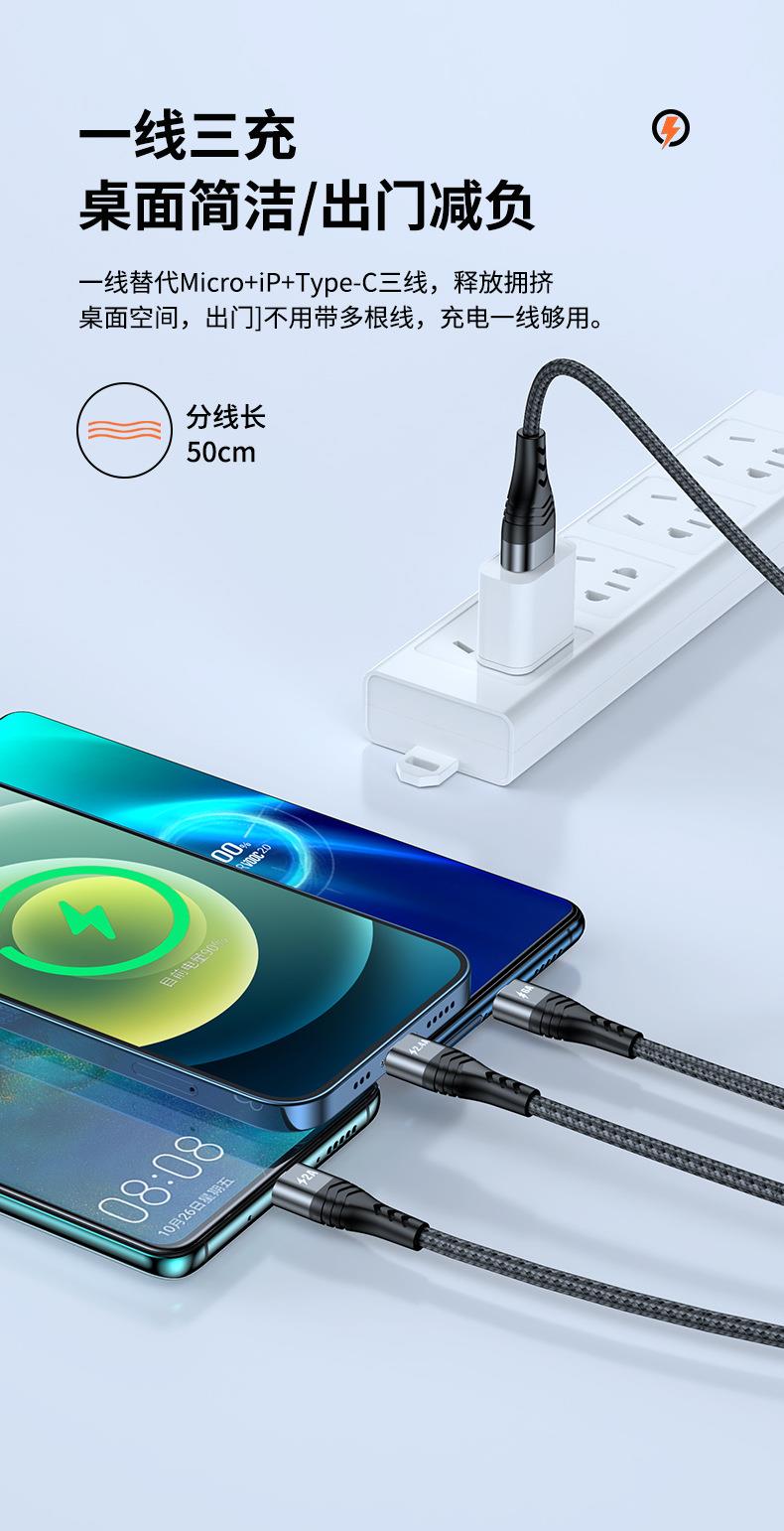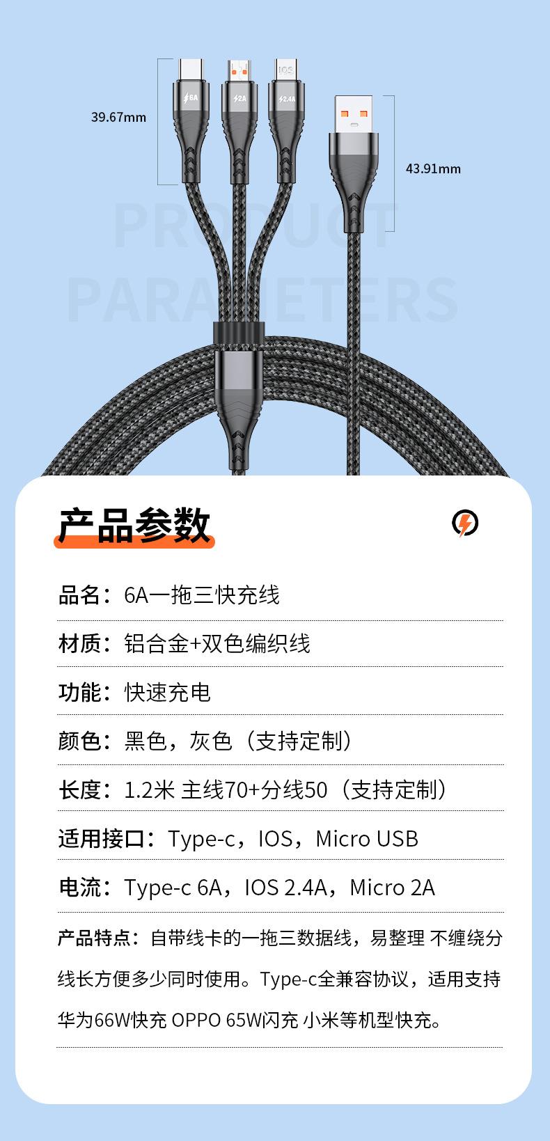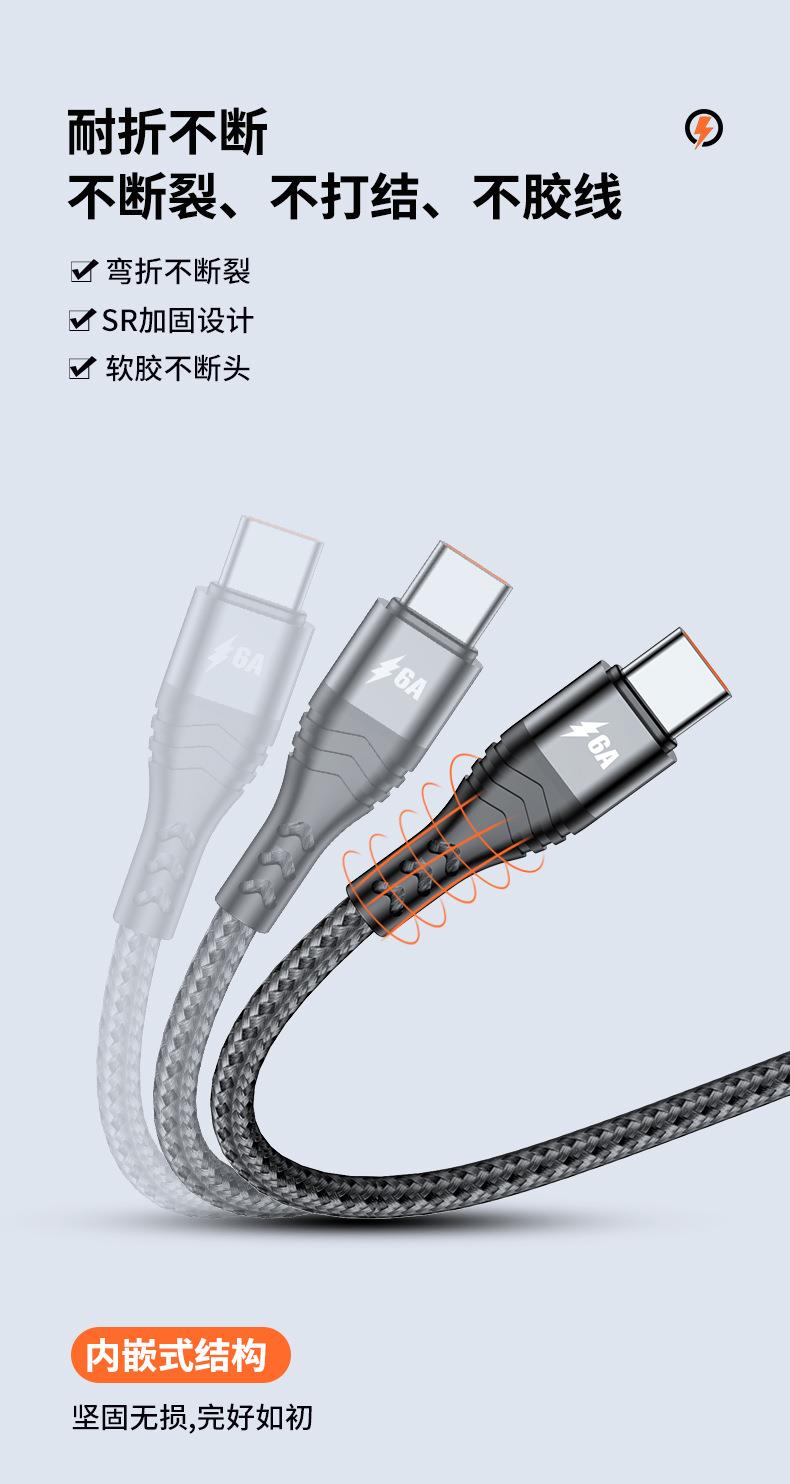 跨境PD100W一拖三6A超级快充数据线适用苹果type-c安卓全协议快充