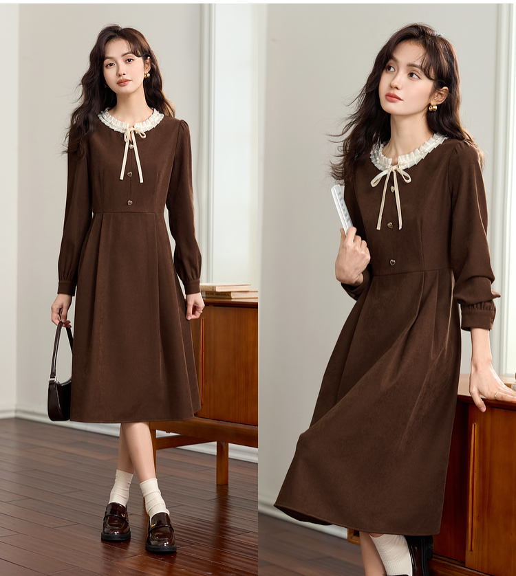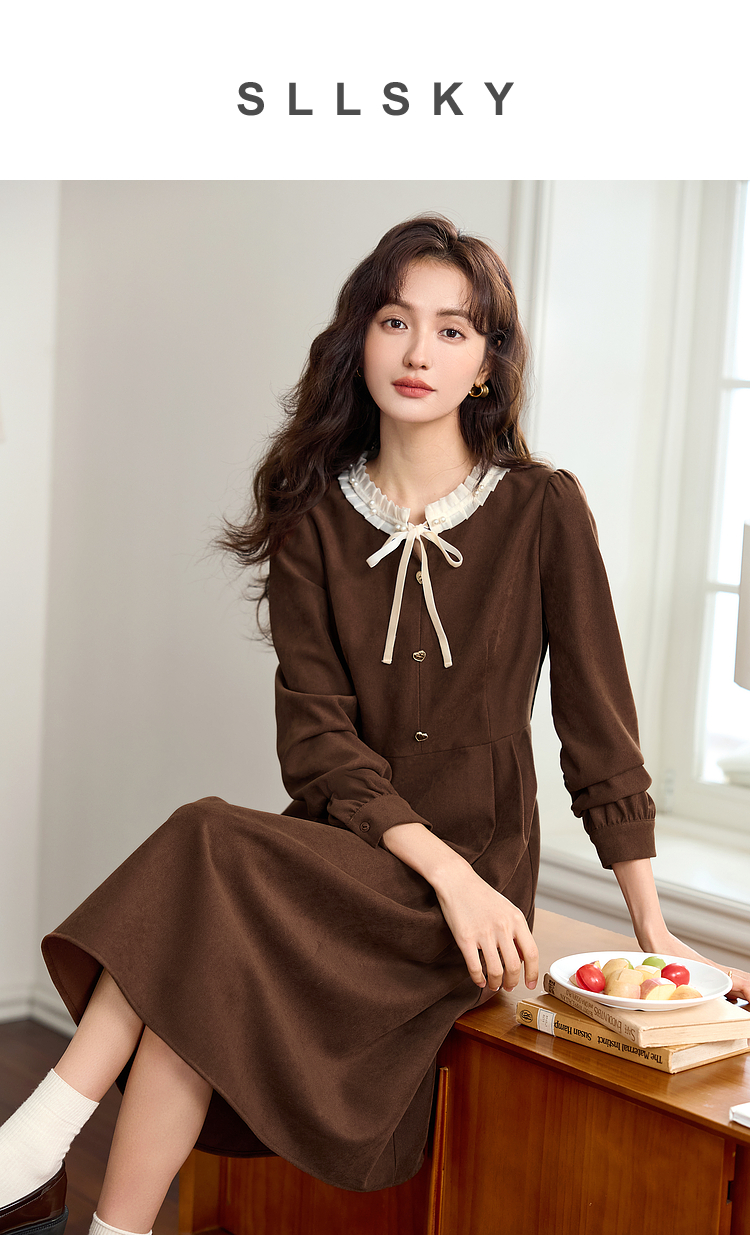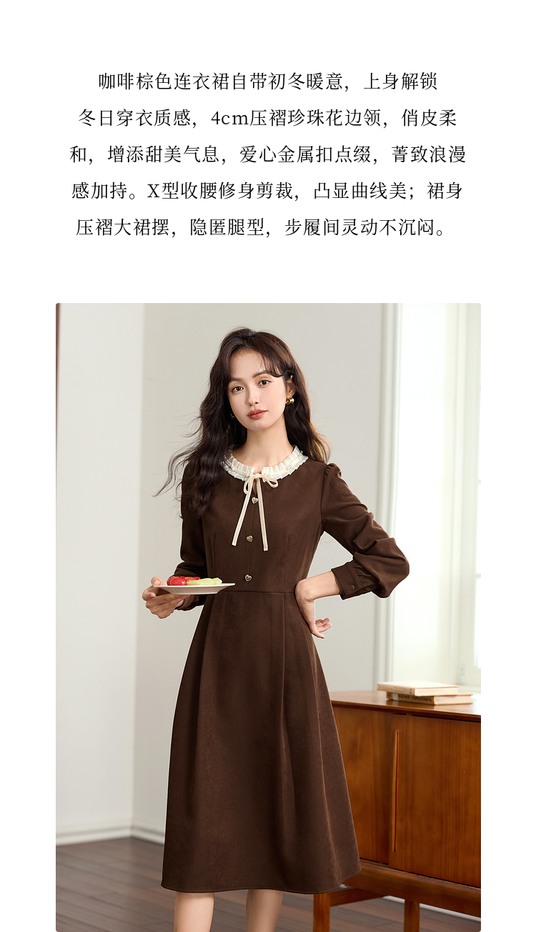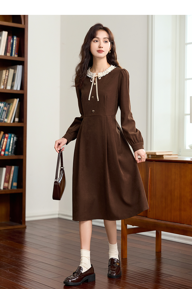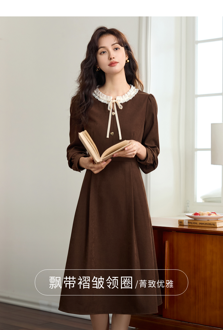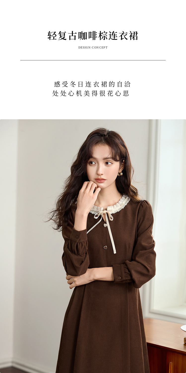 【专属特价】熙世界复古棕色磨毛连衣裙长袖2025秋冬新款气质美拉德穿搭裙子