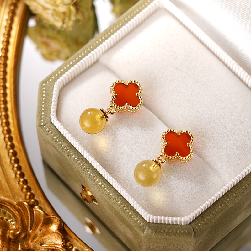 子佩集S925银【晨华】耳钉【DSE704】纯银琥珀蓝珀镀金四叶草2405