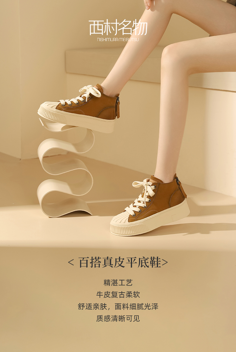 西村名物2023秋季新品百搭真皮平底单鞋学院休闲厚底贝壳头X23DS35521