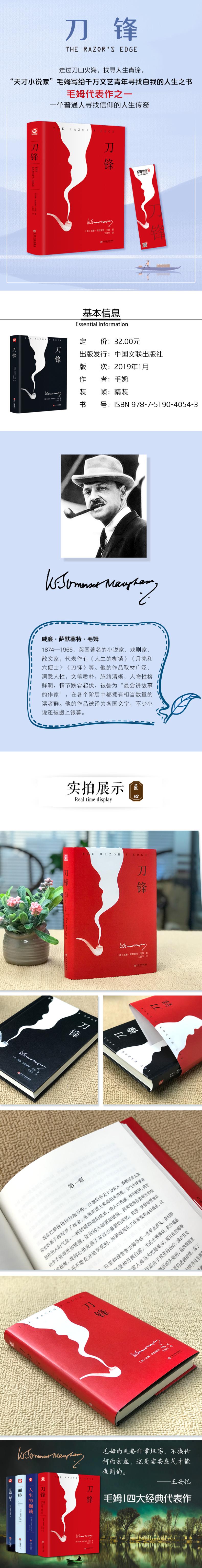 《刀锋》通过书写一名青年对人生意义的漫长探索,描绘了一战以后西方世界的生活百态,从美国到欧洲、印度,从巴黎、伦敦到芝加哥、纽约,从城市到海滨,从乡村到煤矿,从上流社会到社会底层,作者在广阔的地域空间中展现了当时人们的生存图景。小说发表后之所以能畅销美国,流行世界,是因为它反映了战后社会的普遍心理,特别是青年的迷惘情绪,再加上毛姆老道圆熟、技高一筹的讲述故事的技巧和才能,使得《刀锋》的故事情节引人入胜。