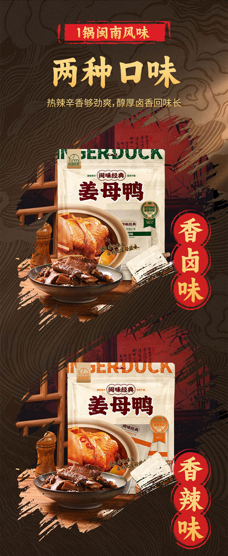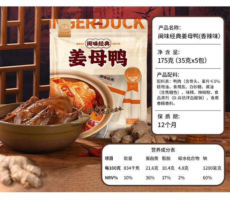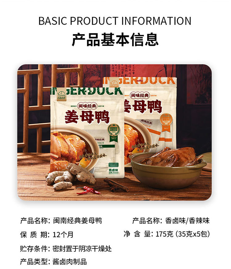 【闽味经典❗卤香/辣味姜母鸭】采用传统烹饪工艺制作,精选厦门正宗姜母鸭,肉质鲜嫩,姜香浓郁,开袋即食姜母鸭,旅游节庆闽南伴手礼L