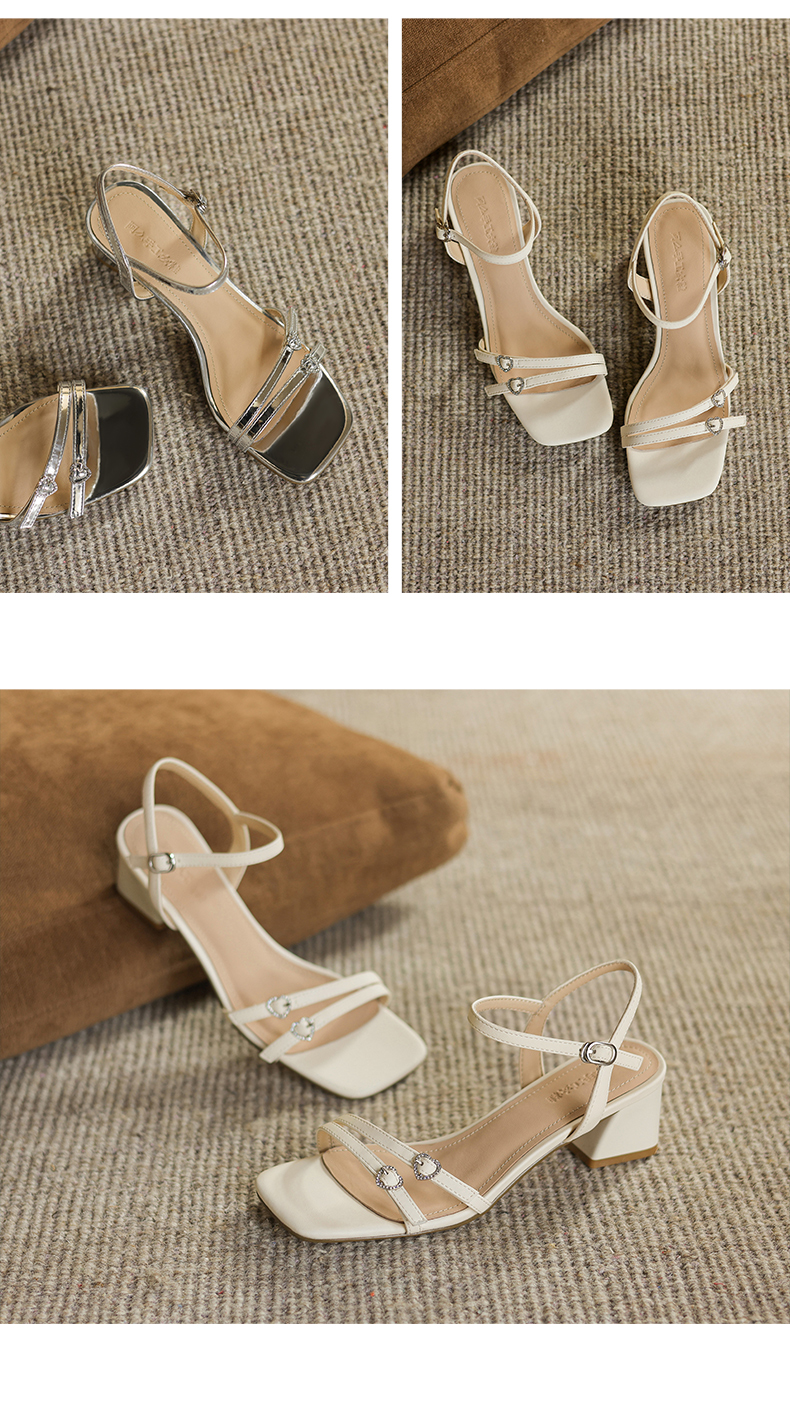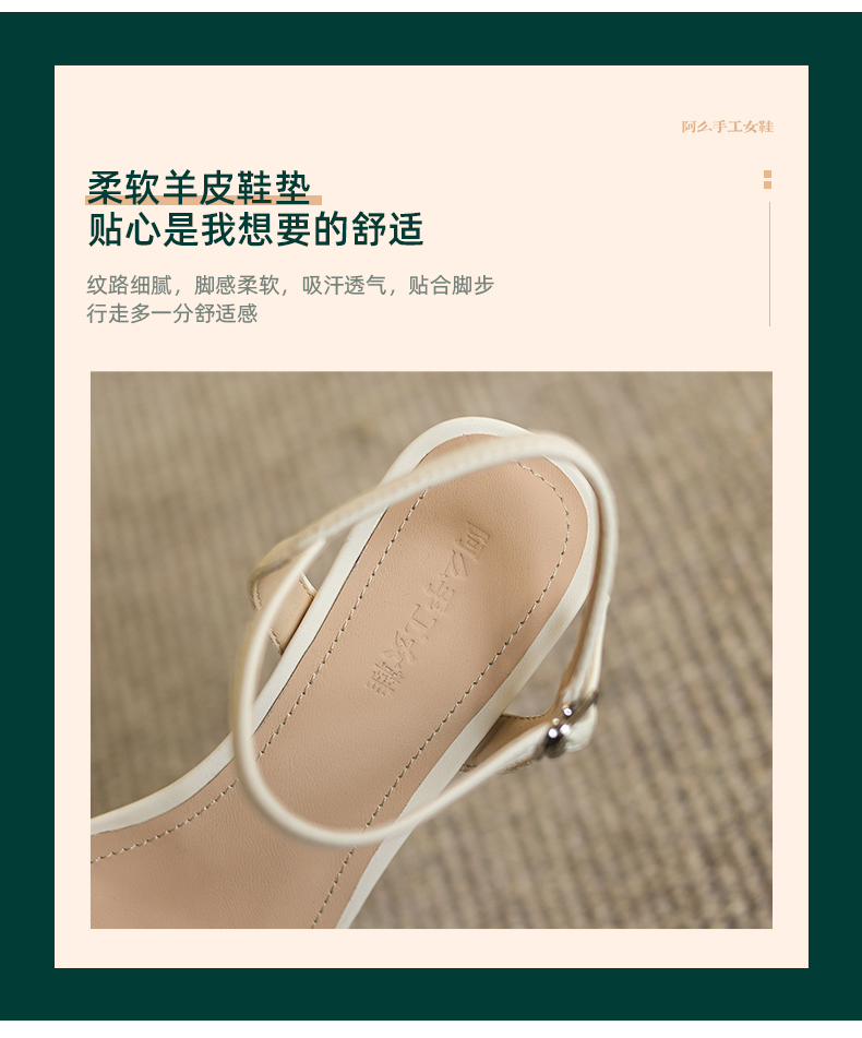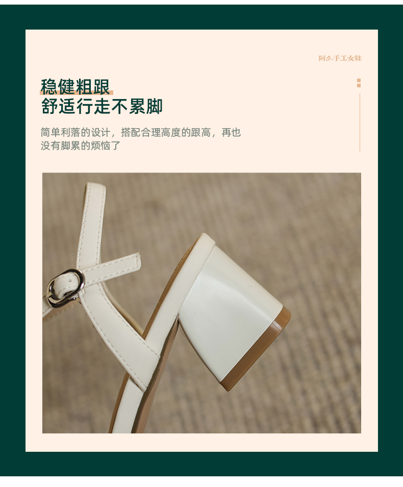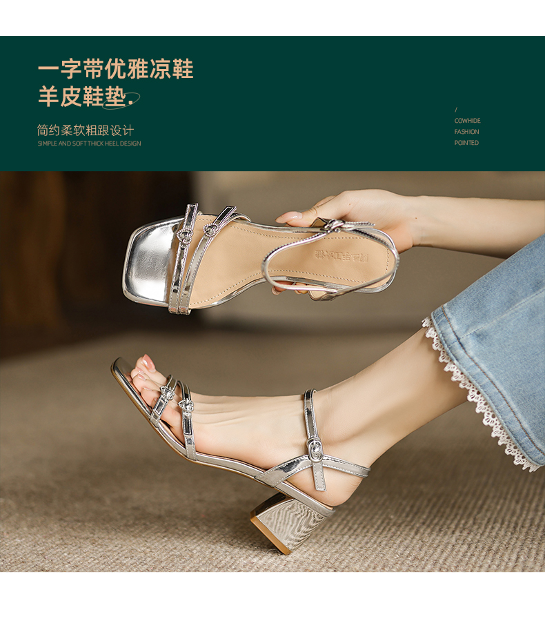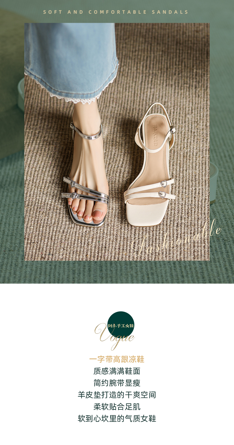 阿么手工女鞋方头仙女风一字带凉鞋不累脚夏季银色百搭中跟4.8CM