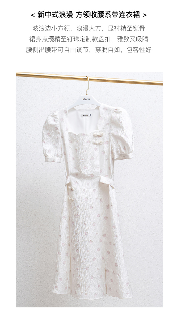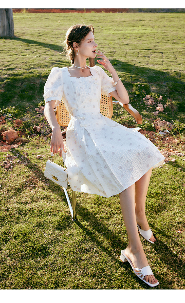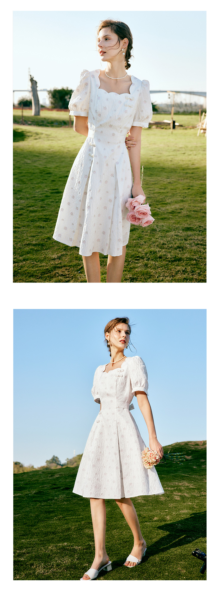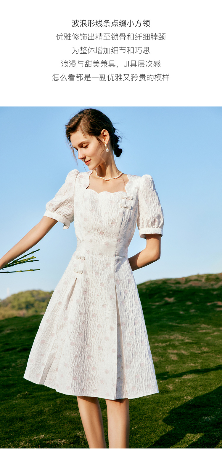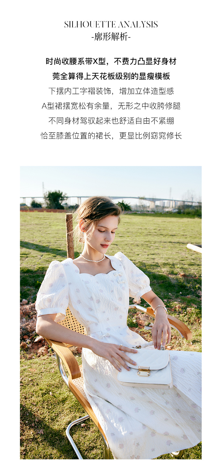 OLrain法式高级穿搭白色方领连衣裙女夏2022新款气质提花短袖裙子