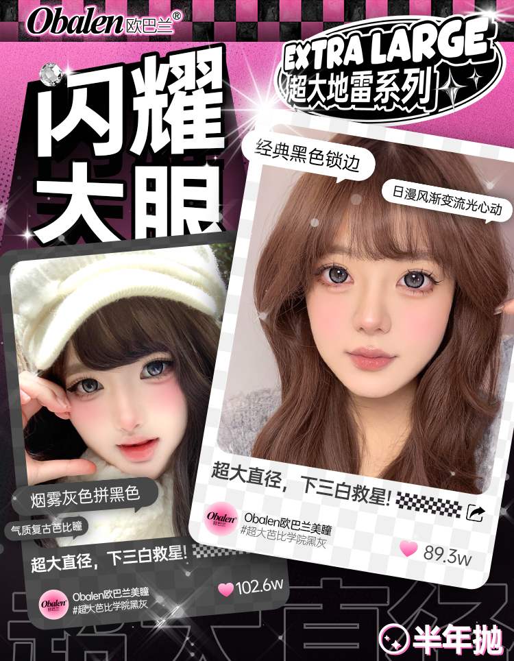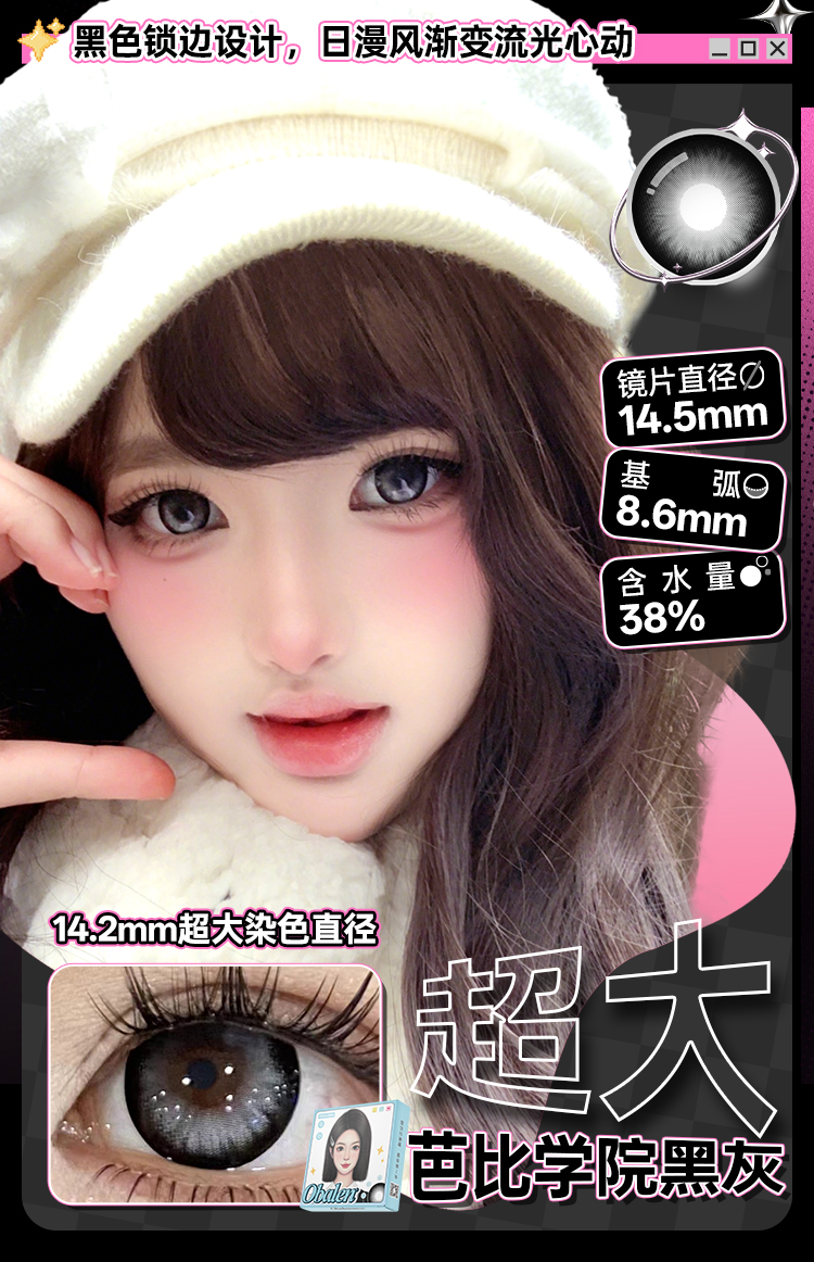 新品【超大地雷方盒系列】超大芭比学院黑灰14.5【买即送护理液】Obalen欧巴兰无感扩瞳漫画大眼半年抛2片装