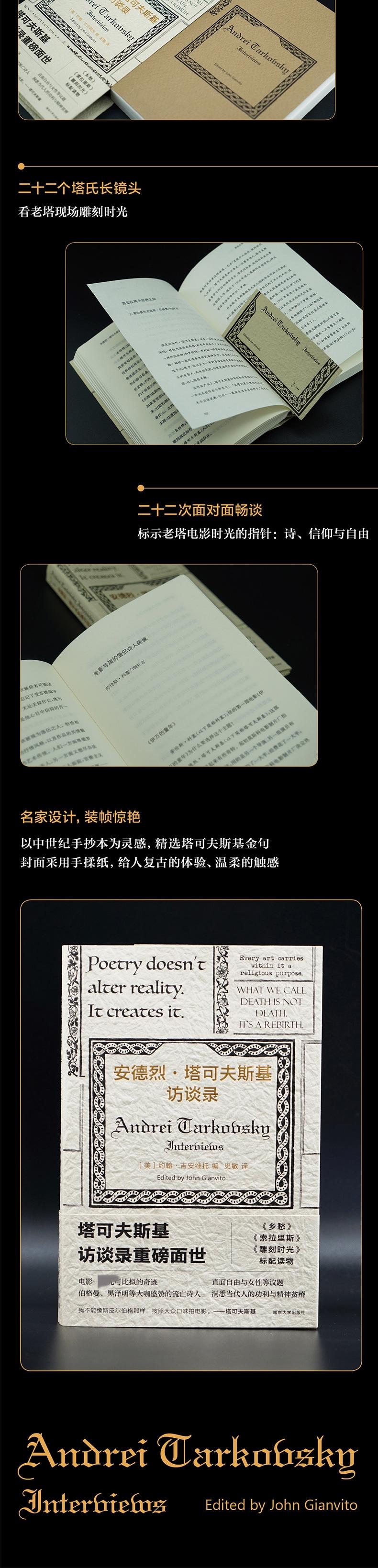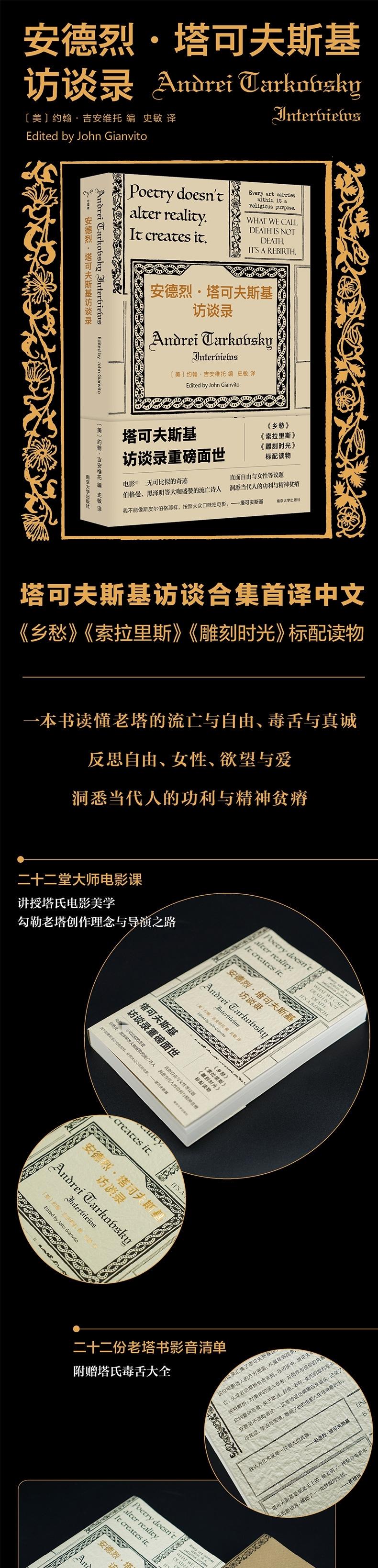 ★安德烈·塔可夫斯基访谈合集首译中文,《乡愁》《索拉里斯》《雕刻时光》标配读物,精选二十二篇重要访谈。 ★他是电影目前无可比拟的奇迹、神秘的流亡诗人,伯格曼、黑泽明等大咖一致盛赞。 ★傲慢、毒舌、真诚;直击社会热点议题——自由、女性、欲望、爱、政治、金钱、大众娱乐;透视当代人的生存境况,鞭挞功利主义与精神贫瘠。 ★“我是一个被禁的导演,这会引起观众的好奇。” ★二十二堂大师电影课,讲授塔氏电影美学,勾勒老塔创作理念与导演之路。 听老塔亲自解析电影:讲述简单爱情故事的《乡愁》、被取消戛纳参评资格的《安德烈·卢布廖夫》、曾被莱姆叫停的《索拉里斯》…… 跟老塔学拍电影:电影触摸时间的流逝,艺术承载宗教的意图;拍电影要用朴素的语言,不能远离现实,不能把观众当傻瓜,不能装腔作势,不能财迷心窍;看电影时不要思考意义,否则会毁了电影…… ★二十二份老塔书影音清单,附赠塔氏毒舌大全。 黑泽明、安东尼奥尼、伯格曼、布努埃尔、杜辅仁科、费里尼;莎士比亚、陀思妥耶夫斯基、黑塞、海明威、莱姆、果戈里;巴赫、贝多芬、瓦格纳…… 记者:“喜欢你电影的人,也是斯皮尔伯格科幻小说的粉丝。” 老塔:“你完全不知道自己在说什么。斯皮尔伯格、塔可夫斯基……这些对你来说都是一样的。大错特错!”“流行艺术不伦不类。” ★二十二个塔氏长镜头,看老塔现场雕刻时光。 童年时父母的争吵、关于战争的梦境、被称“女巫”的妻子、被迫流亡的愤懑;对精神与信仰的追求、对功名利禄的不屑、对娱乐至死的批判、对女性和爱的争议性看法…… ★二十二次面对面畅谈,标示老塔电影时光的指针:诗、信仰与自由。 ★装帧由屡获“中国好看的书”殊荣的知名设计师周伟伟精心打造,以中世纪手抄本为灵感,精选塔可夫斯基金句,封面采用手揉纸,给人复古的体验、温柔的触感。