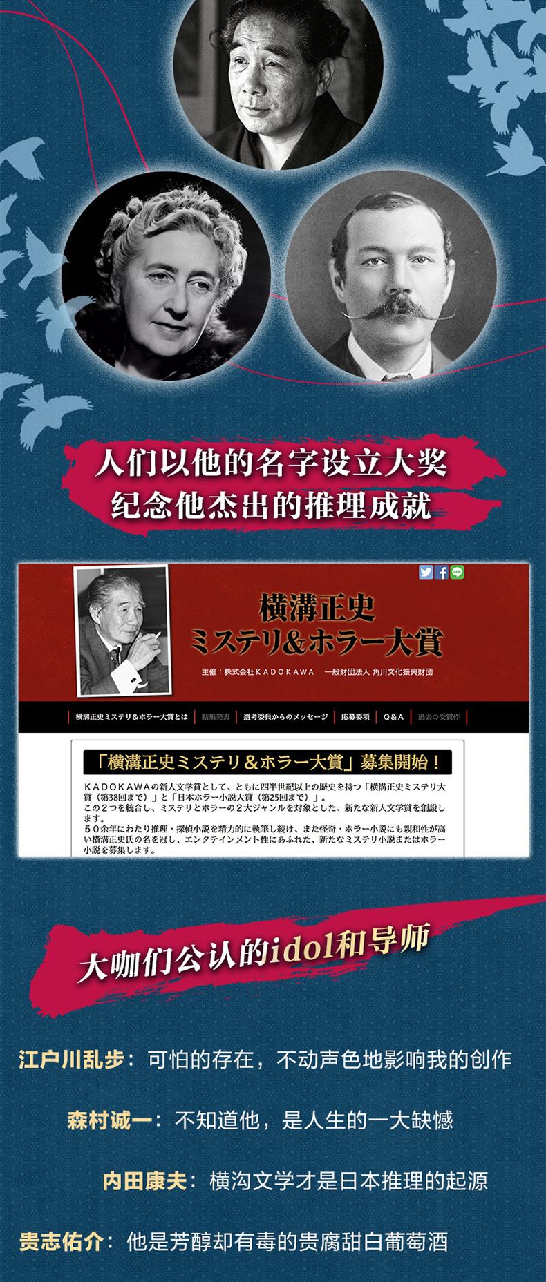 金田一耕助是横沟正史笔下经典的侦探形象,也是日本家喻户晓的名侦探。在以他为主角的系列推理小说《金田一探案集》中,横沟正史以写实的手法构造奇诡案件,融合推理小说的典型要素和日本社会特有的人情风俗,将日本推理小说的水平提升到了新高度。
