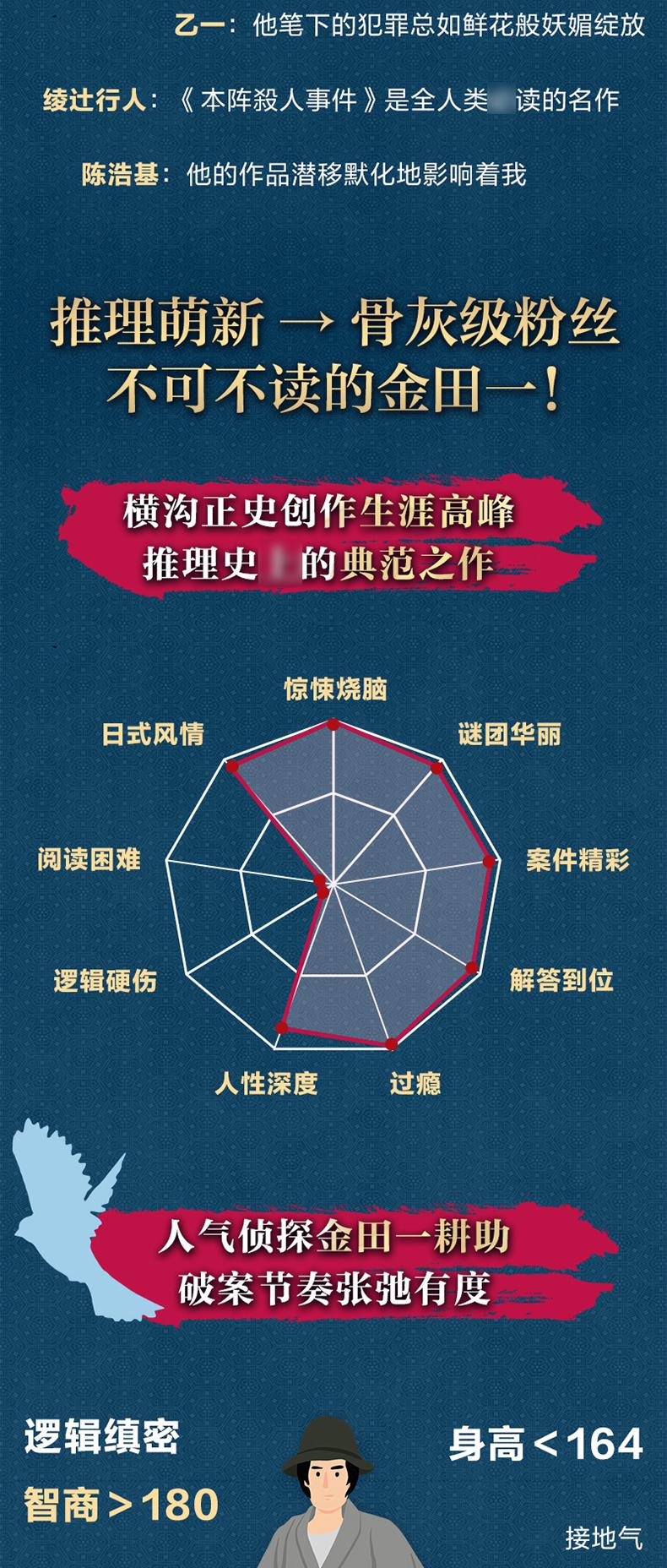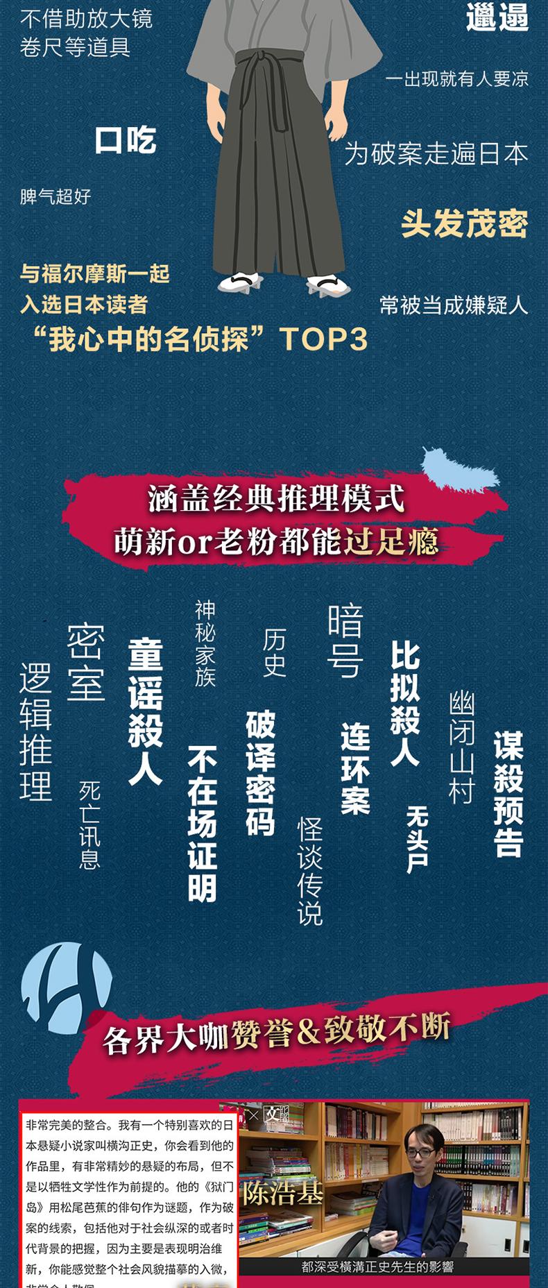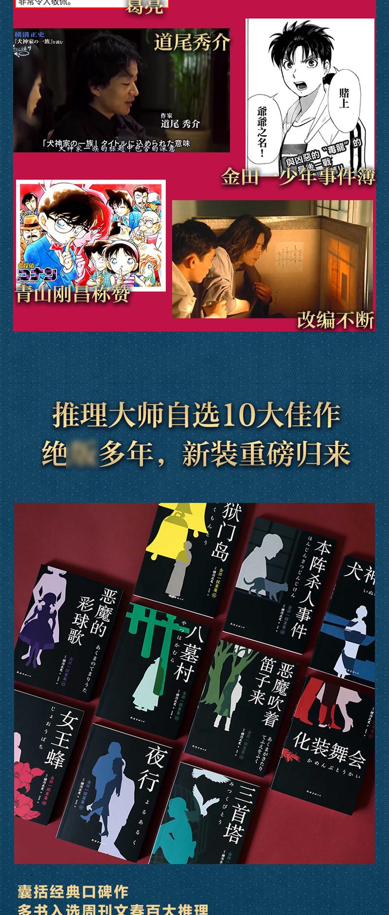 《金田一探案集》是日本推理泰斗横沟正史的代表作合集,共10册。《金田一探案集》收录横沟正史自选10大佳作,包括《狱门岛》《本阵殺人事件》《犬神家族》《恶魔的彩球歌》《八墓村》《恶魔吹着笛子来》《化装舞会》《三首塔》《女王蜂》《夜行》。
