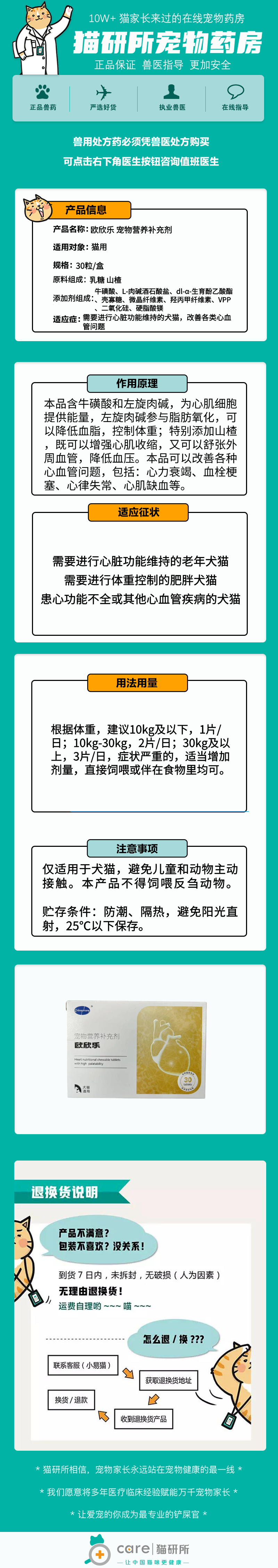 猫研所 欧欣乐宠物营养补充剂 30粒/盒 含牛磺酸及左旋肉碱 改善各种心血管问题