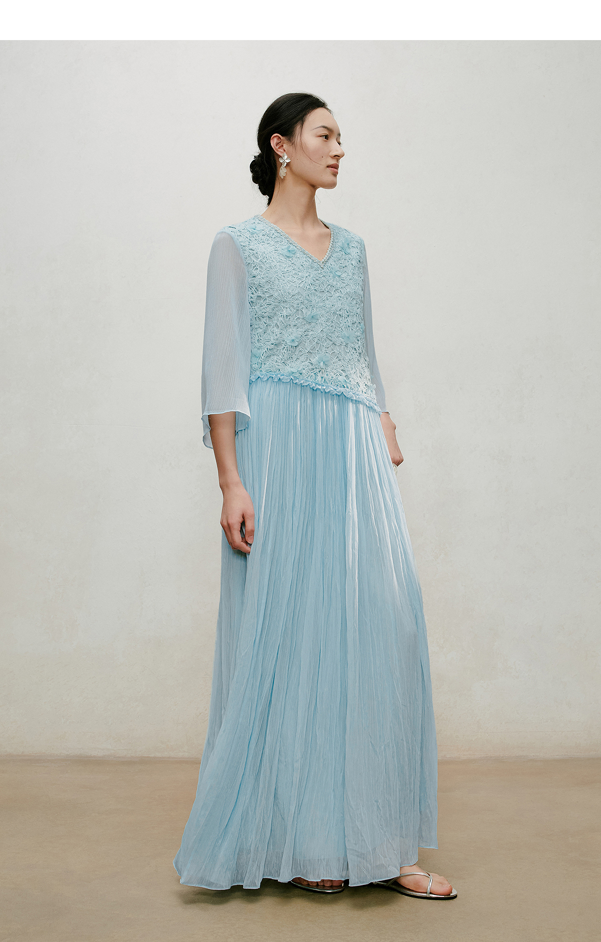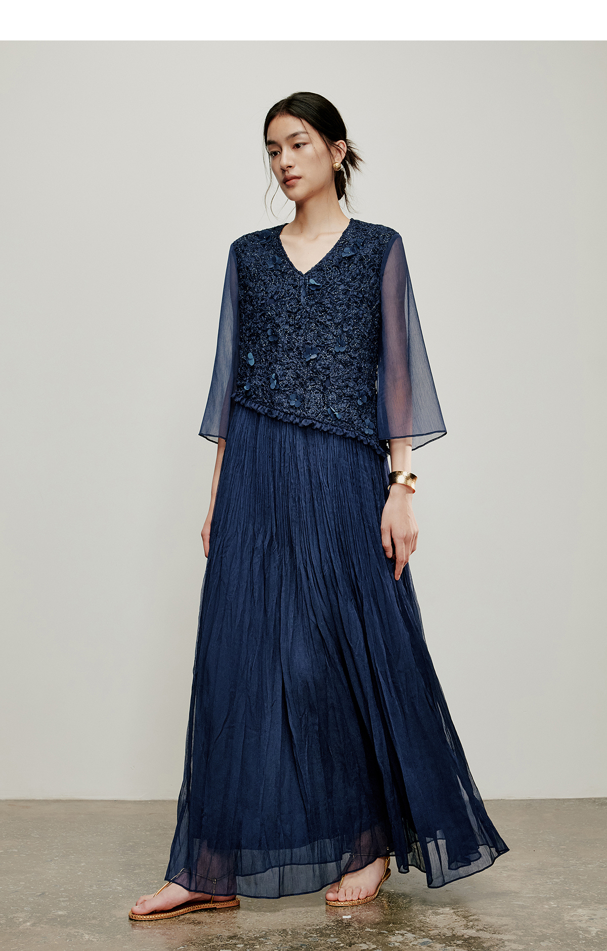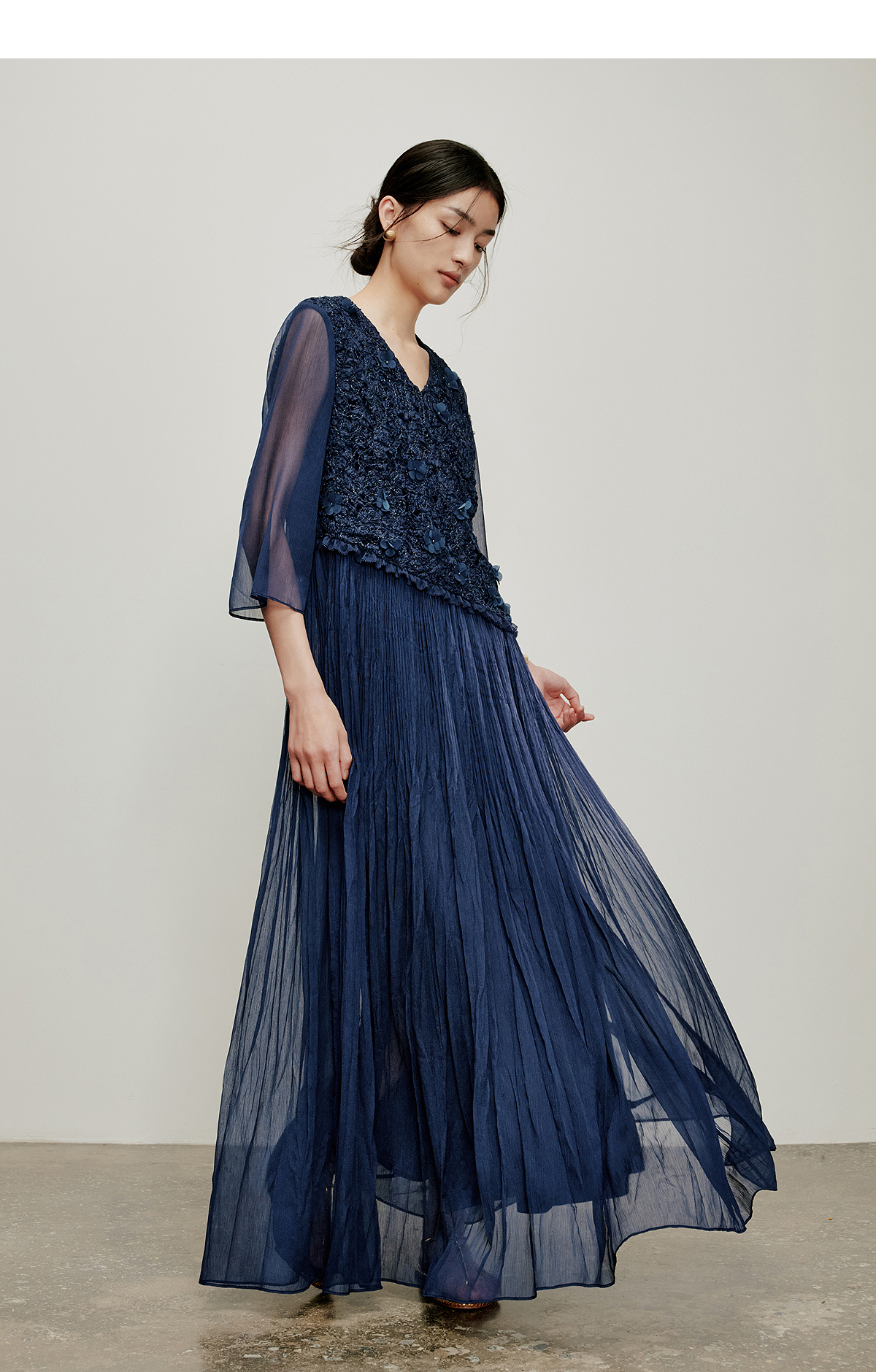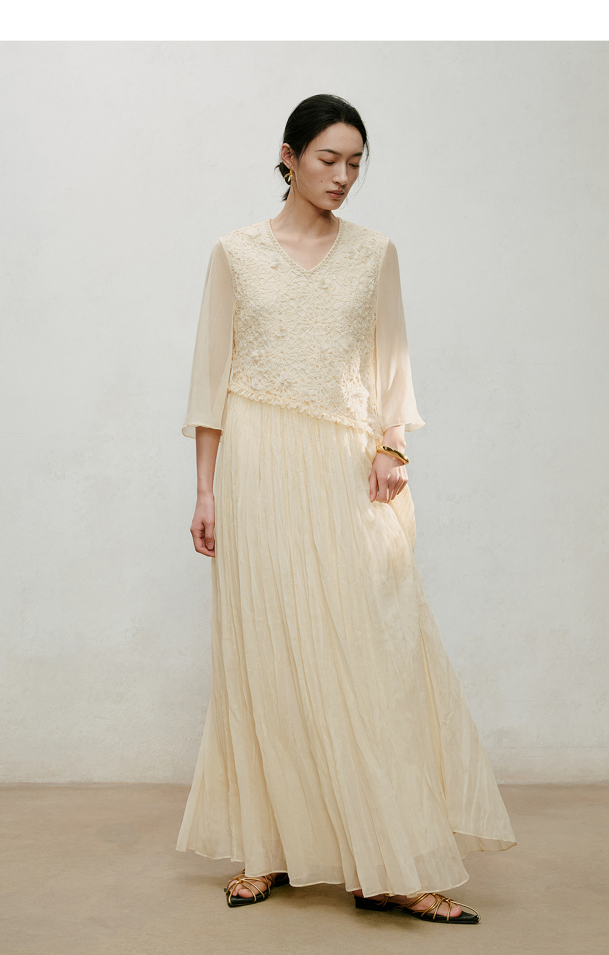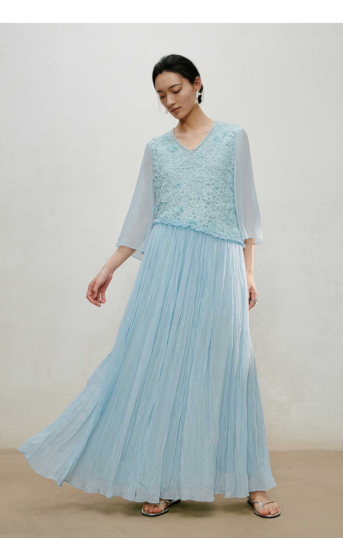 【林栖设计小店】手工钉花|优雅多色刺绣蕾丝宽松2026夏新款百褶连衣裙1962134