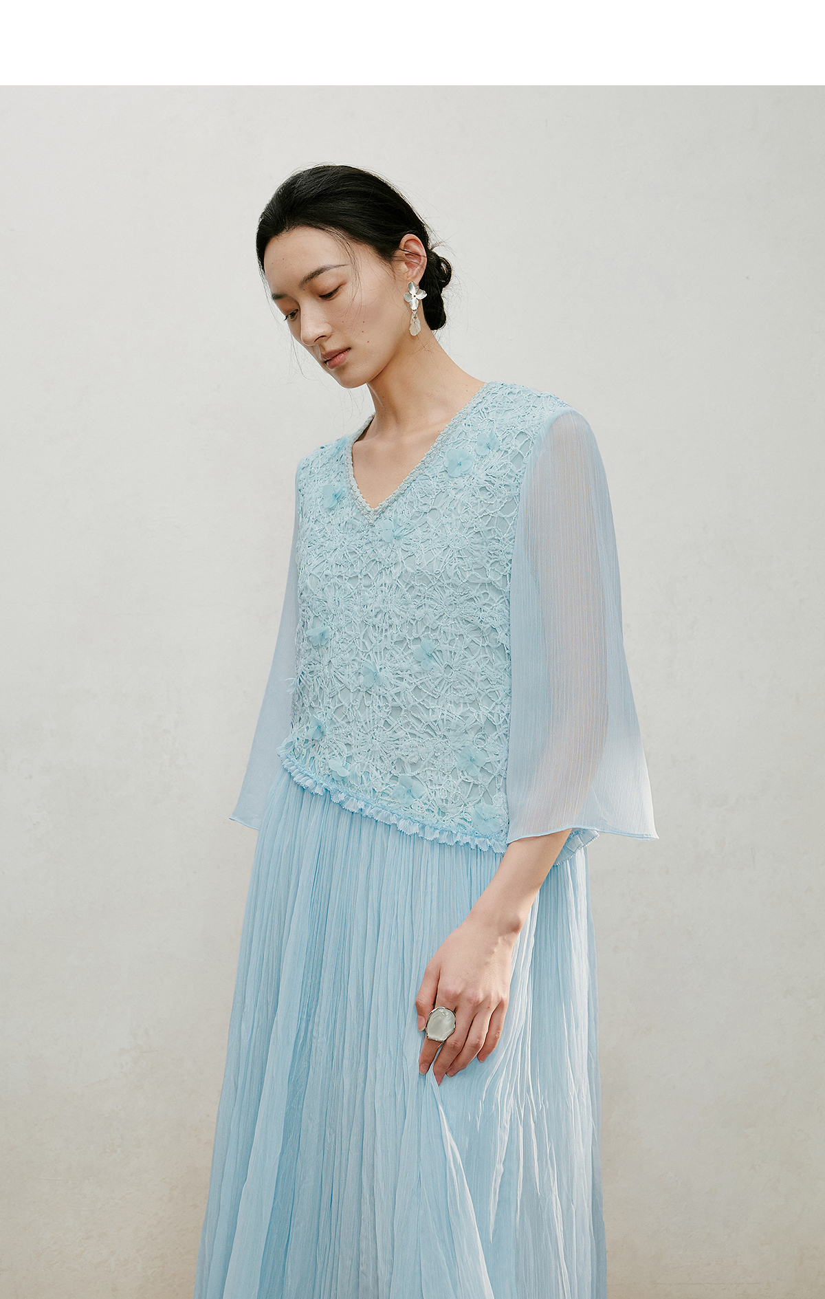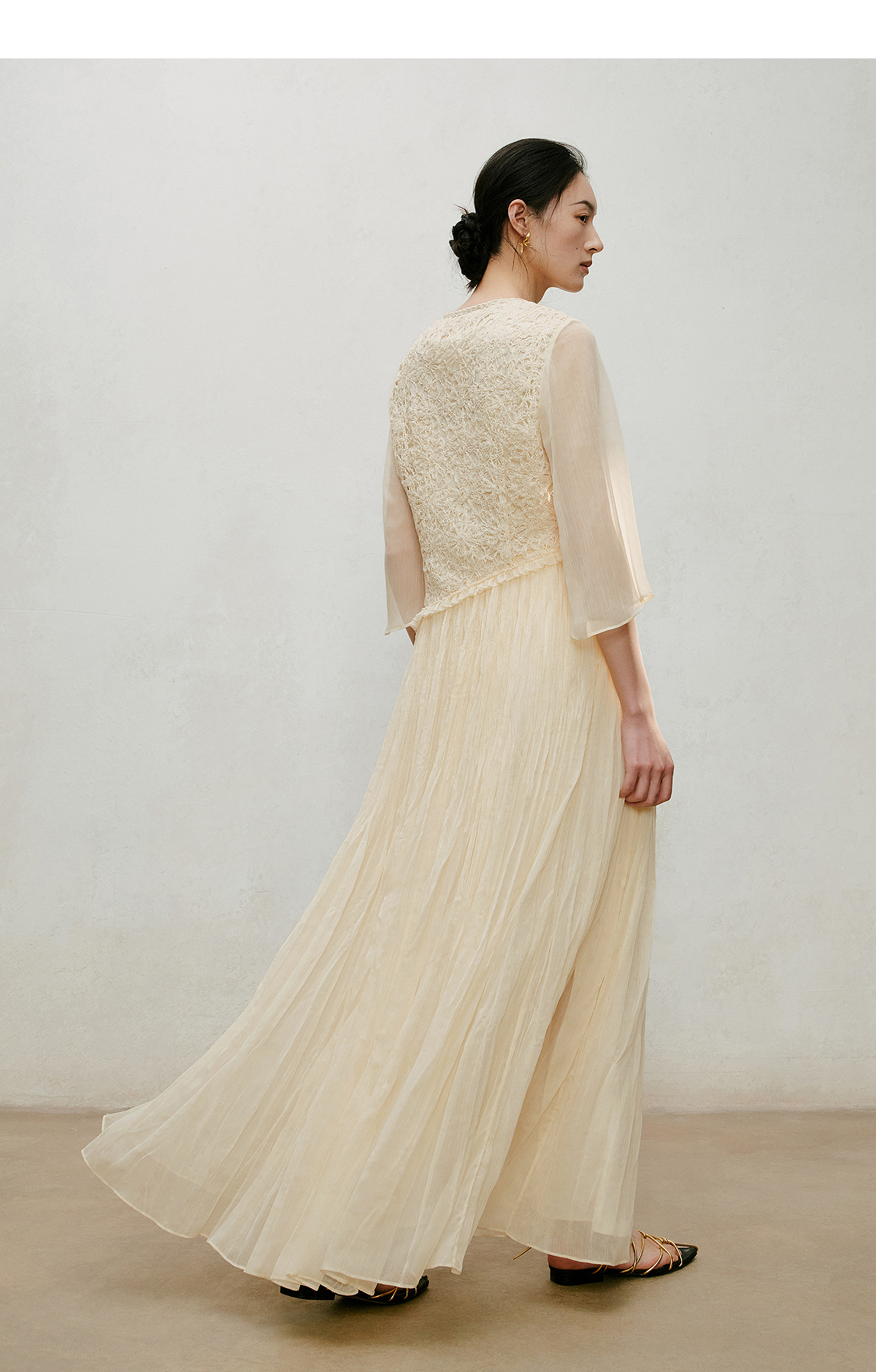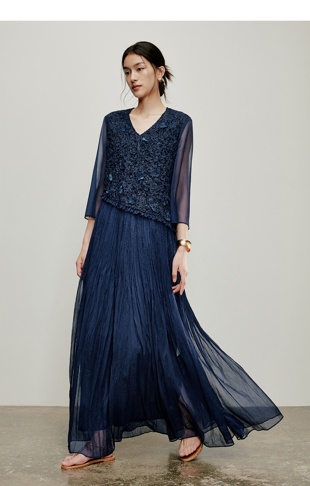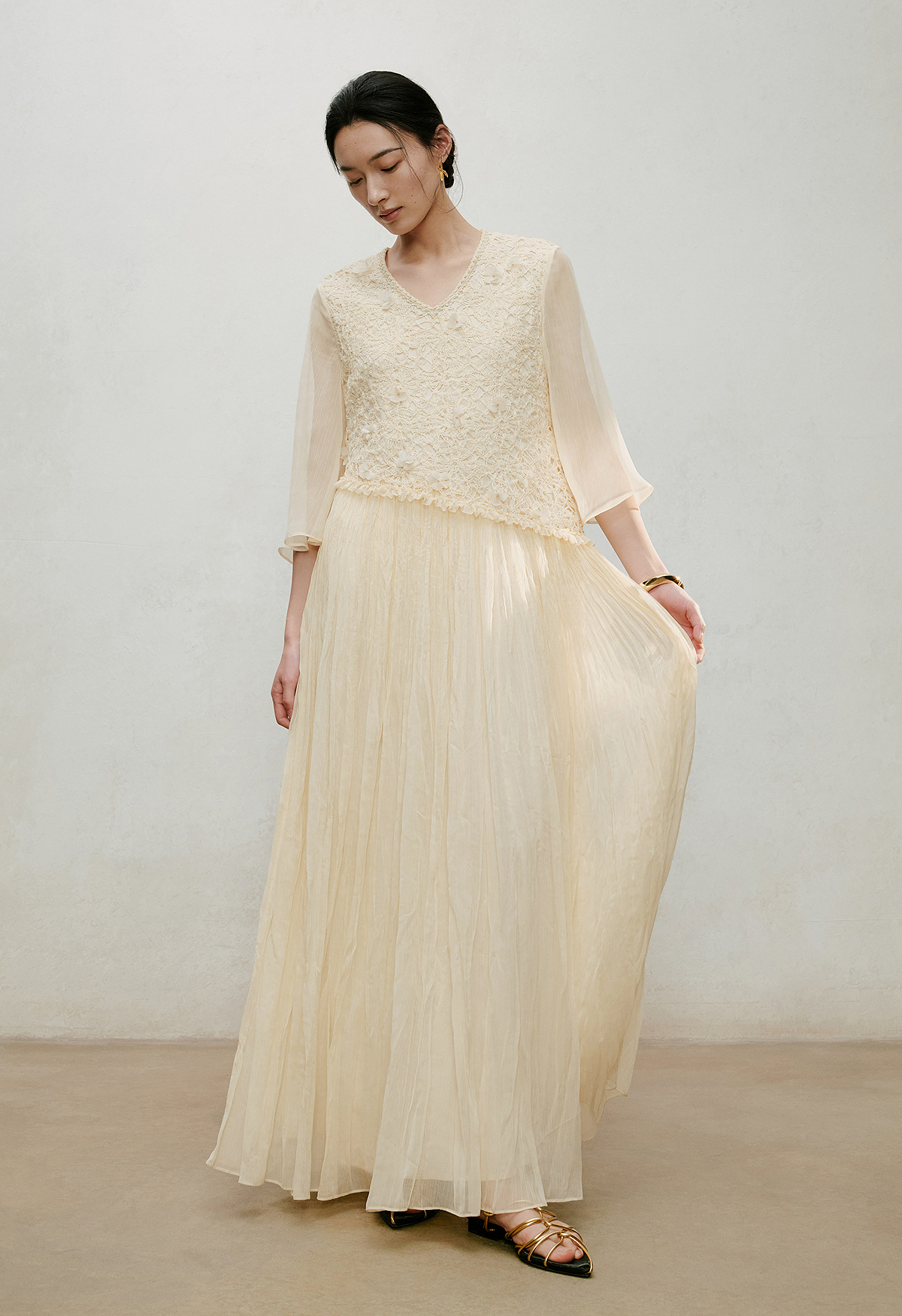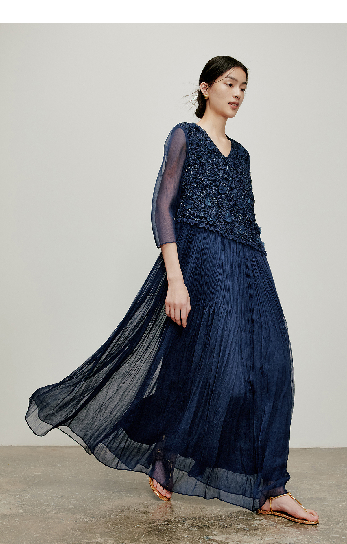 【林栖设计小店】手工钉花|优雅多色刺绣蕾丝宽松2026夏新款百褶连衣裙1962134