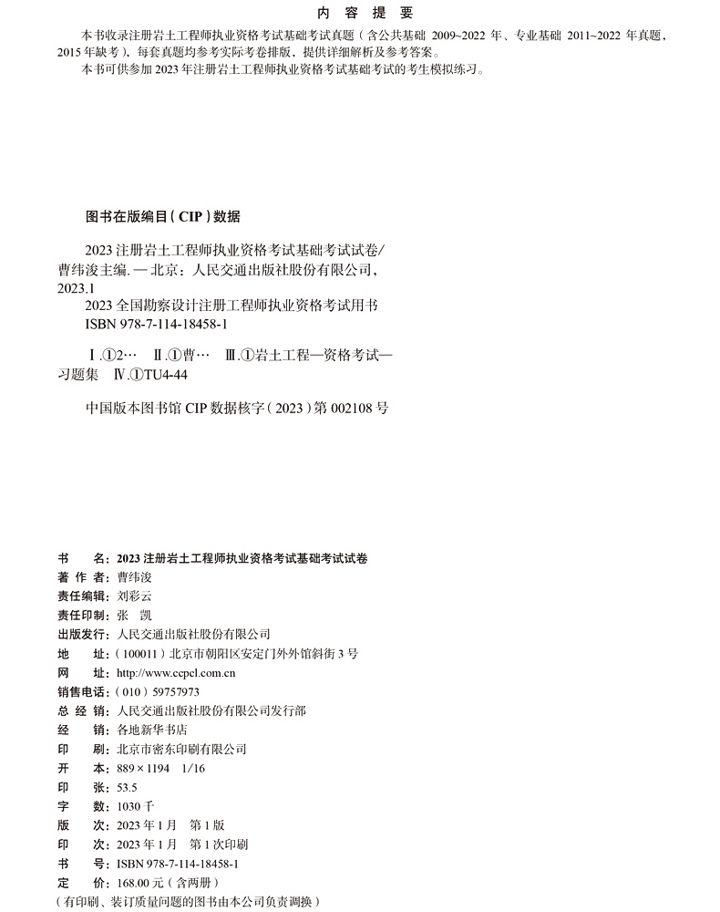 书名:2023注册岩土工程师执业资格考试基础考试试卷