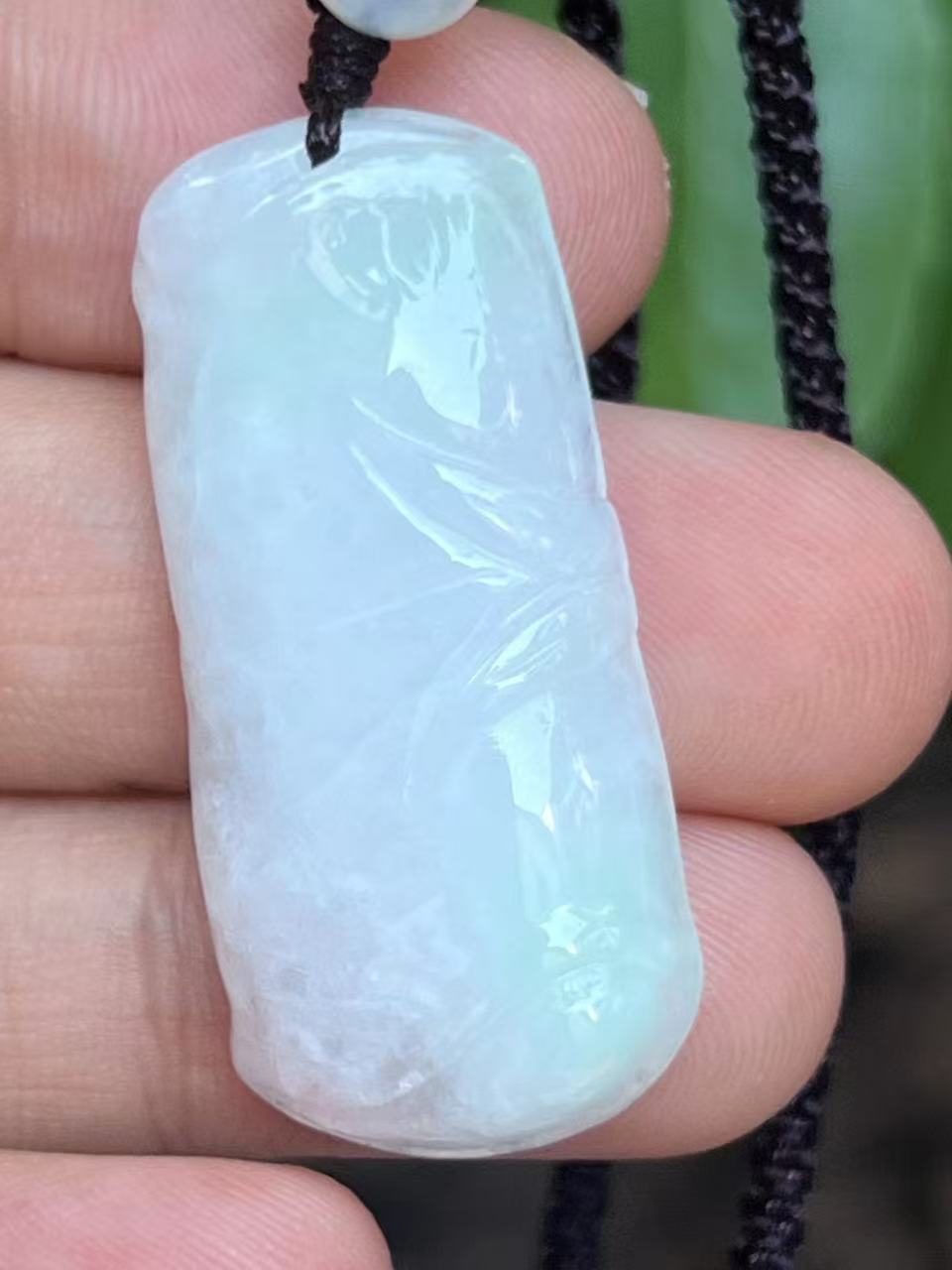 这一手是白底青的料子,也是我们几千件翡翠中唯一的欧白底青。白底青是一种以白色为底色,带有绿色的翡翠。千金难买一抹绿,白底青要的就是这一抹绿,非常吸睛~
