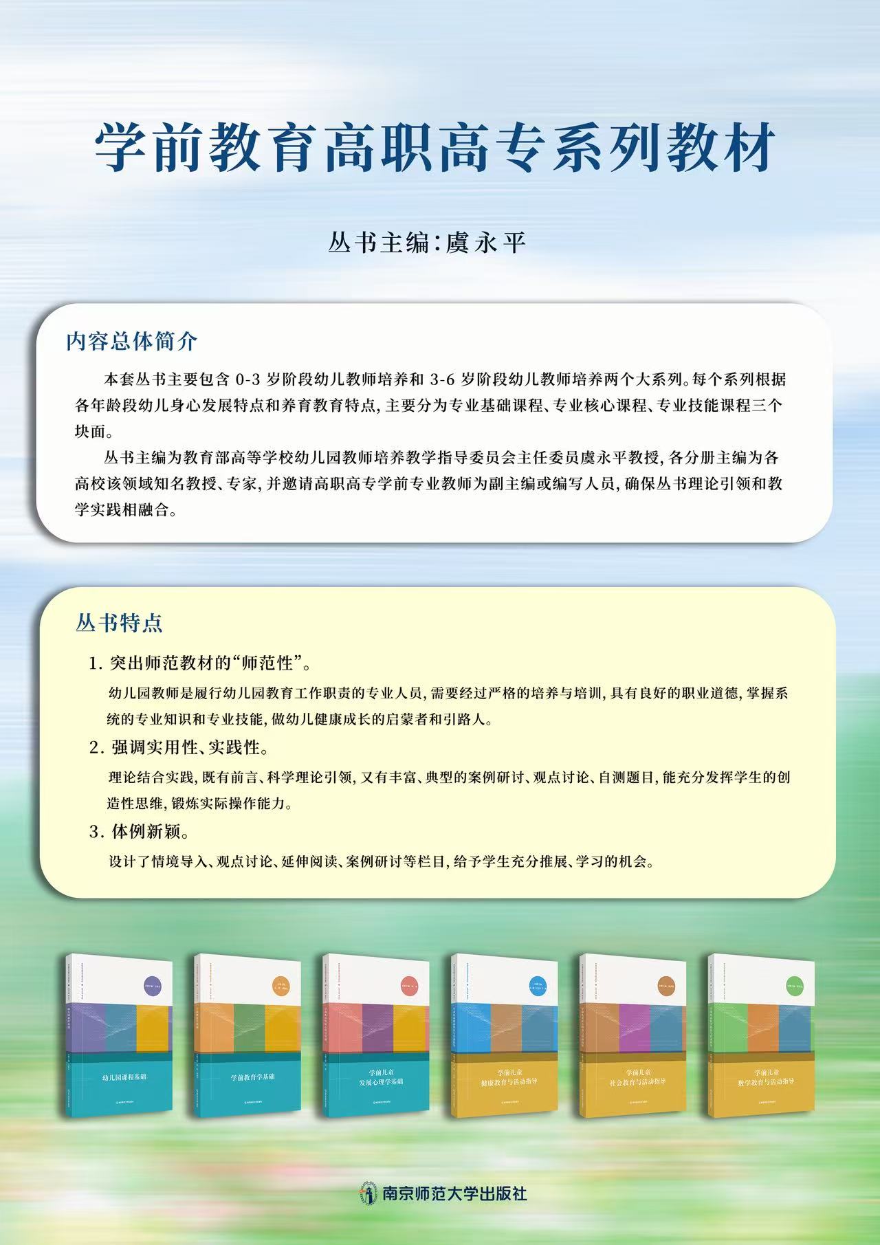 教材编写秉持“科学性与实践性并重”的编写理念,结合学生的学习特点和职业发展需求, 融合各领域前沿研究成果和优秀实践案例,力求帮助学生在掌握理论知识的同时,树立科学的儿童观、 教育观,提升教育实践能力,为走上工作岗位做好准备。