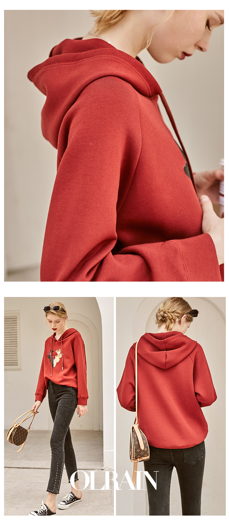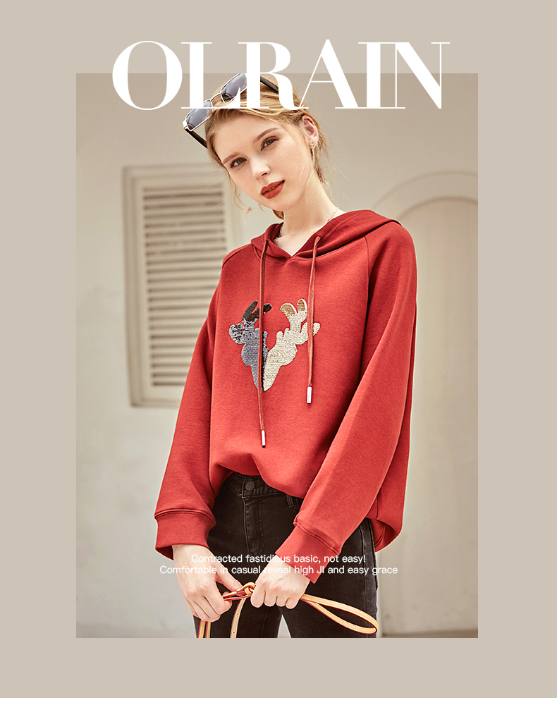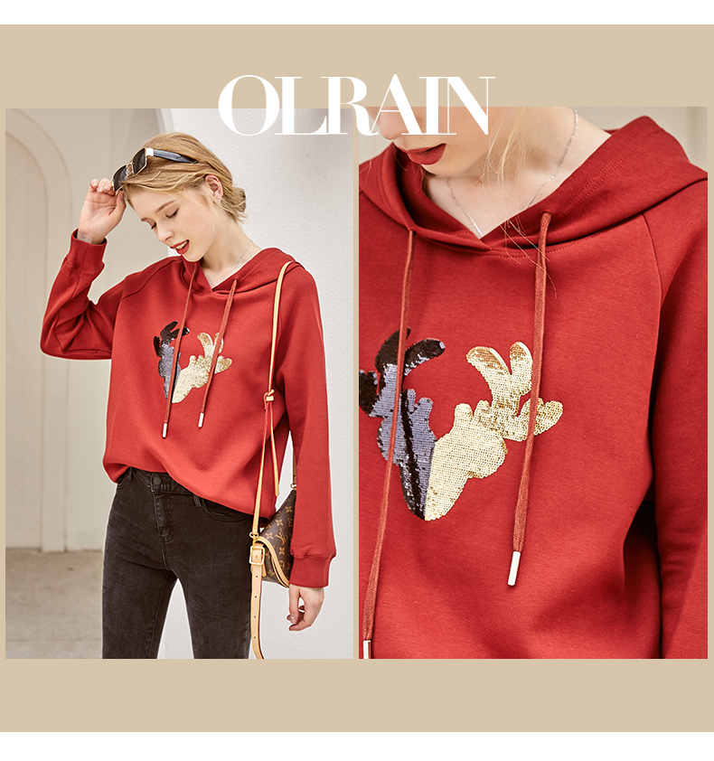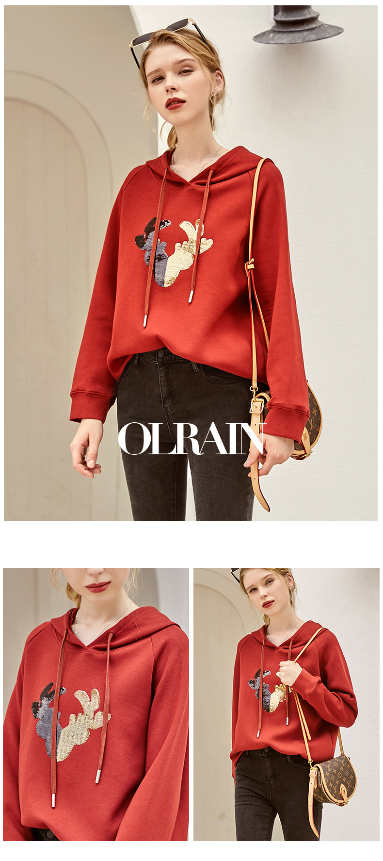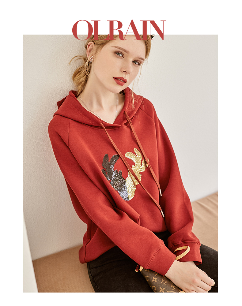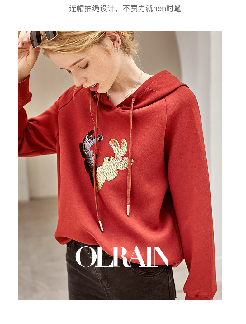 OLrain欧芮儿法式太空棉连帽卫衣女早春2023新款宽松鹿角刺绣上衣